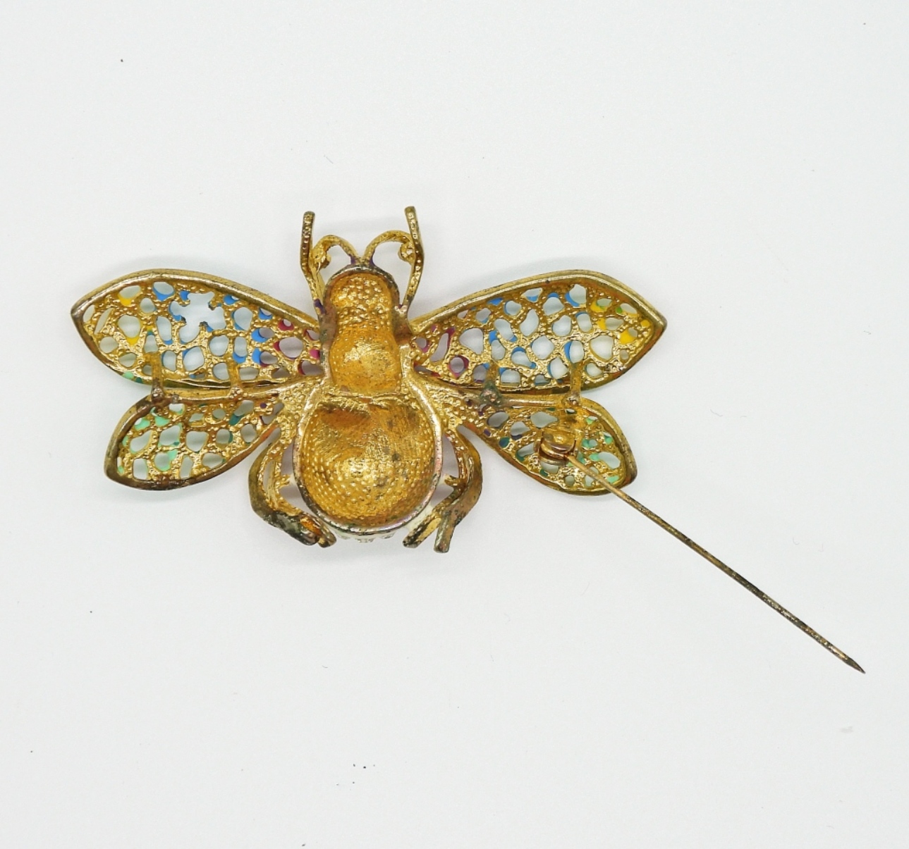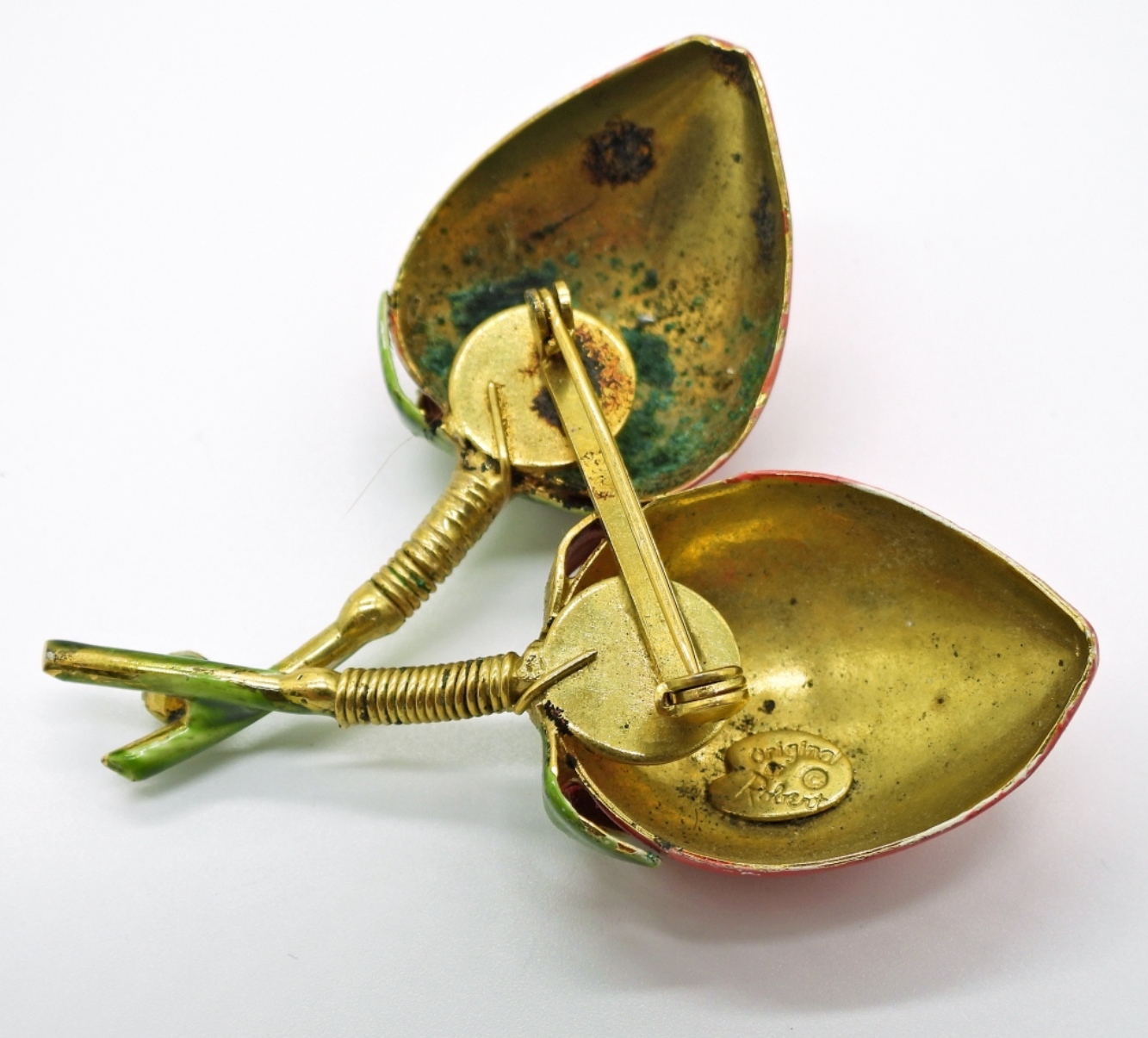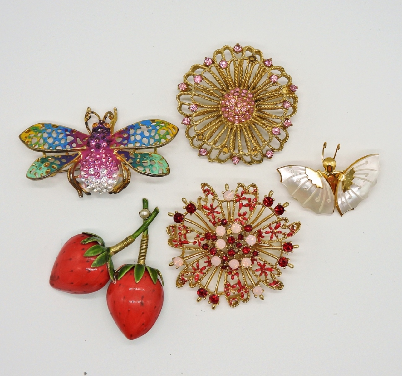 COLORFUL BUG PENDANT GOLD TONE (DOESN’T CLASP, BROKEN), 2.5″x1.5″. GOLD TONE MOTHER OF PEARL PIN. TWO GOLD TONE GEMSTONE BROOCHES, 2″. SUPER CUTE STRAWBERRY PIN, MARKED “ORIGINAL BY ROBERT”, 2″x2″.