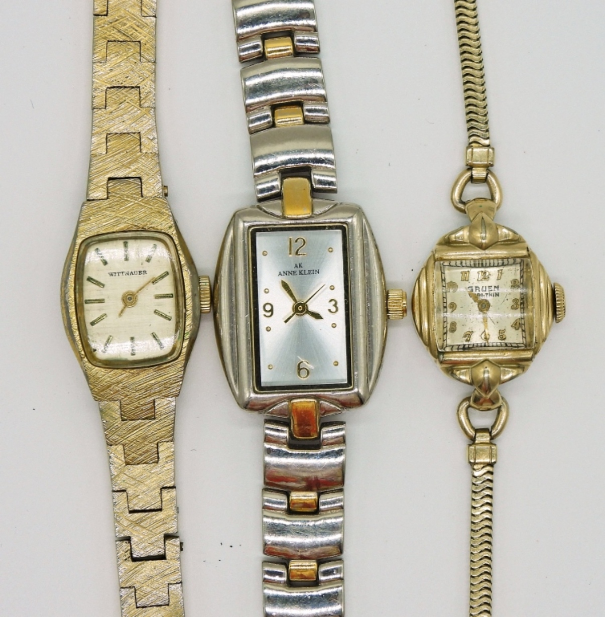 WITTNAUER GOLD TONE WATCH, GRUEN GOLD TONE WATCH, ANNE KLEIN GOLD AND SILVER TONE WATCH. NOT TESTED AS TO WORKING OR NOT.