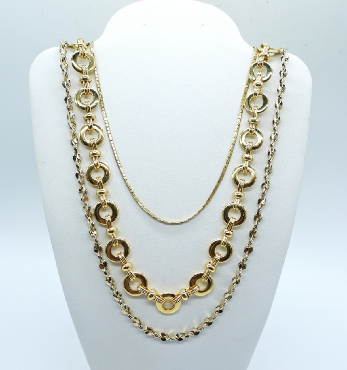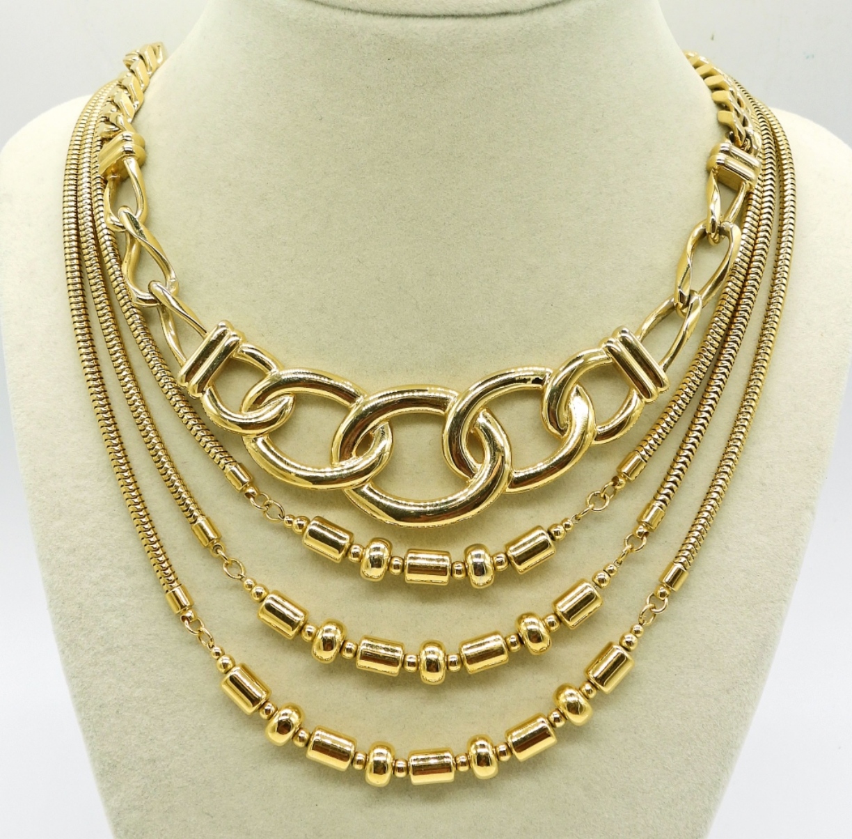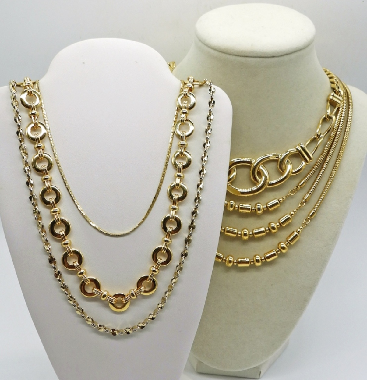 5 GOLD TONE FASHION NECKLACES. 2 ARE MONET BRAND. 29″, 26″, 15″. MONET NECKLACES ARE 18″ & 17″.