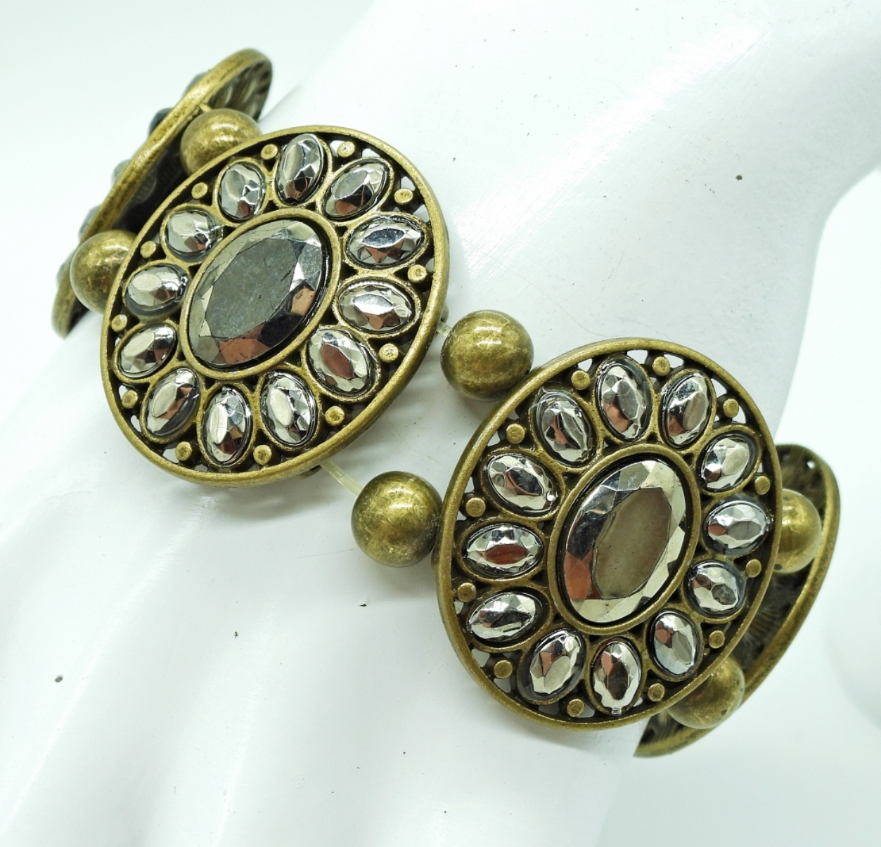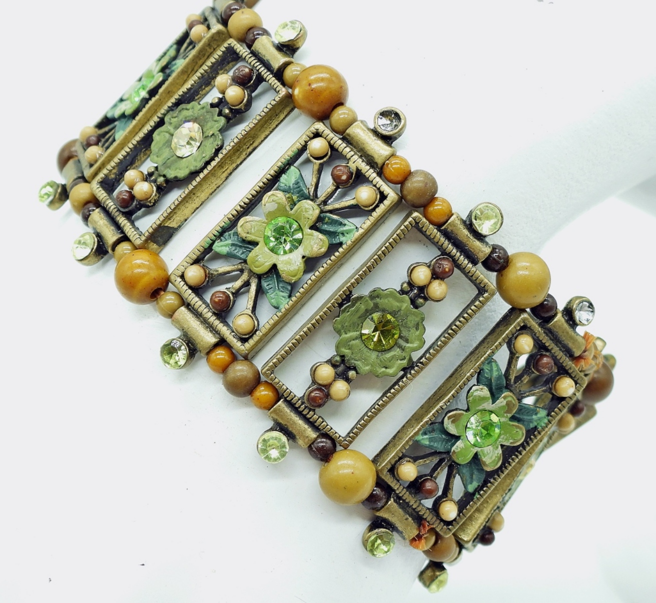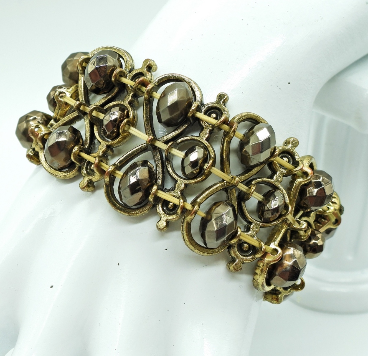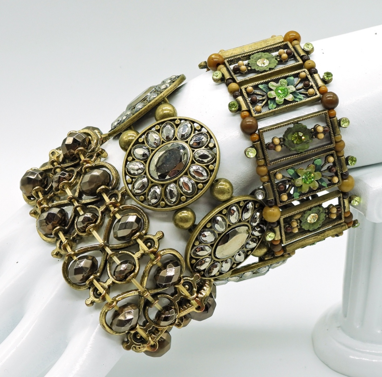 THREE BRONZE TONE STRETCHY BRACELETS WITH BEADS & GEMSTONES.
