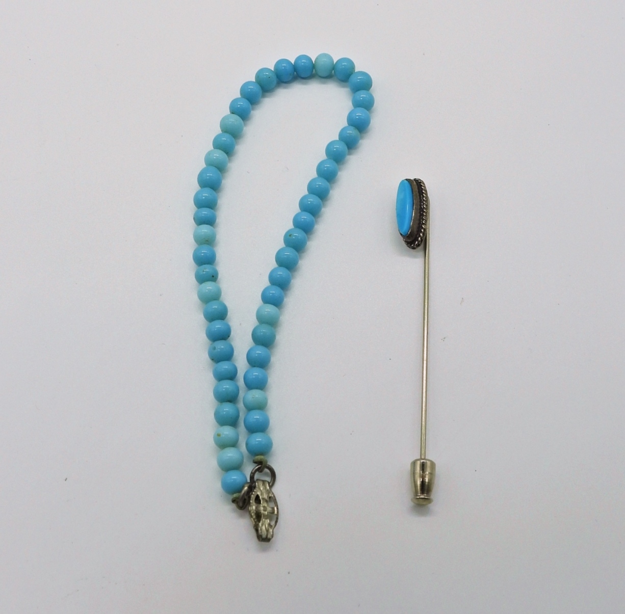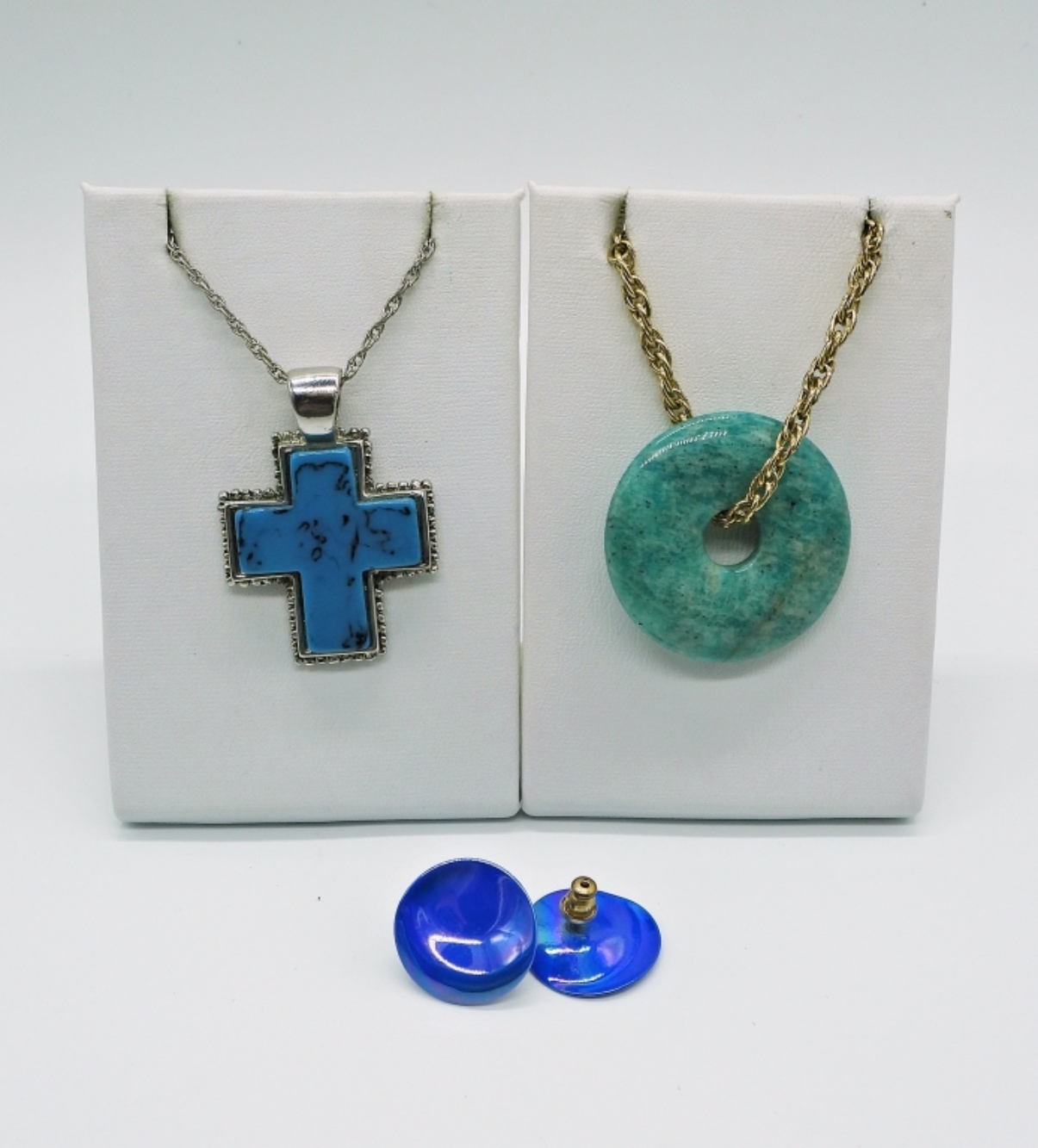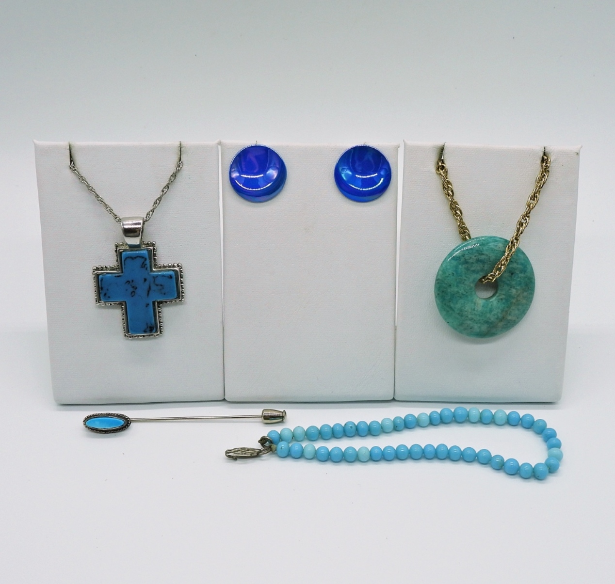 24″ GOLD TONE CHAIN WITH GEMSTONE PENDANT. 18″ SILVER TONE CHAIN WITH FAUX TURQUOISE CROSS. 8″ BLUE BEADED BRACELET. FAUX TURQUOISE STICK PIN AND VINTAGE BLUE EARRINGS.