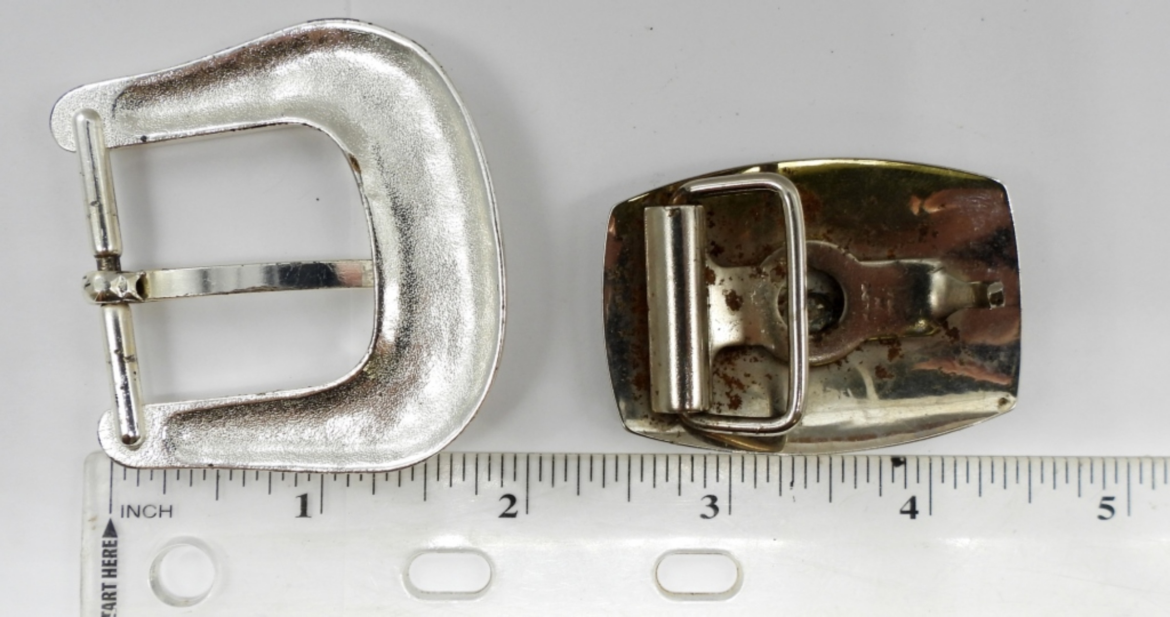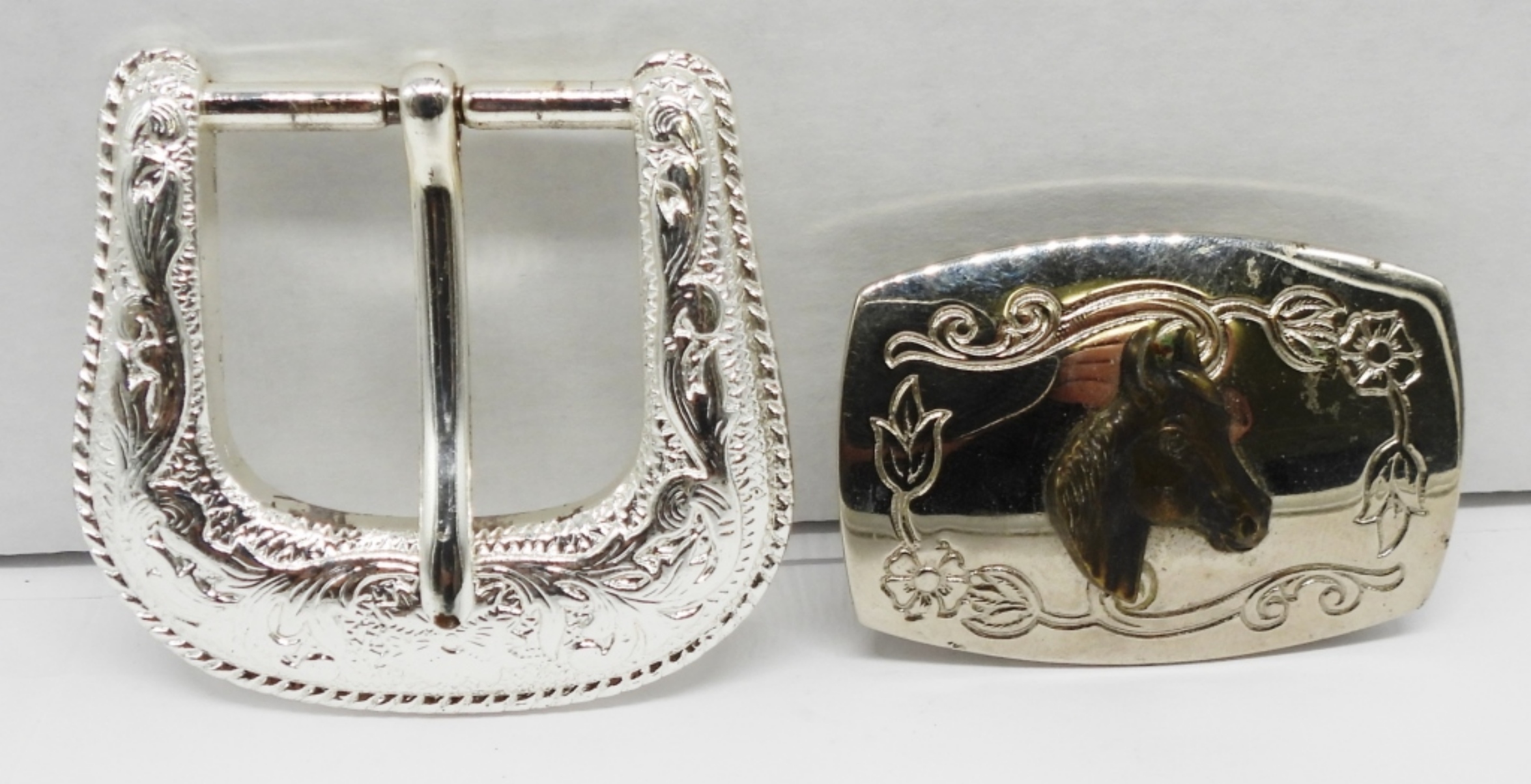 TWO SILVER TONE BELT BUCKLES. HORSE MEASURES 2″x1.5″. OTHER IS 2″x2″.