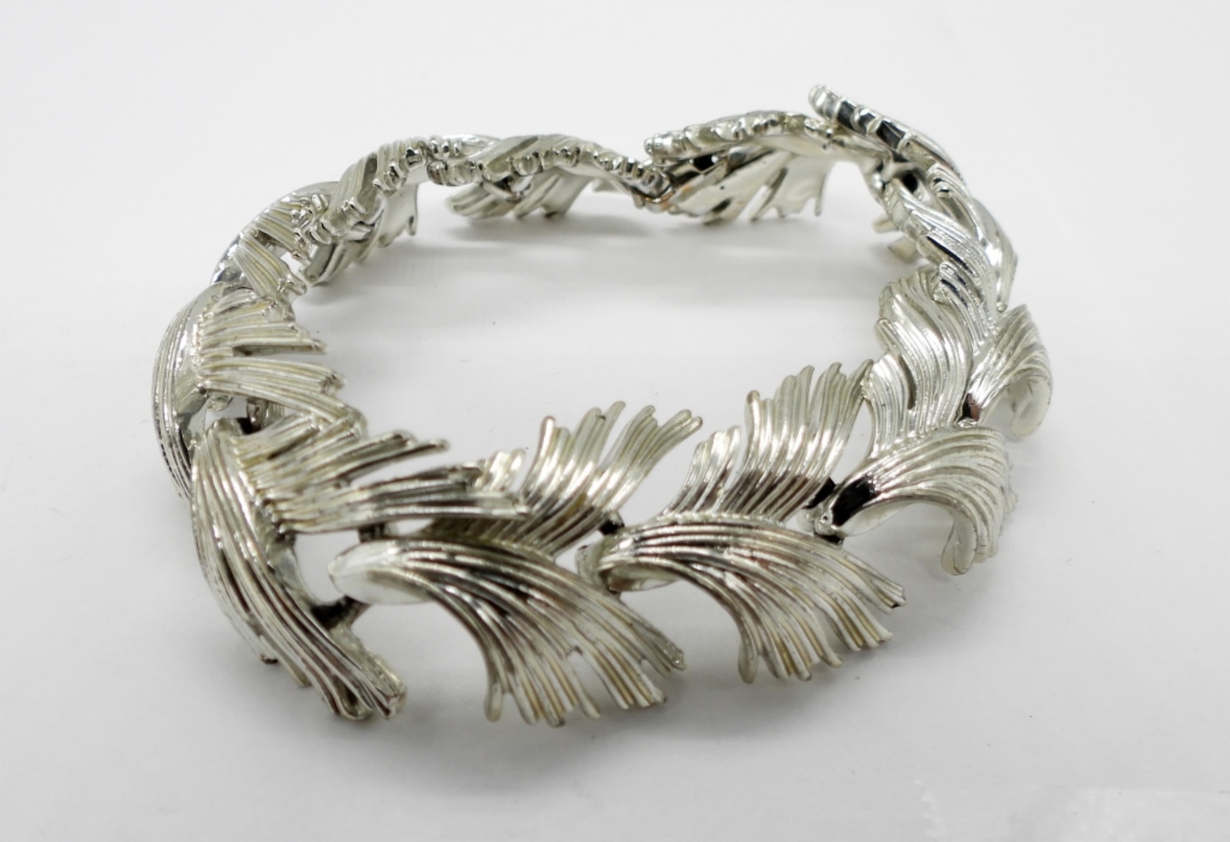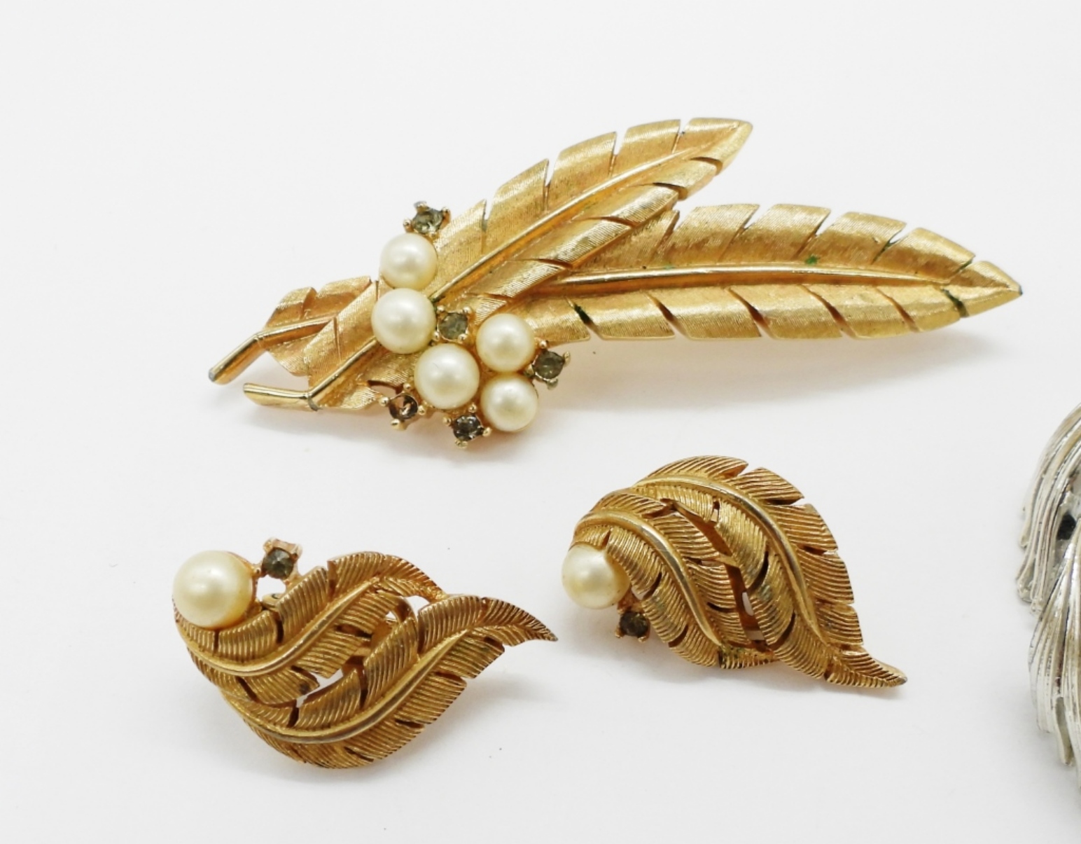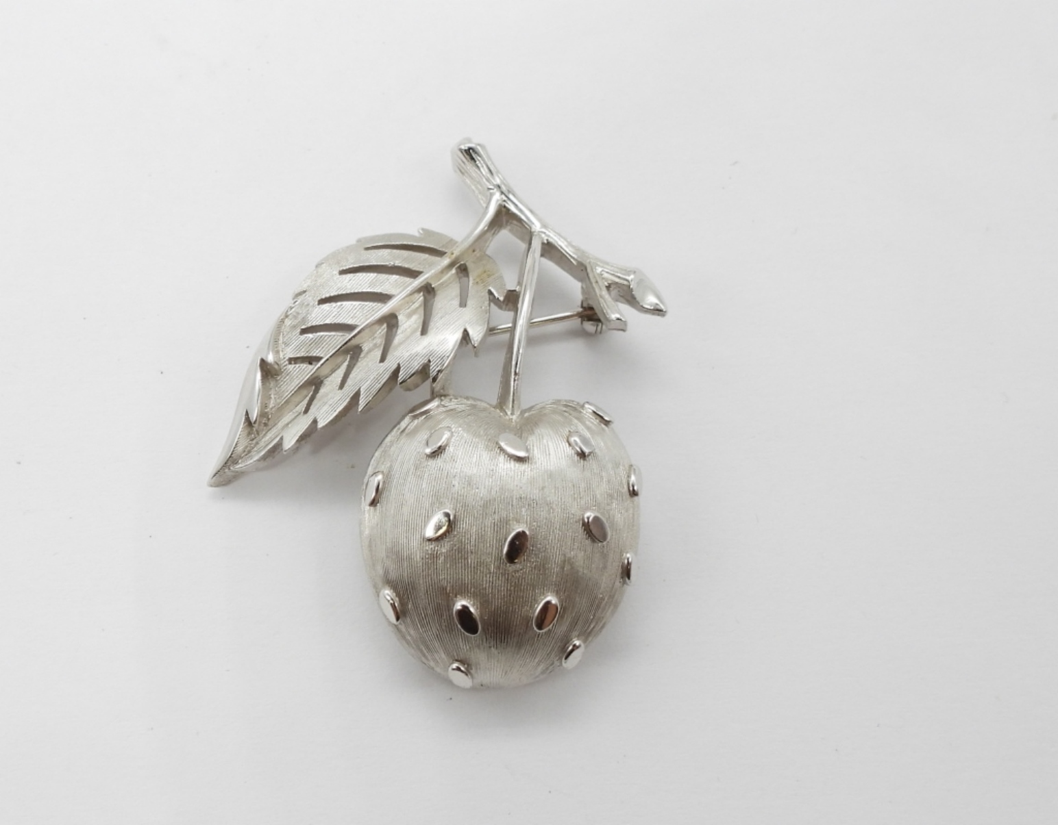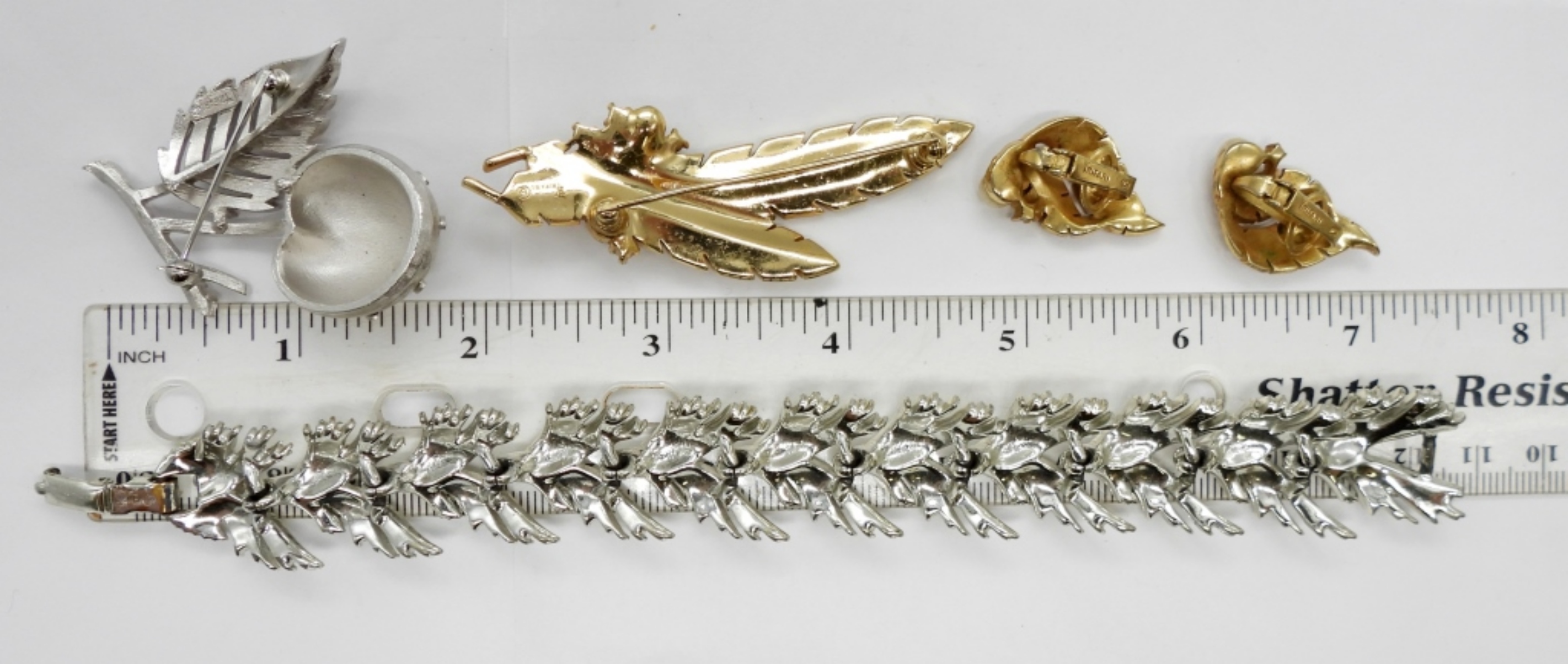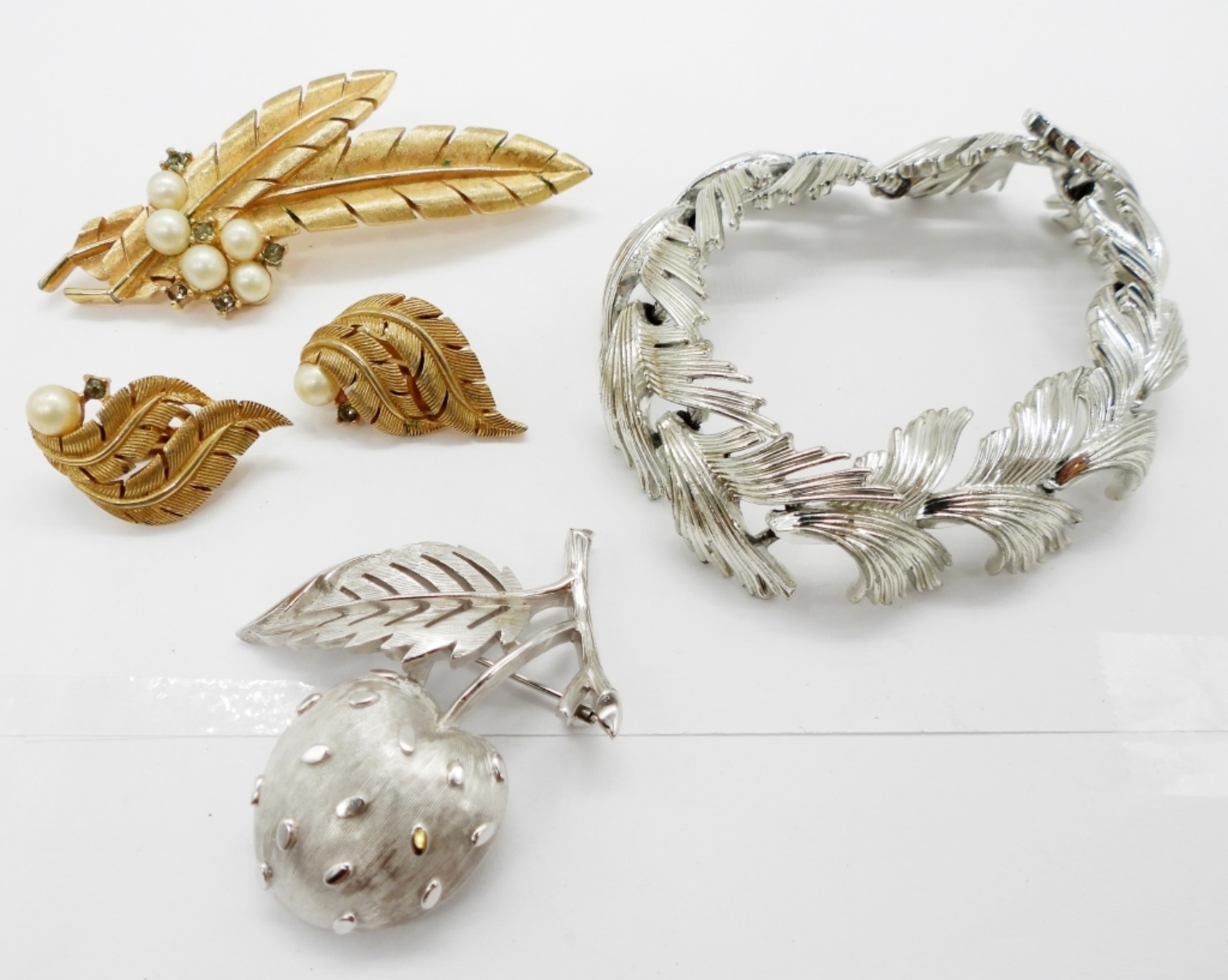 TRIFARI SILVER TONE CHERRY BROOCH, TRIFARI GOLD TONE LEAF BROOCH WITH MATCHING TRIFARI EARRINGS. LISNER SILVER TONE BRACELET, 7″.