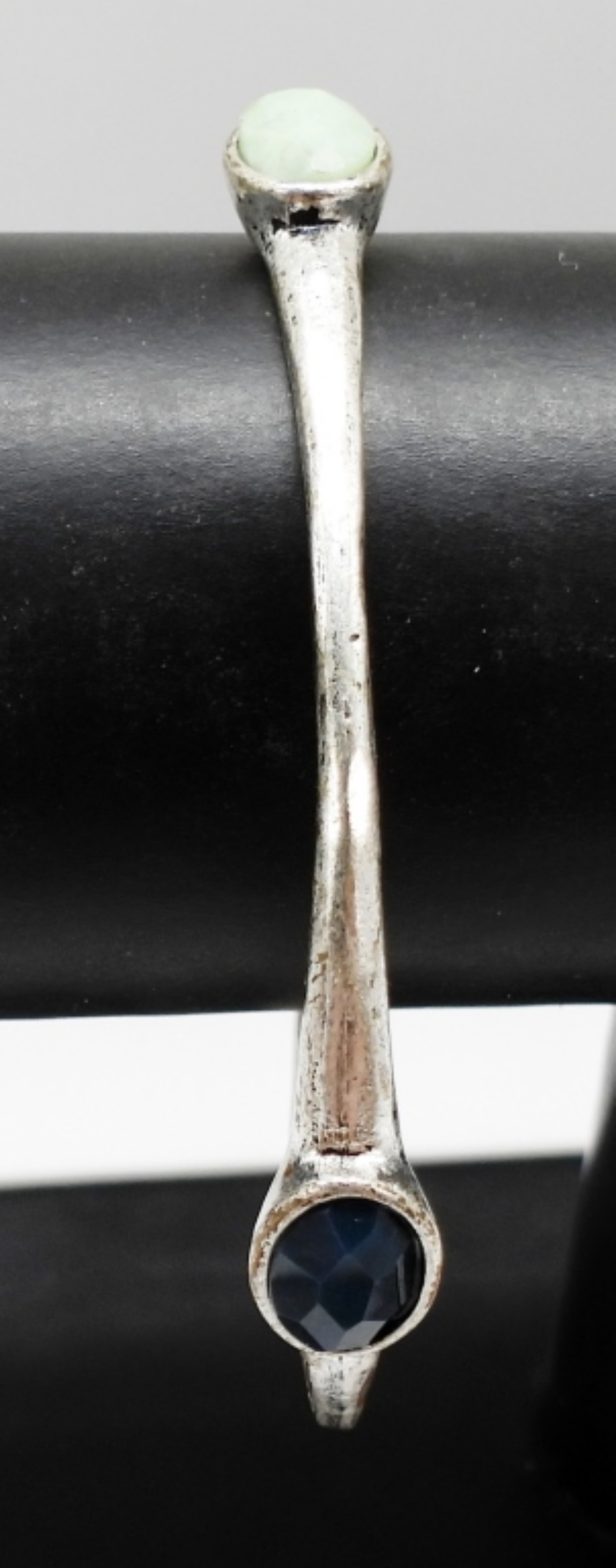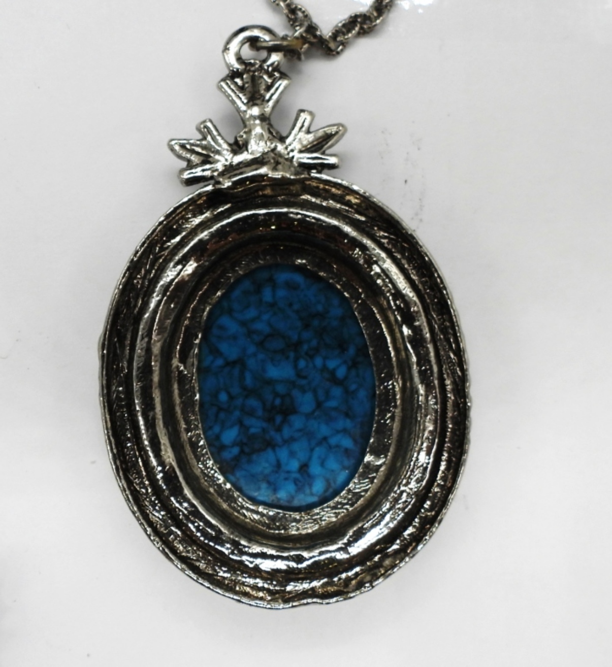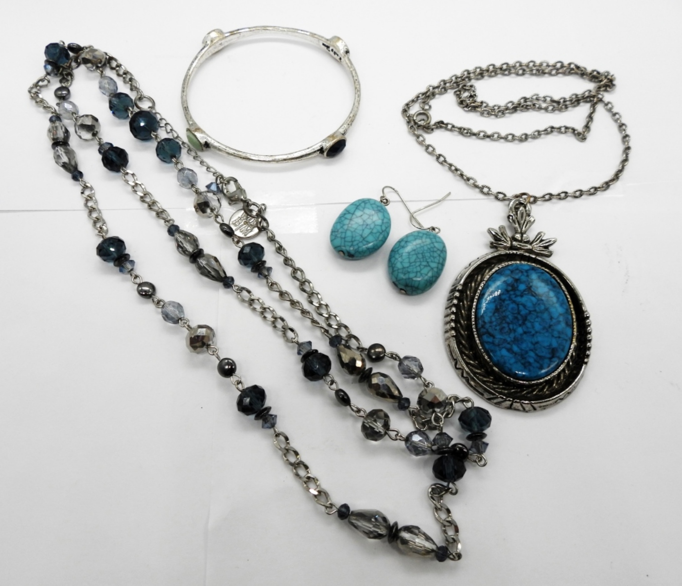 WHITE HOUSE/BLACK MARKET SILVER TONE CRYSTAL BEAD NECKLACE, 39″. LARGE FAUX TURQUOISE PENDANT (3″x2″) ON A 24″ CHAIN. FAUX TURQUOISE EARRINGS AND A SILVER TONE GEMSTONE BANGLE BRACELET.