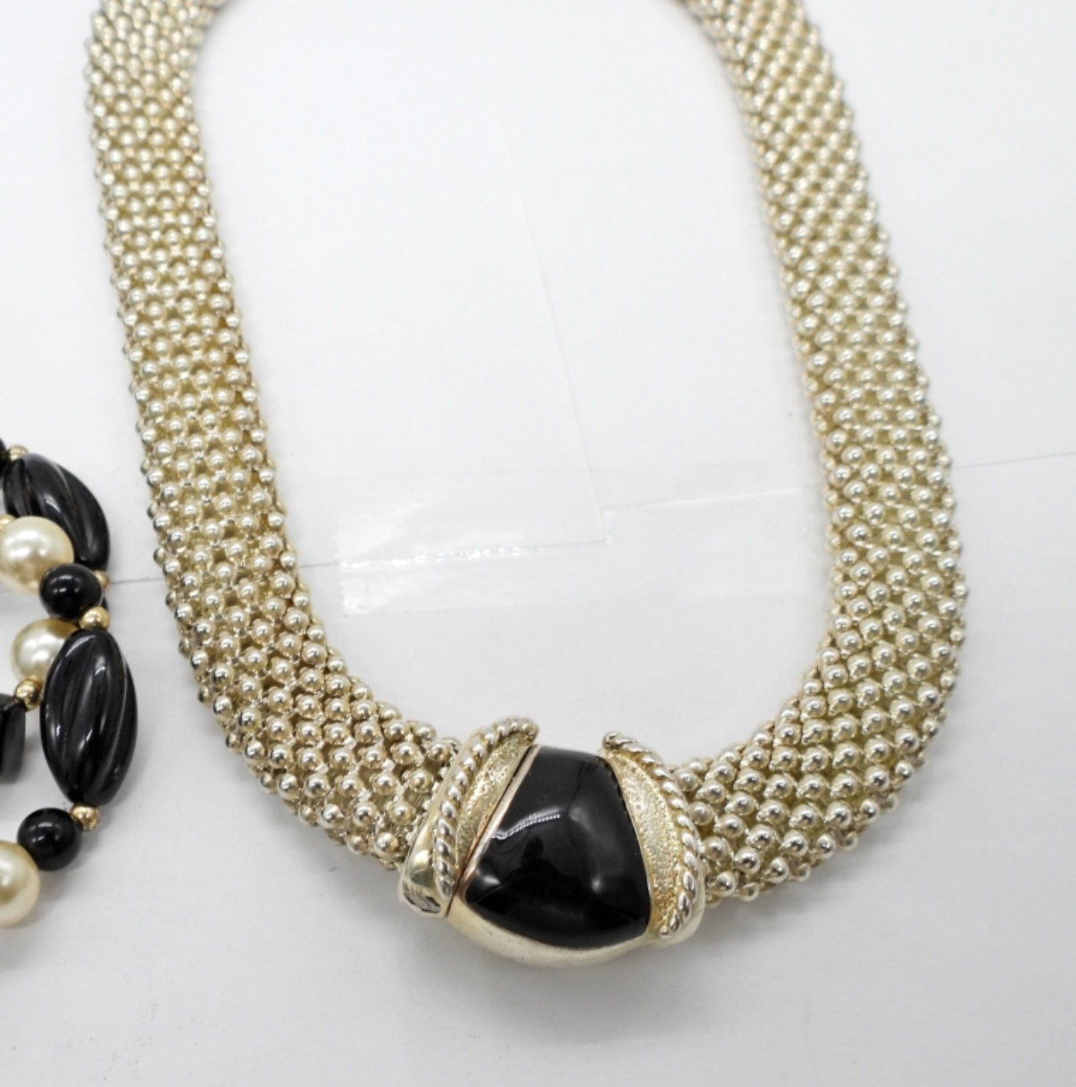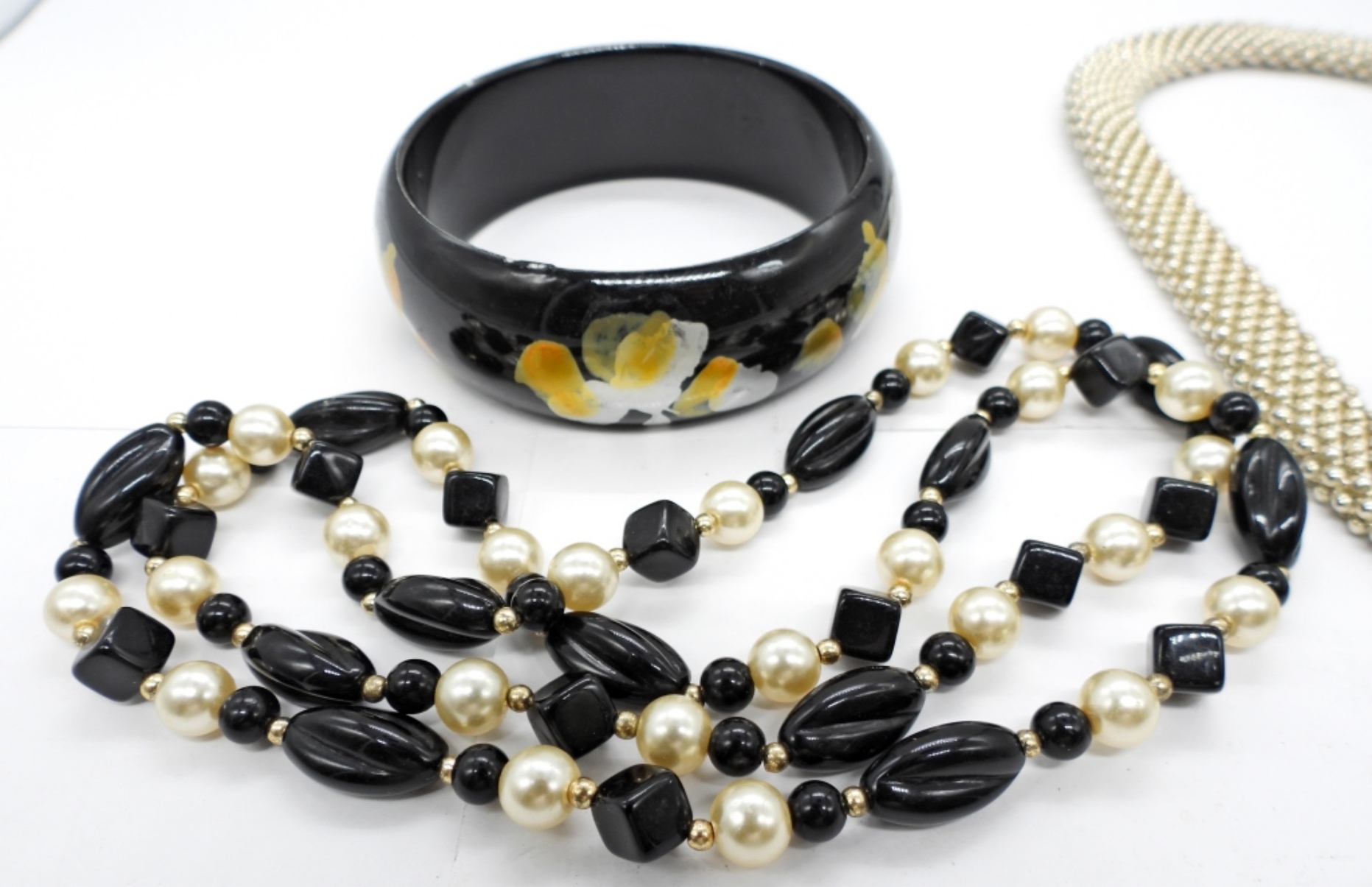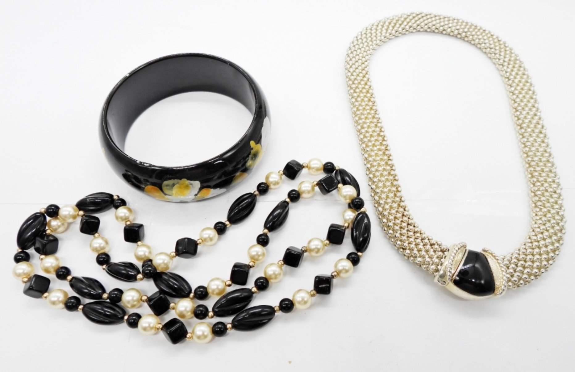 VINTAGE MESH COLLAR STYLE NECKLACE IN SILVER TONE AND BLACK ACCENT, 17.5″. PLASTIC BEADED BLACK AND WHITE NECKLACE, 30″. VINTAGE BLACK HAND PAINTED BANGLE BRACELET.