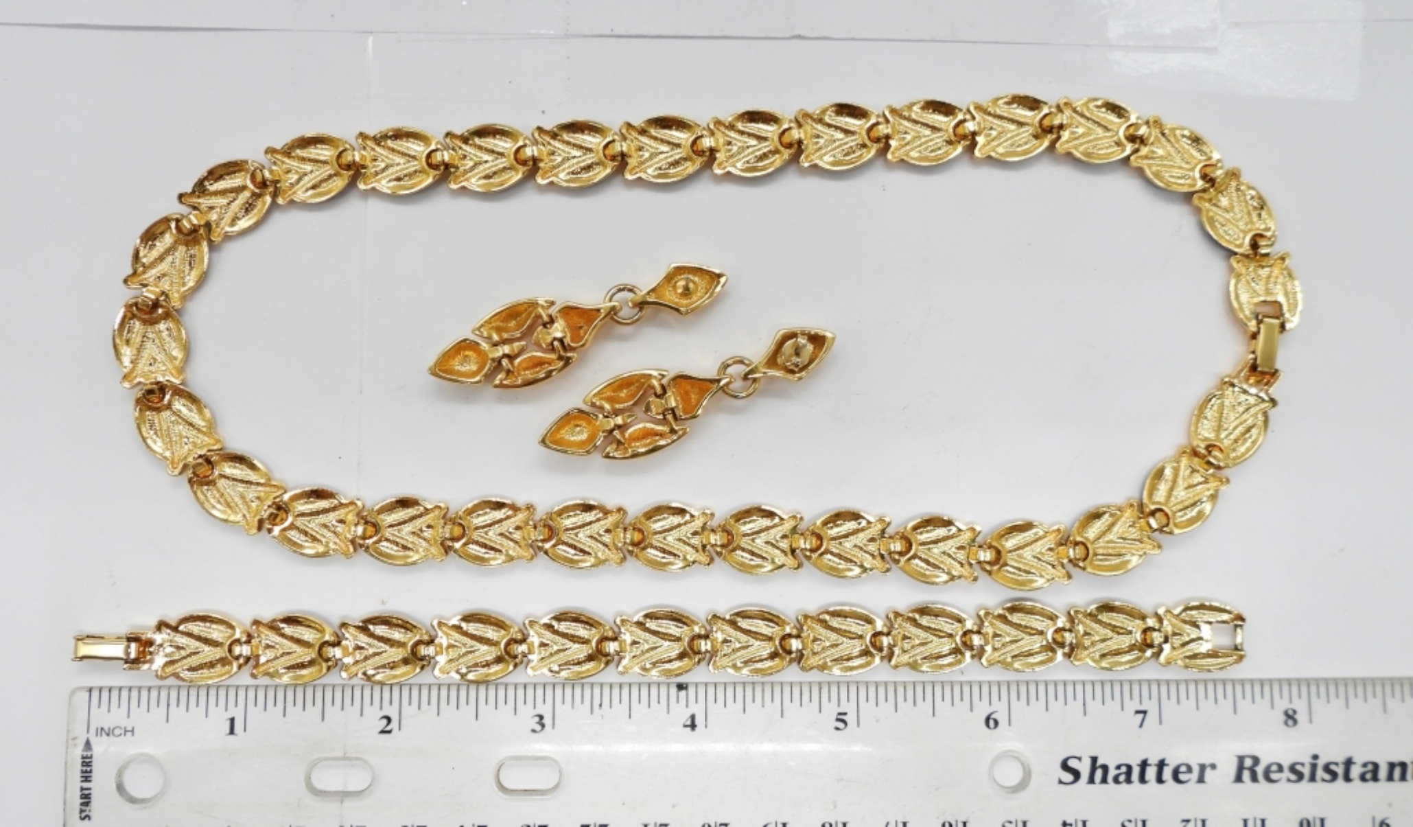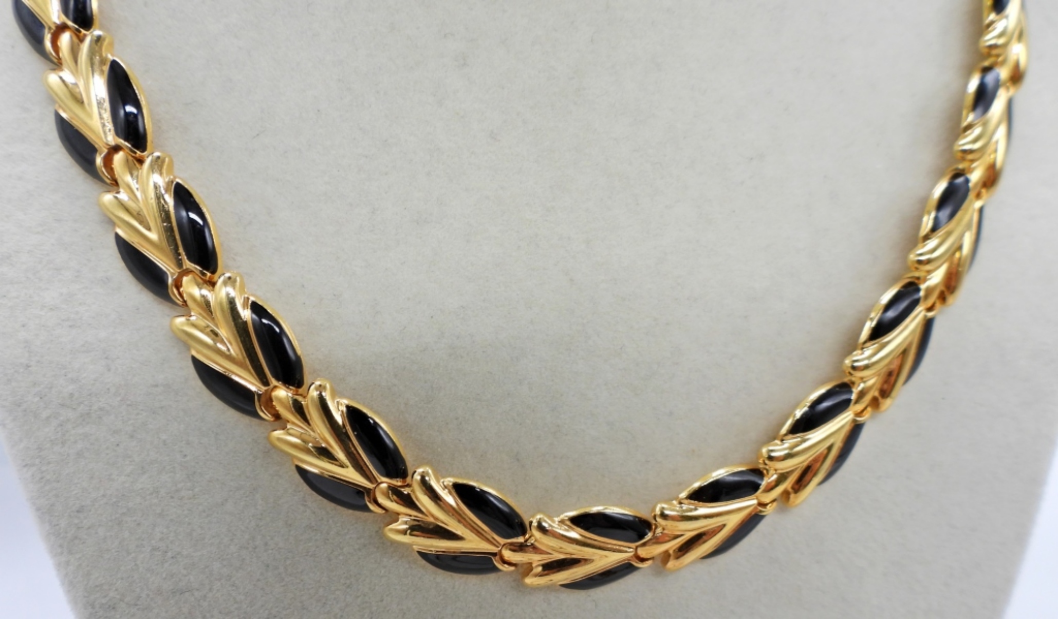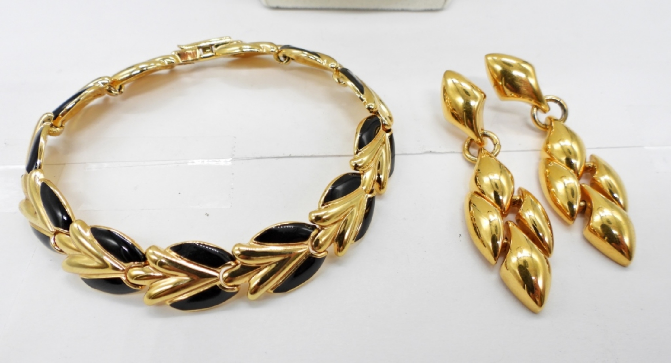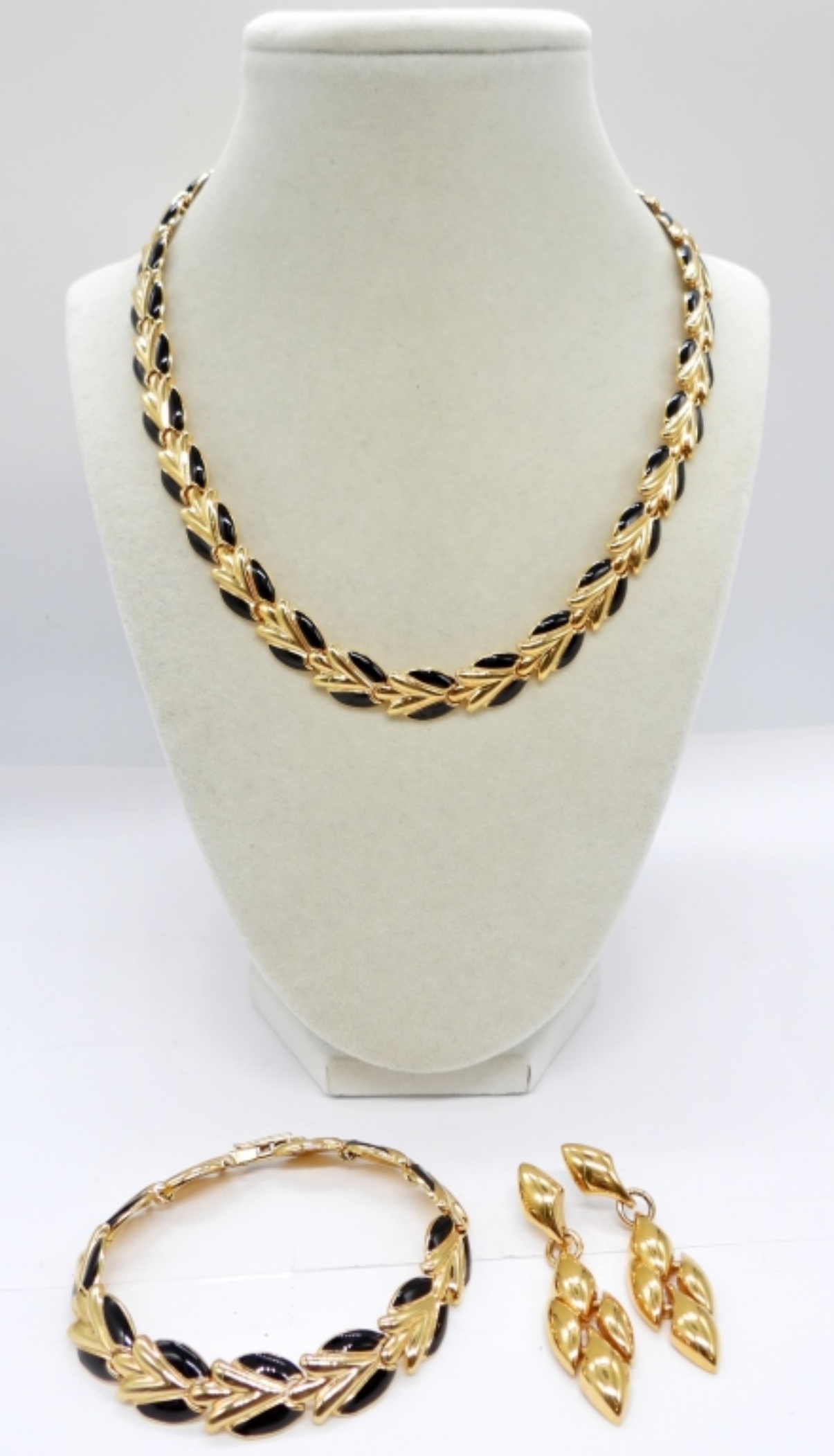 GOLD TONE WITH BLACK ACCENTS NECKLACE (17.5″), MATCHING BRACELET (7.5″) AND GOLD TONE EARRINGS, 2″ LONG.