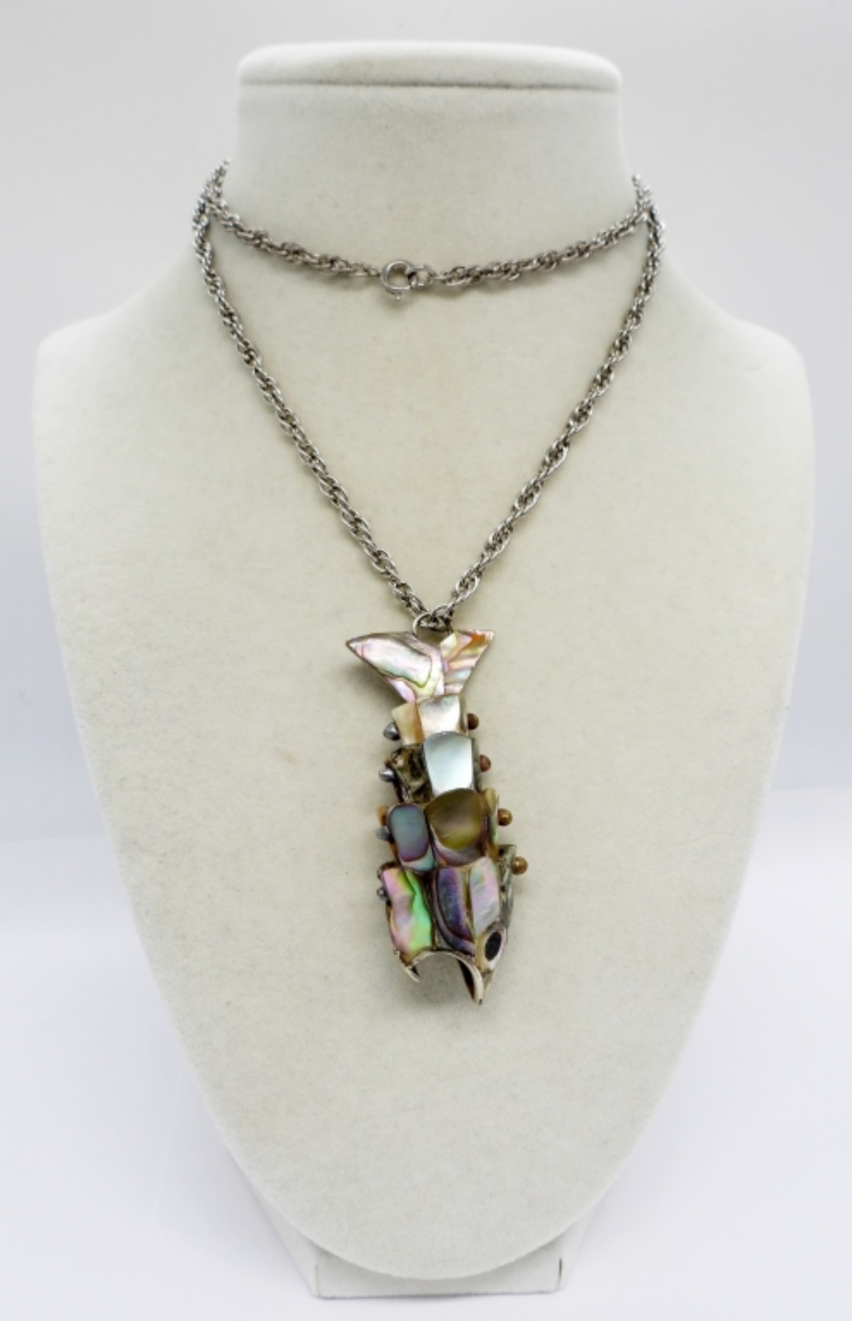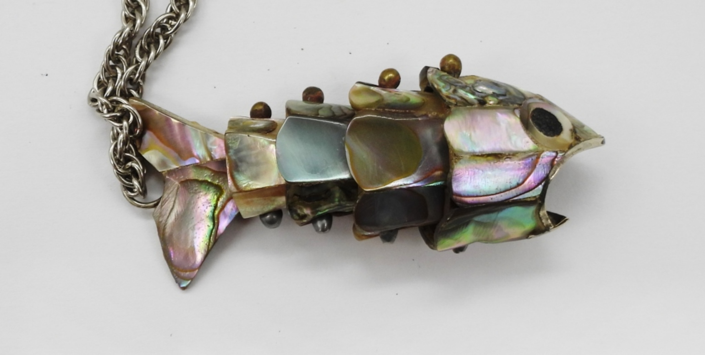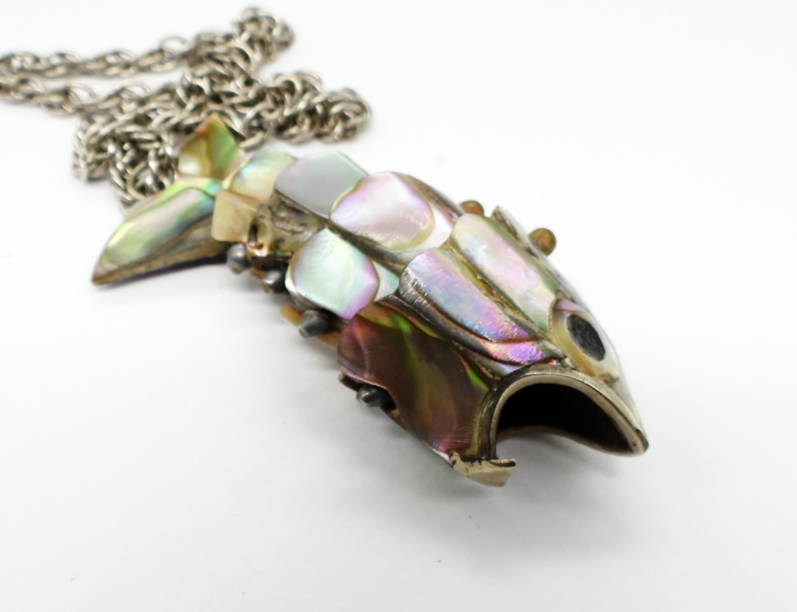 VINTAGE MEXICAN ABALONE SHELL/MOTHER OF PEARL ARTICULATED FISH PENDANT. CHAIN IS 24″, SILVER TONE.