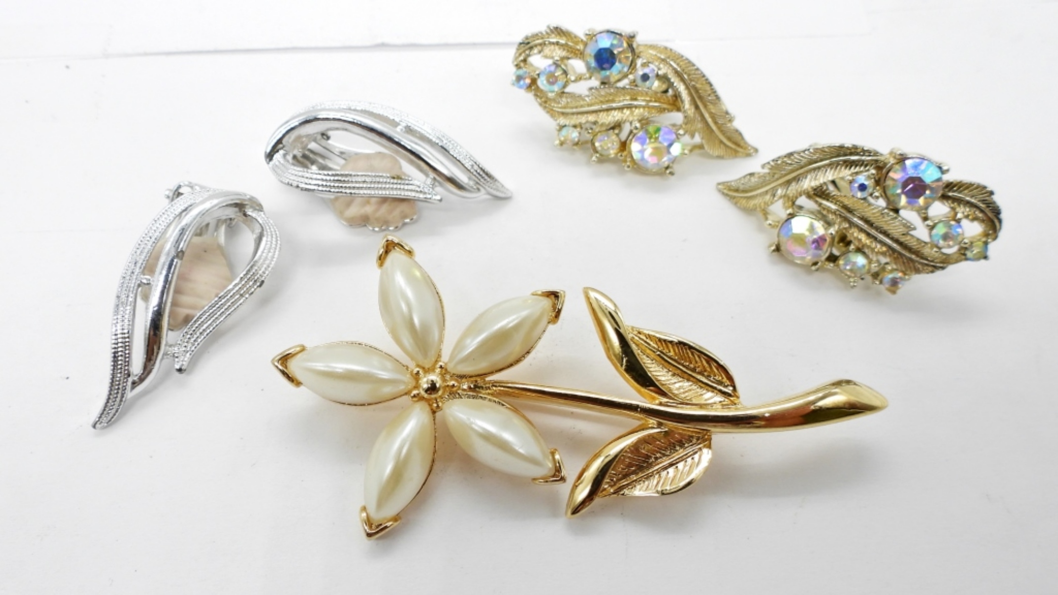 GOLD TONE FLOWER BROOCH IS NAPIER, GOLD TONE CLIP ON EARRINGS ARE CORO, SILVER TONE CLIP ON EARRINGS ARE SARAH COVENTRY.