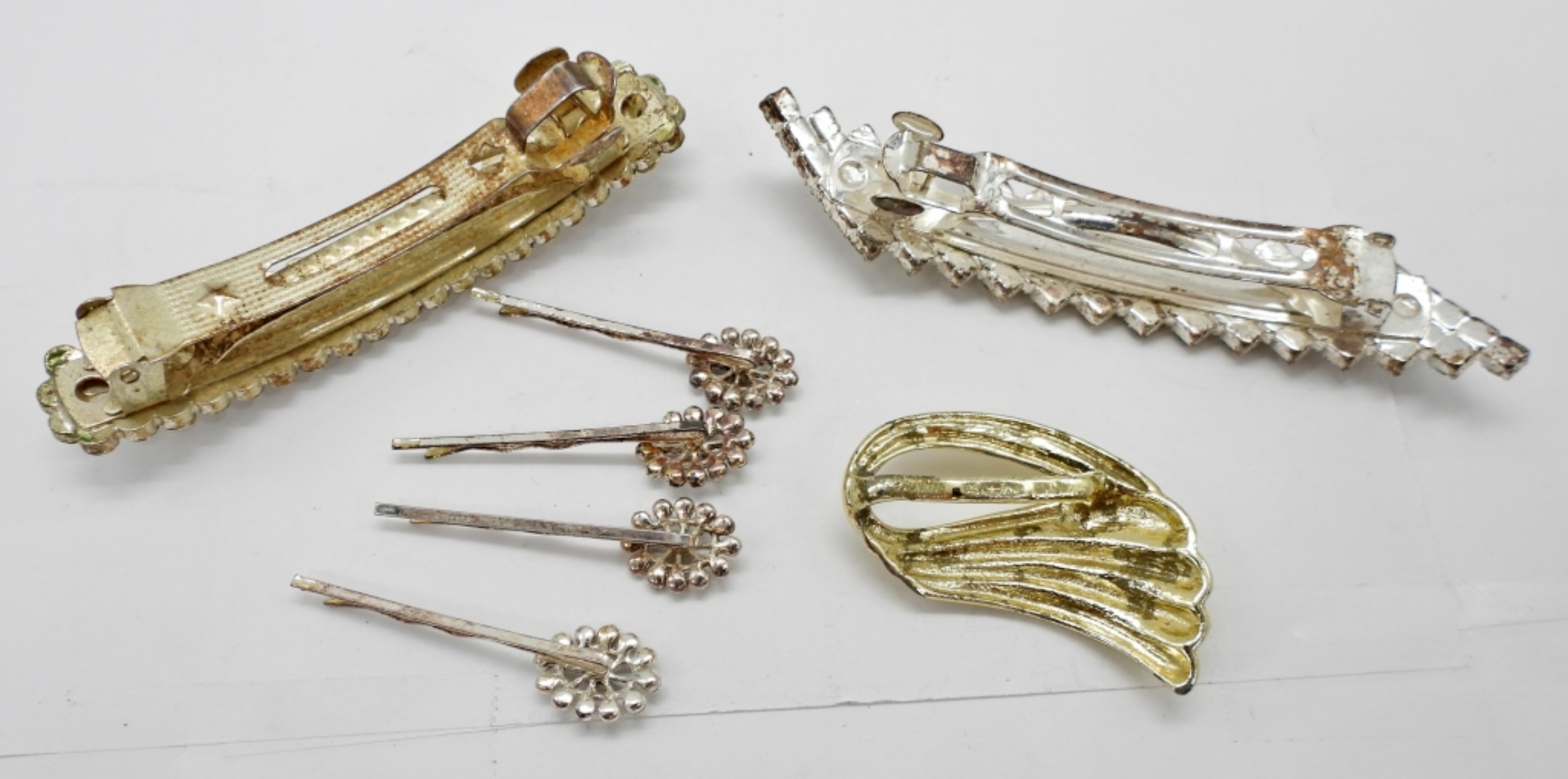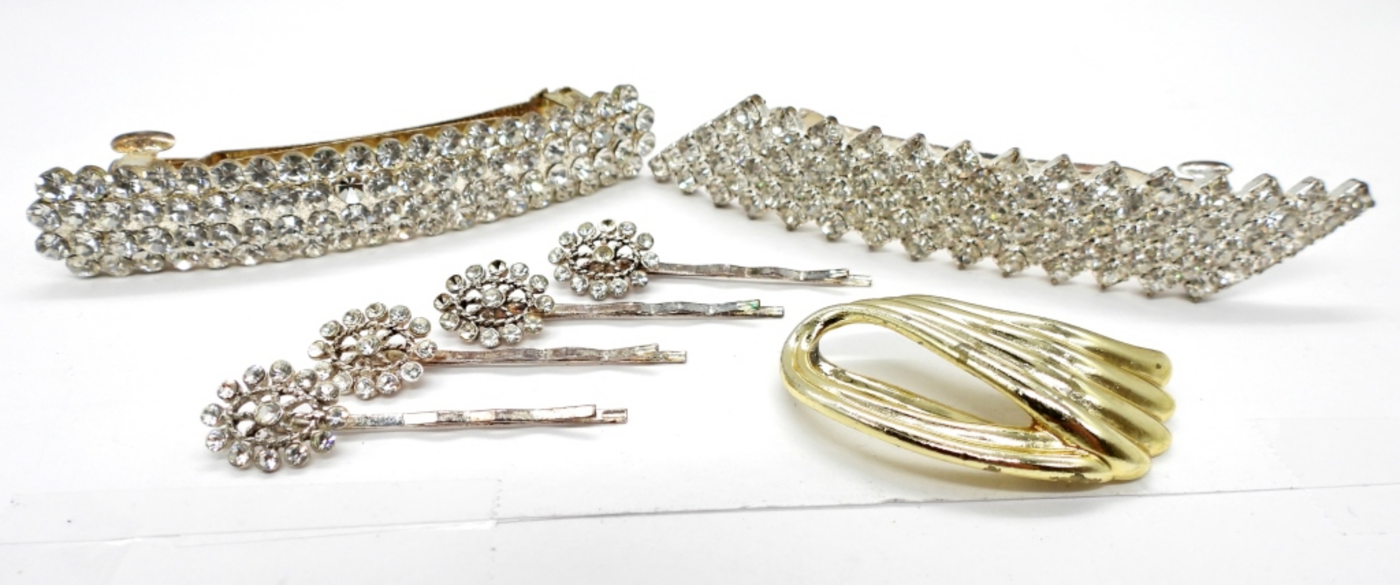 TWO VINTAGE RHINESTONE HAIR CLIPS. THREE RHINESTONE HAIR PINS, ONE GOLD TONE SCARF DÉCOR.