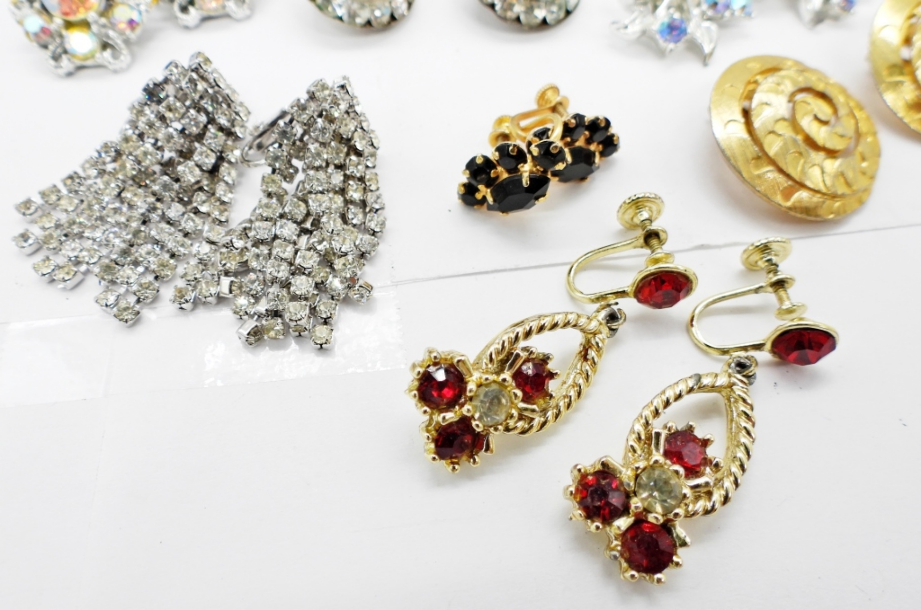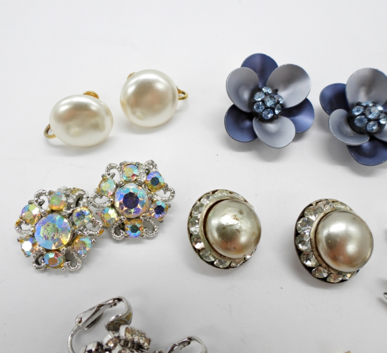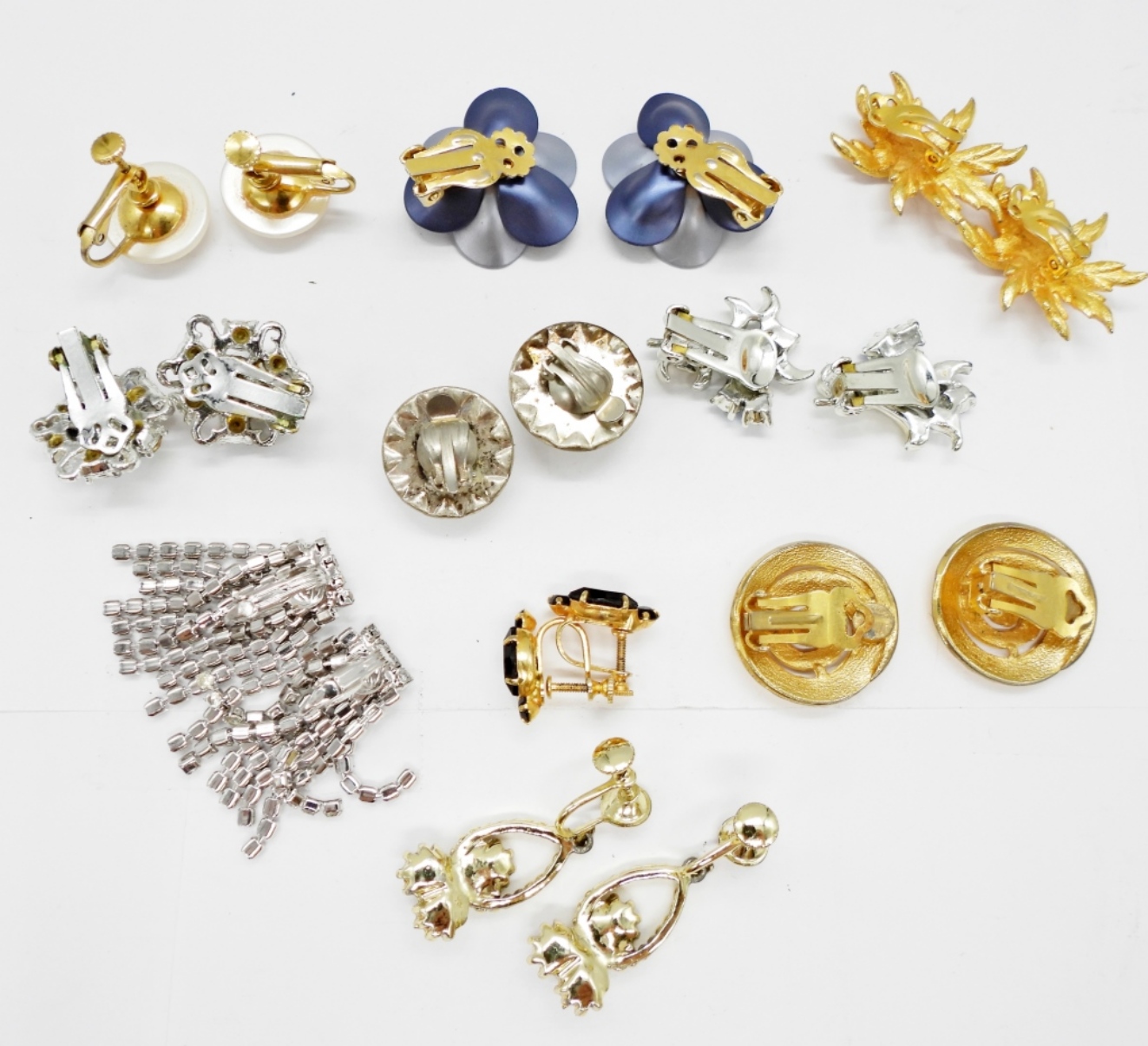 TEN PAIR OF VINTAGE CLIP ON AND SCREW BACK EARRINGS. RHINESTONES, PEARLS, SILVER TONE & GOLD TONE.