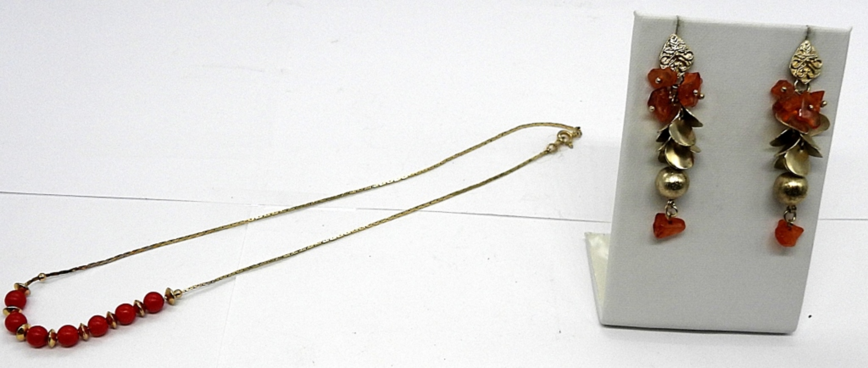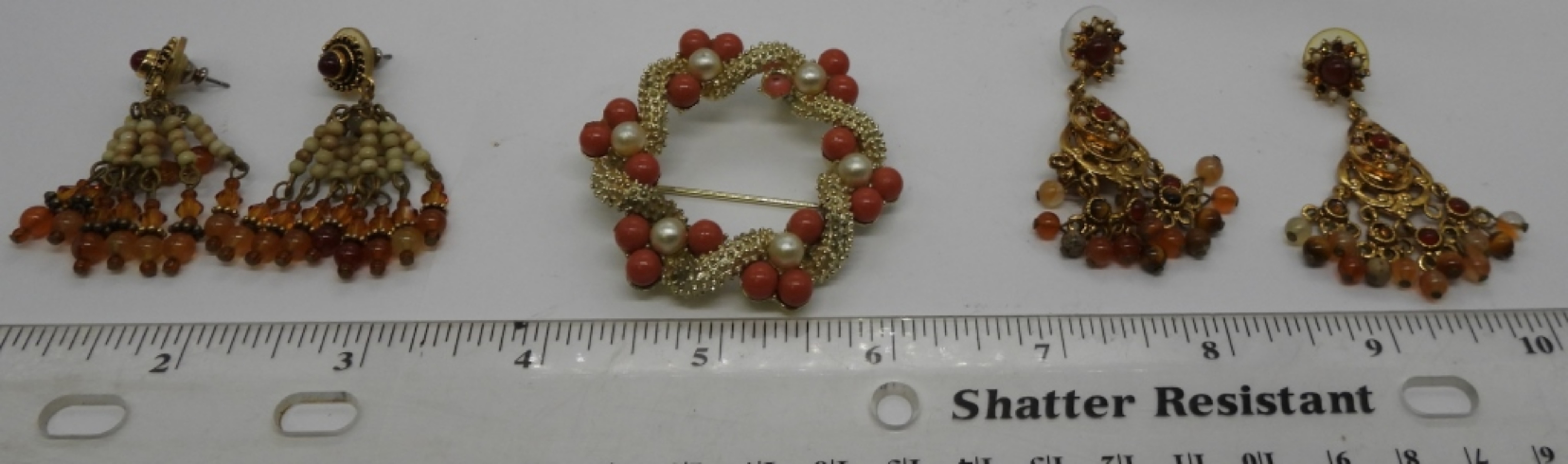 (3) SETS OF EARINGS 16″ RED BEADED NECKLACE (1) BROOCH