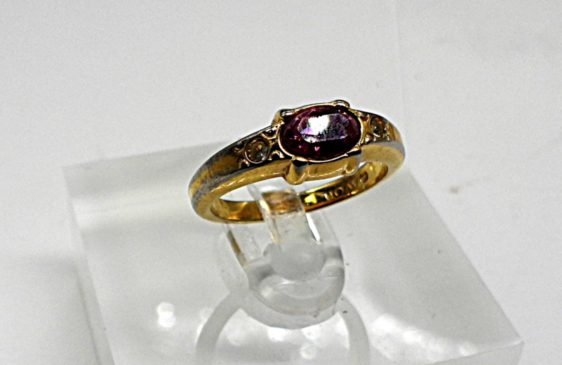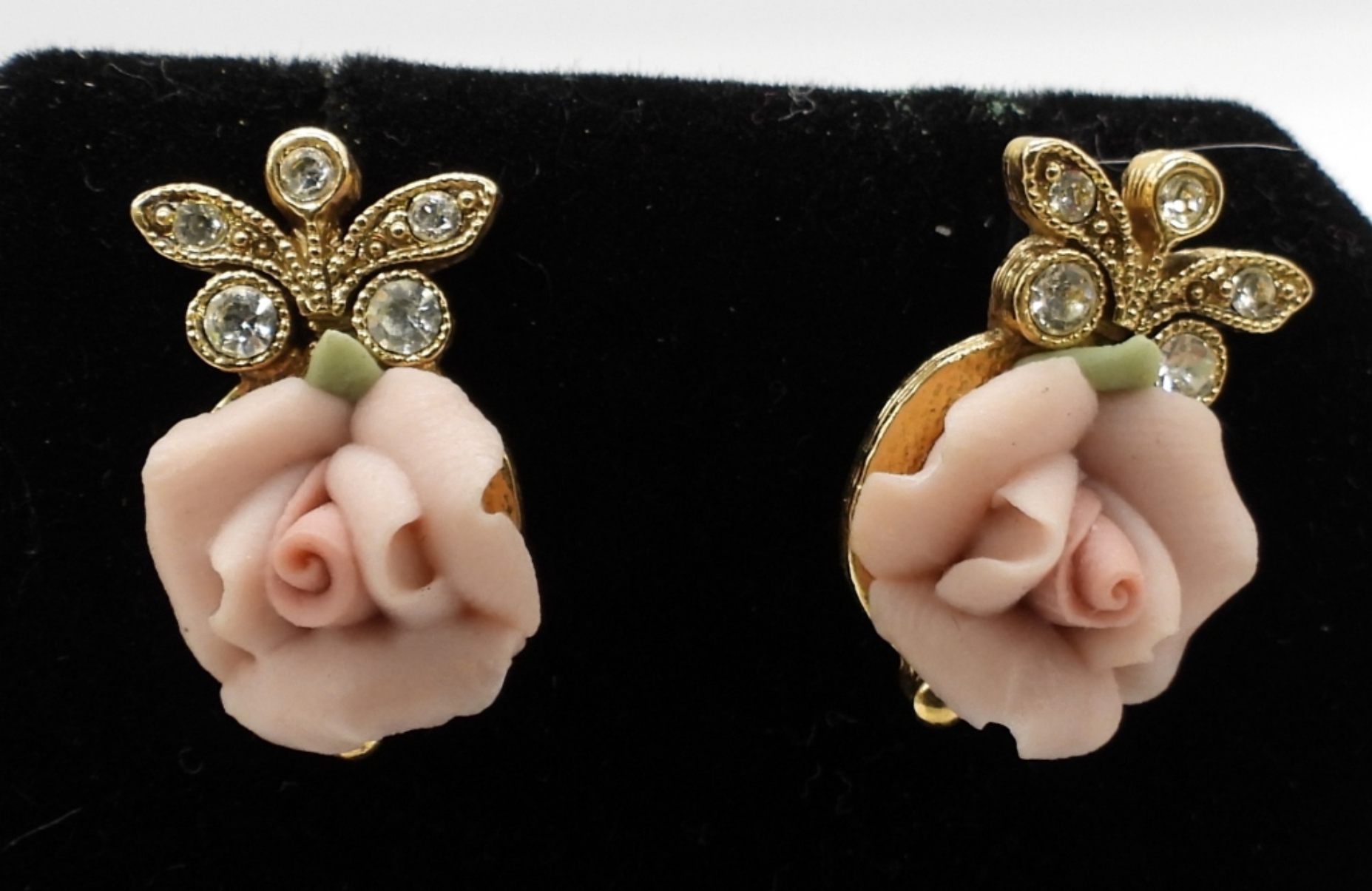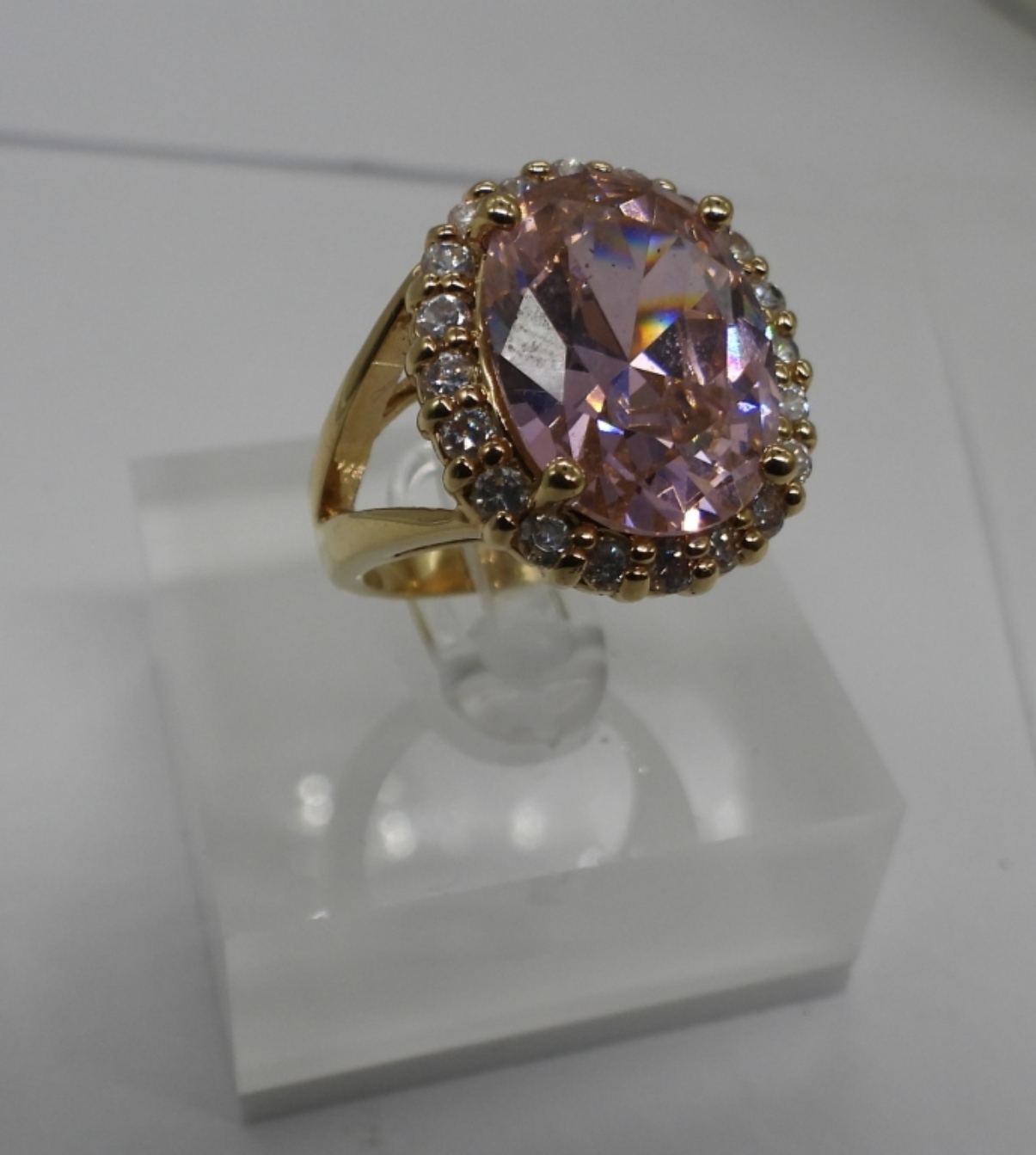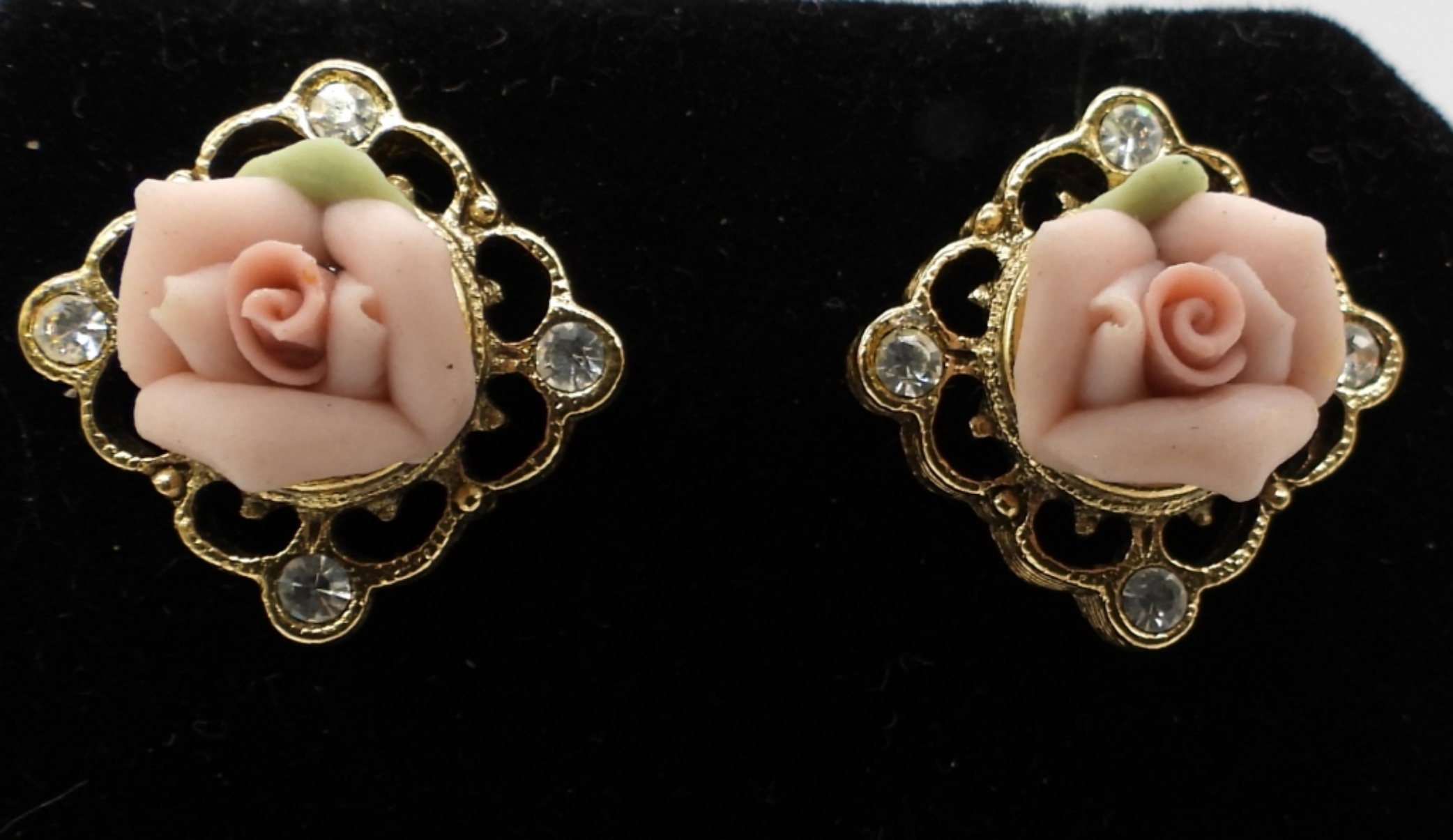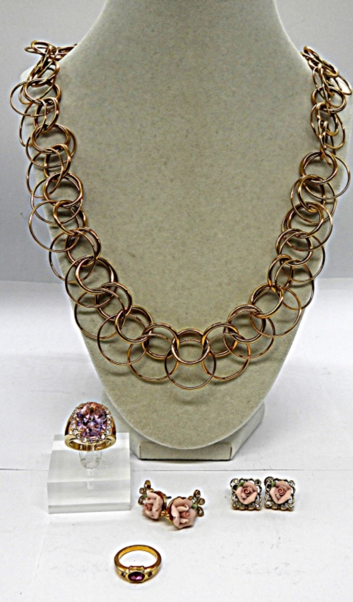30″ GOLD TONE FASHION NECKLACE SIZE 4 GOLD TONE PINK GEM STONE RING BEAUTIFUL COCKTAIL RING SIZE 7.5 PINK CENTER (2) SETS OF PORCELIN ROSE EARINGS