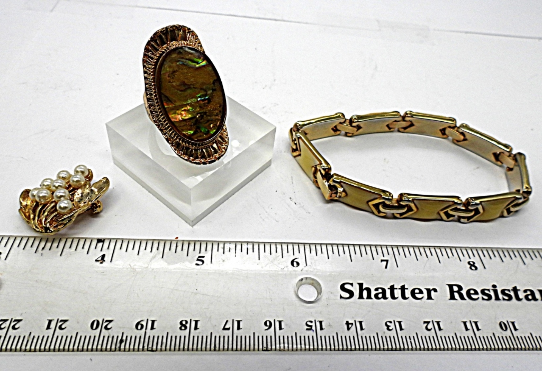 18″ NOLAN MILLER GOLD TONE NECKLACE 22″ AVON GOLD TONE NECKLACE 7.5 GOLD TONE FASHION RING (1) GOLD TONE BROACH (1) FASHION BRACELET