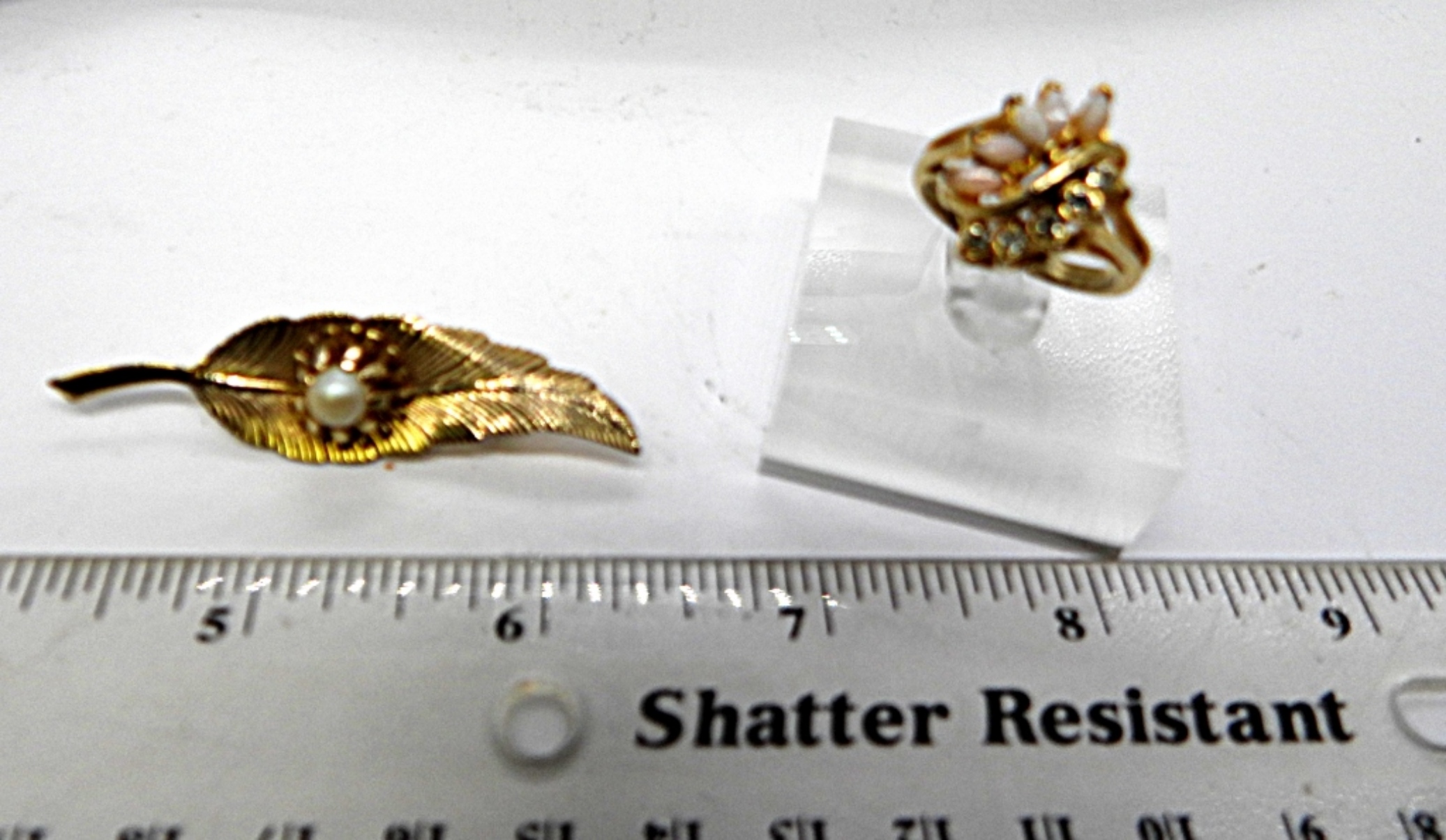 18″GOLD TONE NECKLACE SIZE 7 COCKTAIL RING GOLD TONE SIZE 6 RING STRETCHY BEADED BRACLET FAUX PEARL BROACH