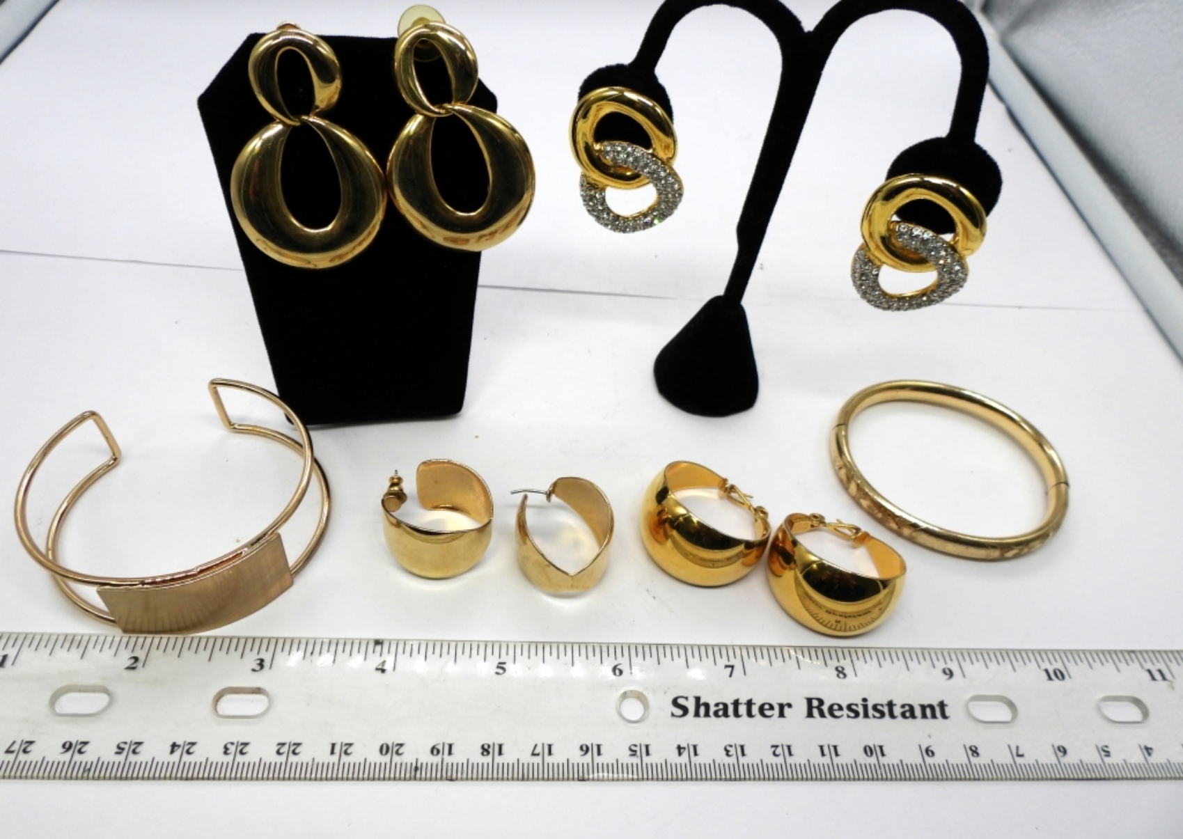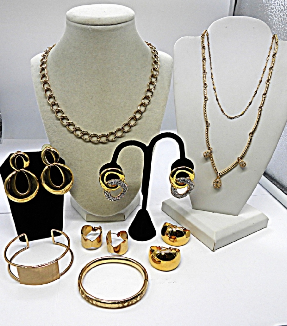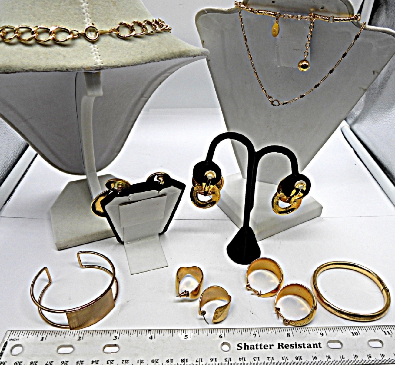 WINARD BANGLE BRACLET 1/20 12K GOLD (2) 18″ NECKLACES (1) CLIP ON EARING SET (3) GOLD TONE PIERCED EARING SETS (1) OPEN CUFF BRACLET