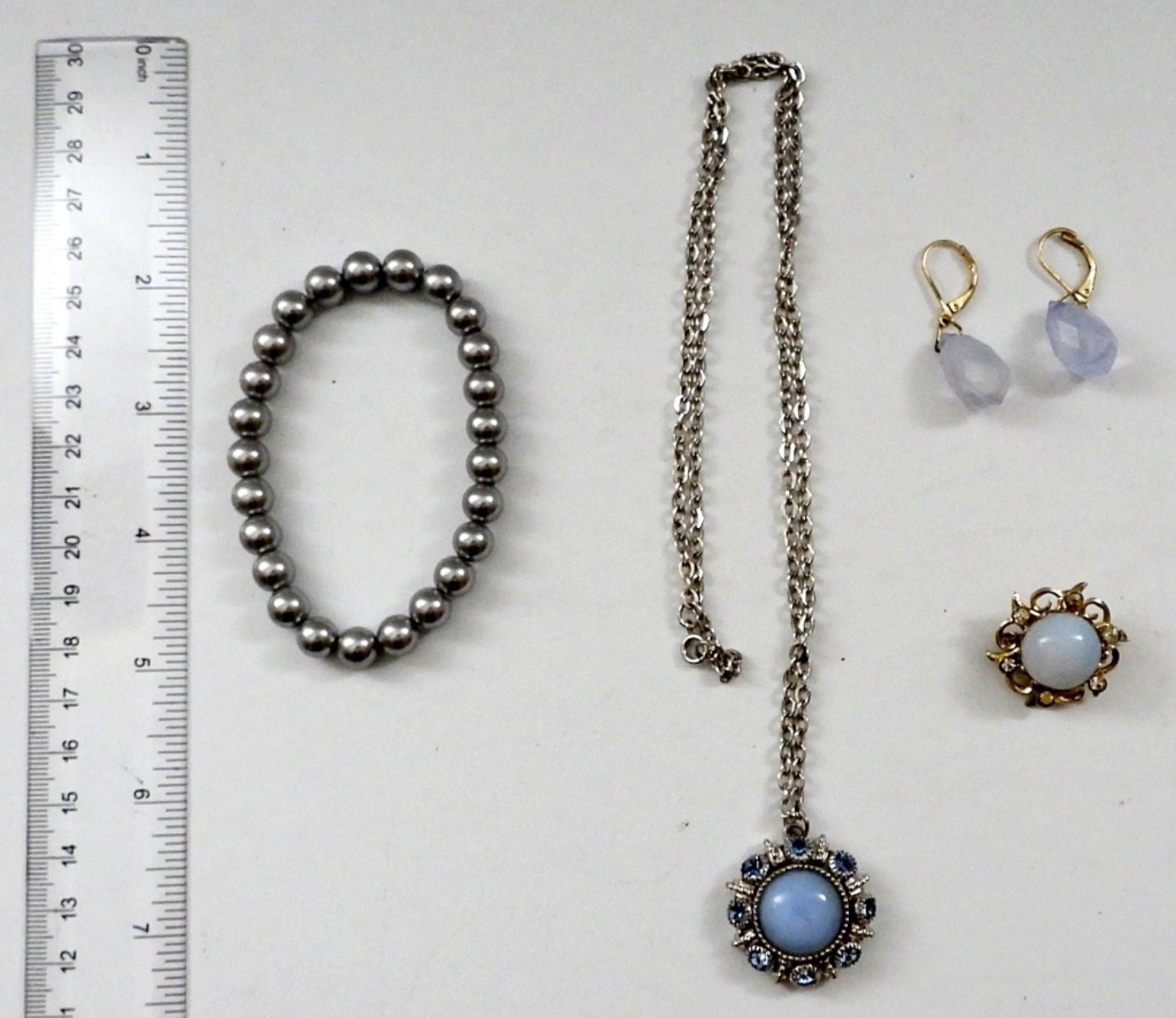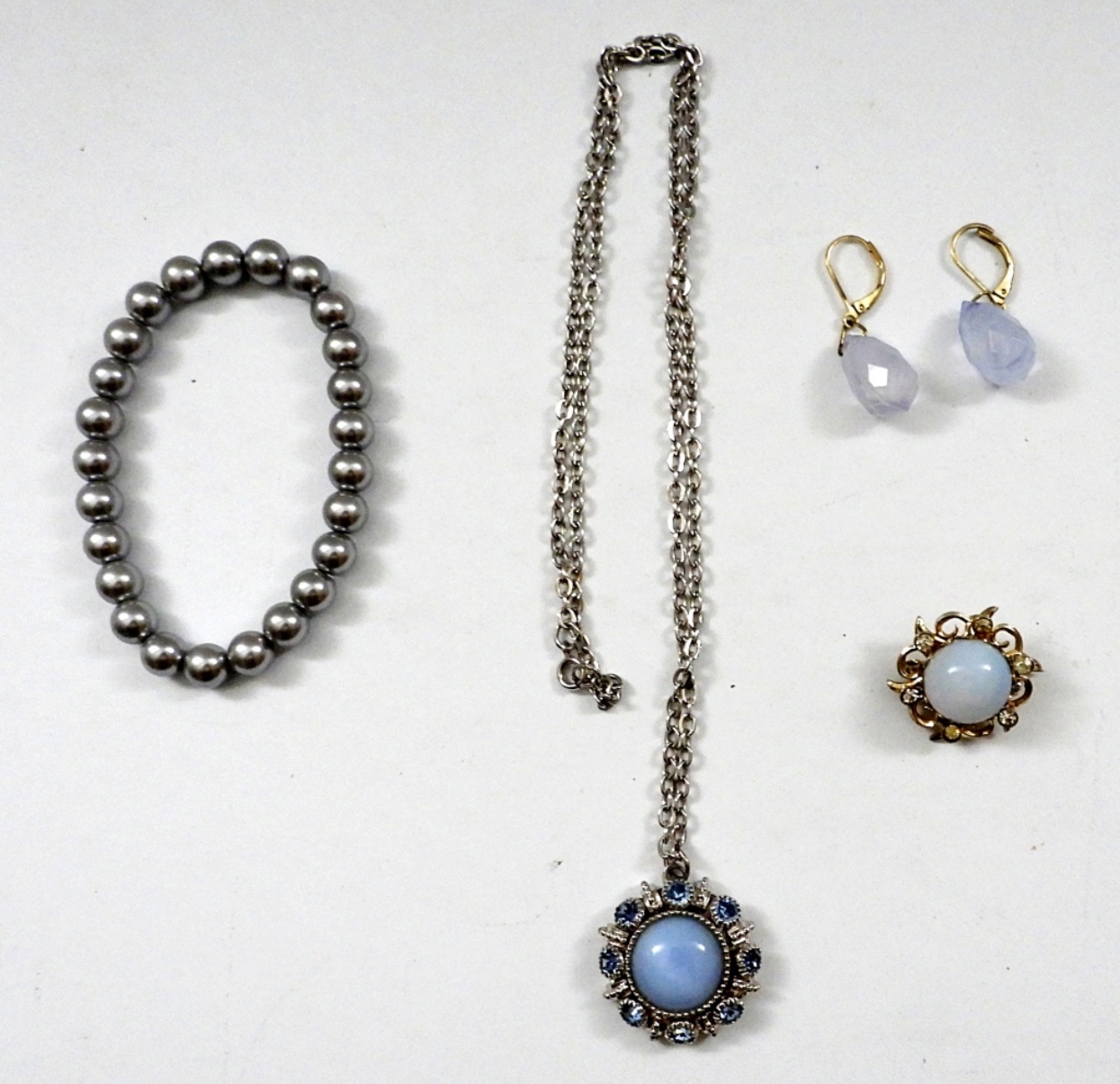 VINTAGE MATCHING JEWELRY SET OPAL, SMOKY ONYX, LIGHT BLUE, GRAY STONES – NECKLACE WITH PENDANT & 24″ CHAIN, STRETCHY BRACELET, PIERCED EARRINGS, BROOCH STYLE PENDANT