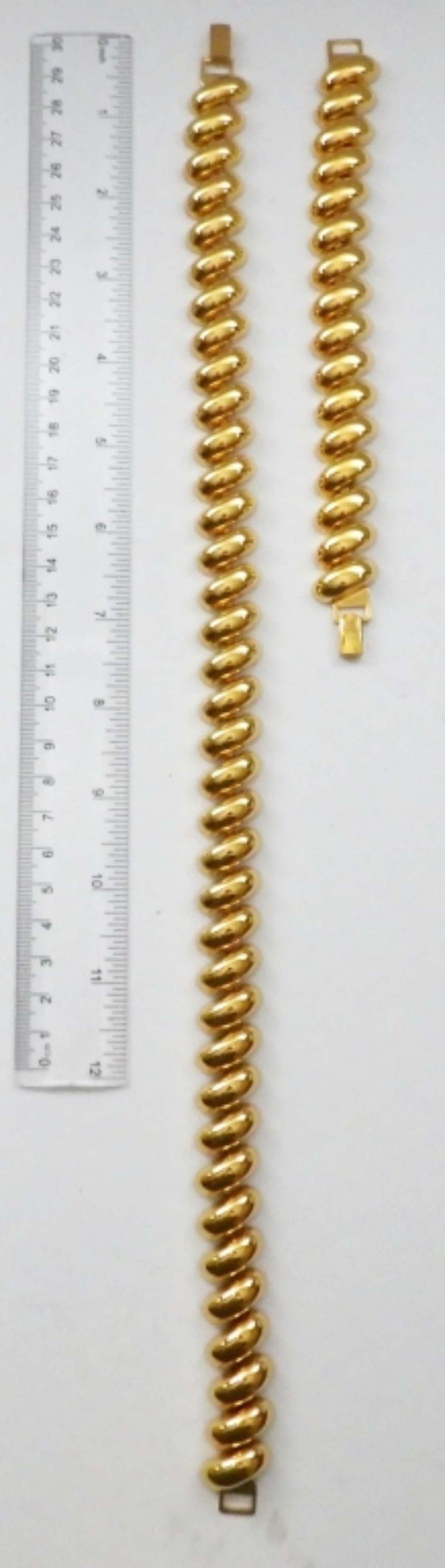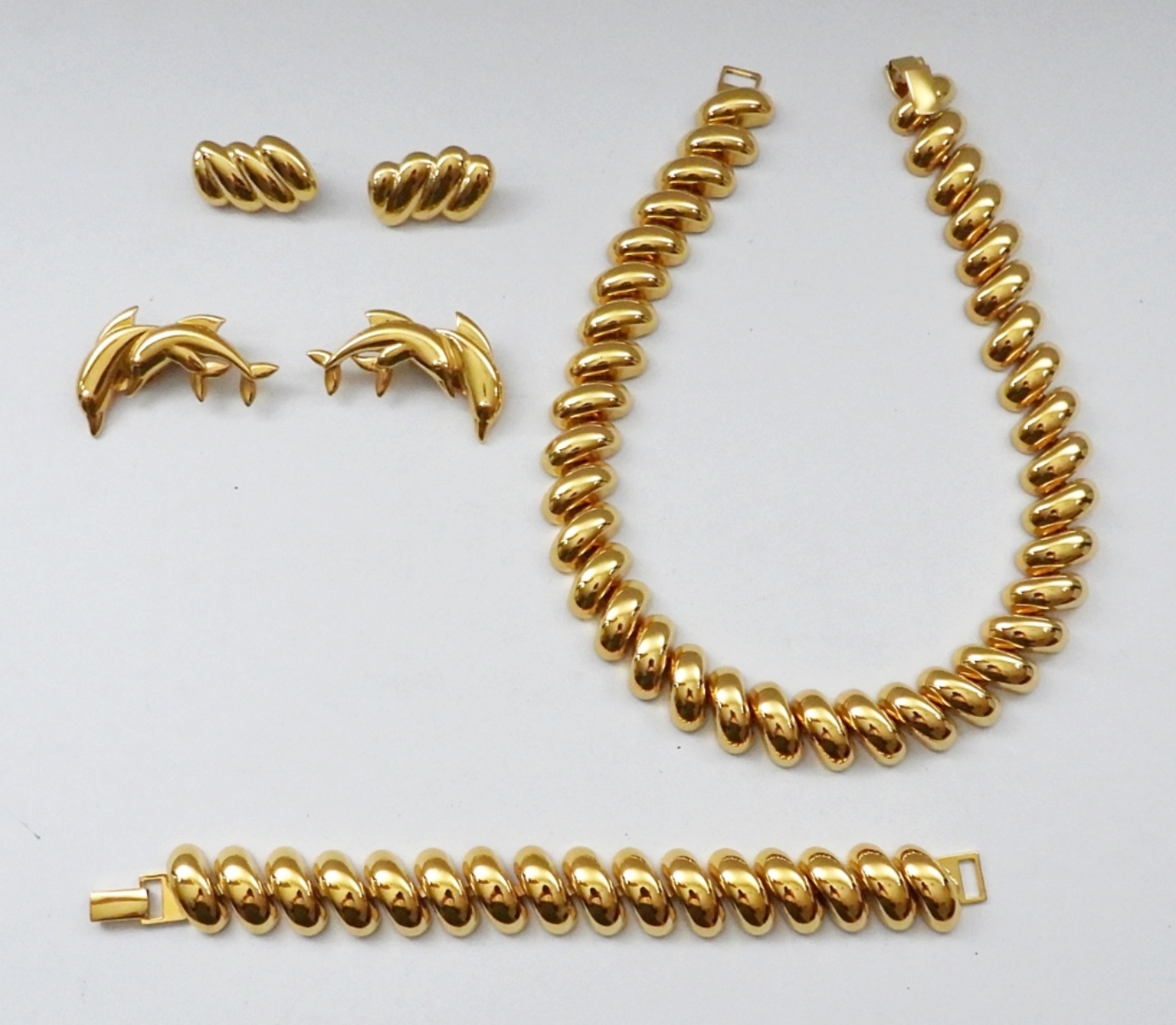 16″ NAPIER GOLD TONE NECKLACE WITH MATCHING 7.5″ NAPIER BRACELET, (2) PAIRS OF GOLD TONE CLIP-ON EARRINGS (1- SIGNED MONET)