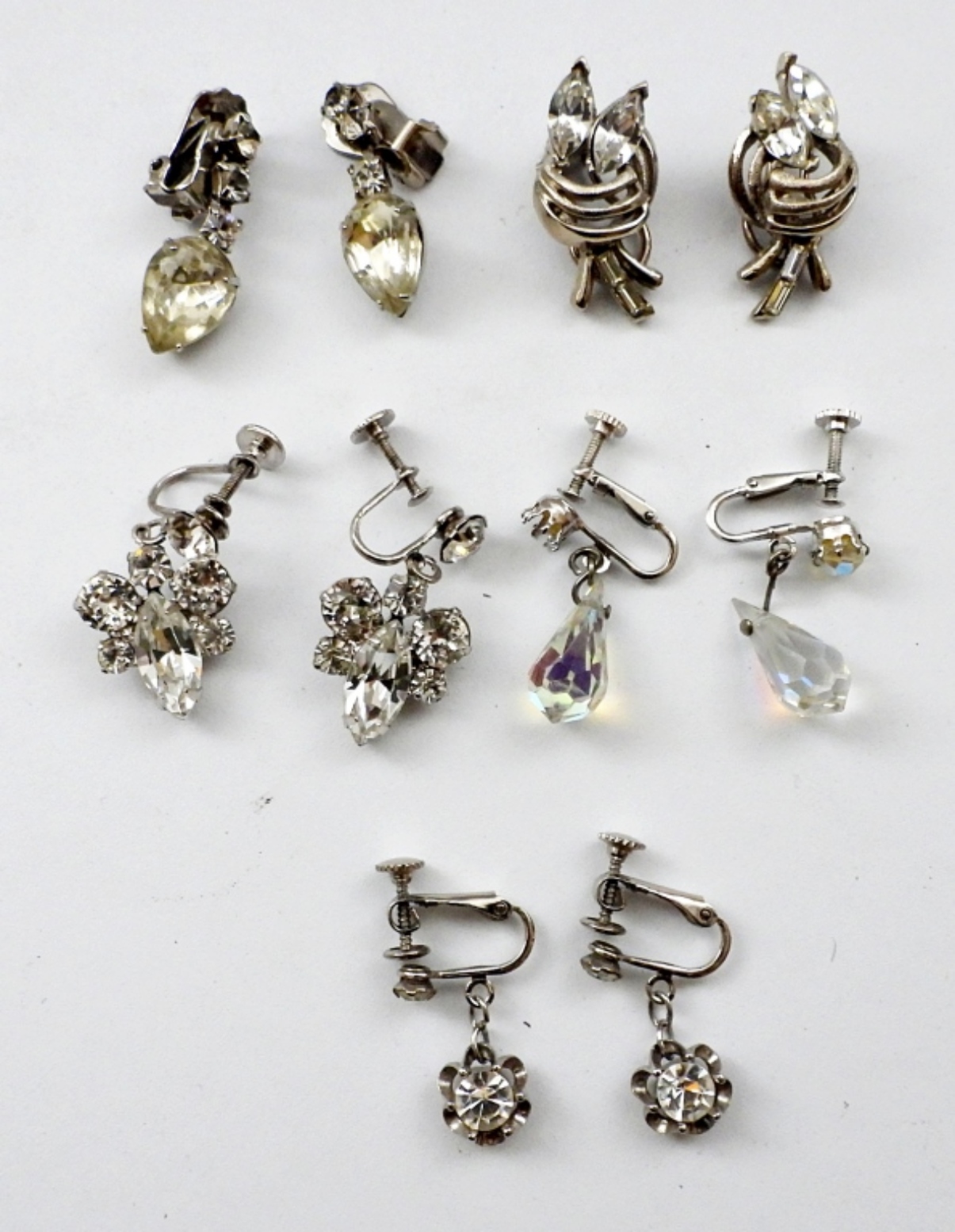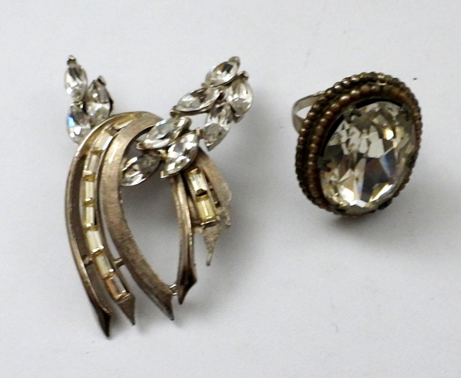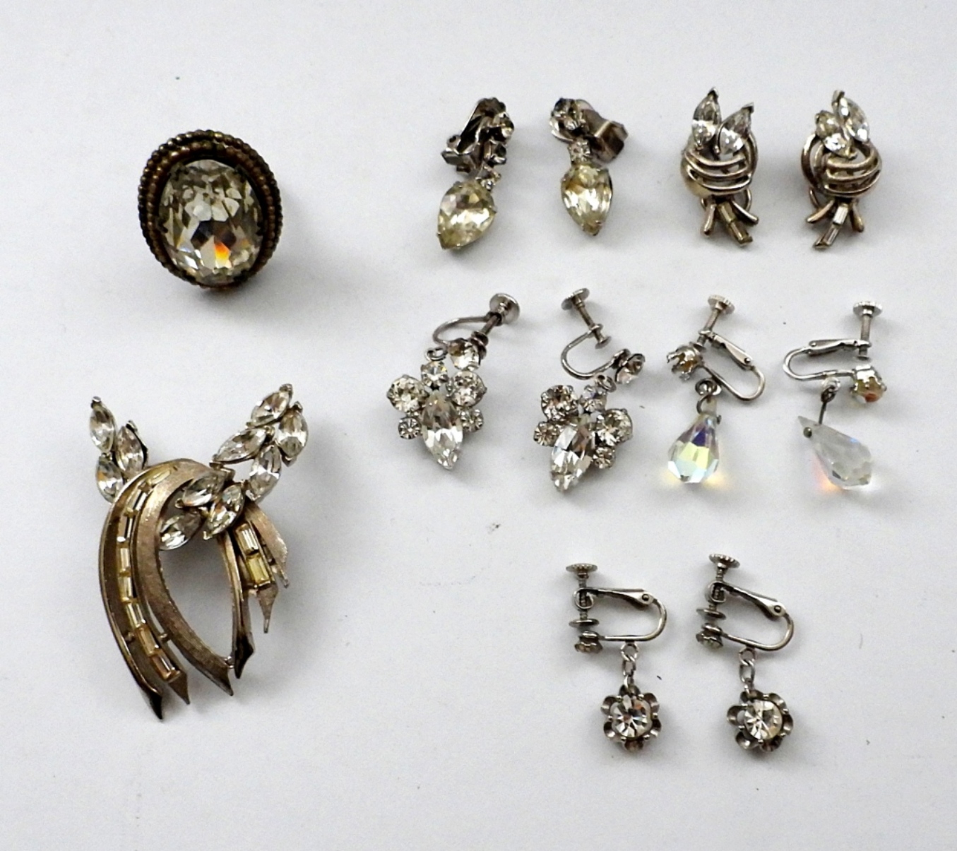 ADJUSTABLE RING WITH LARGE CLEAR GEMSTONE, BROOCH PIN, (5) PAIRS OF CLIP-ON & SCREW BACK EARRINGS