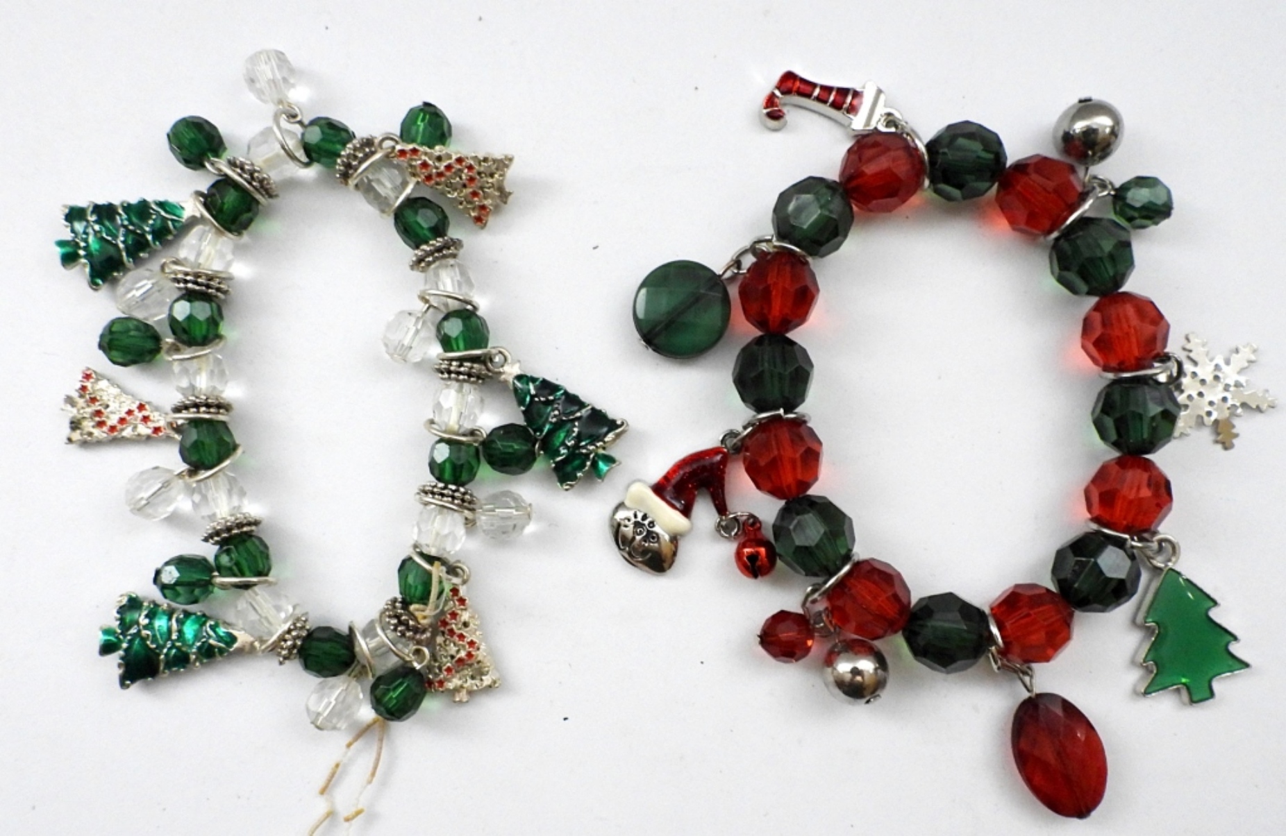 STRETCHY BRACELETS WITH BEADS & CHRISTMAS CHARMS, CHRISTMAS TREE BROOCH PIN