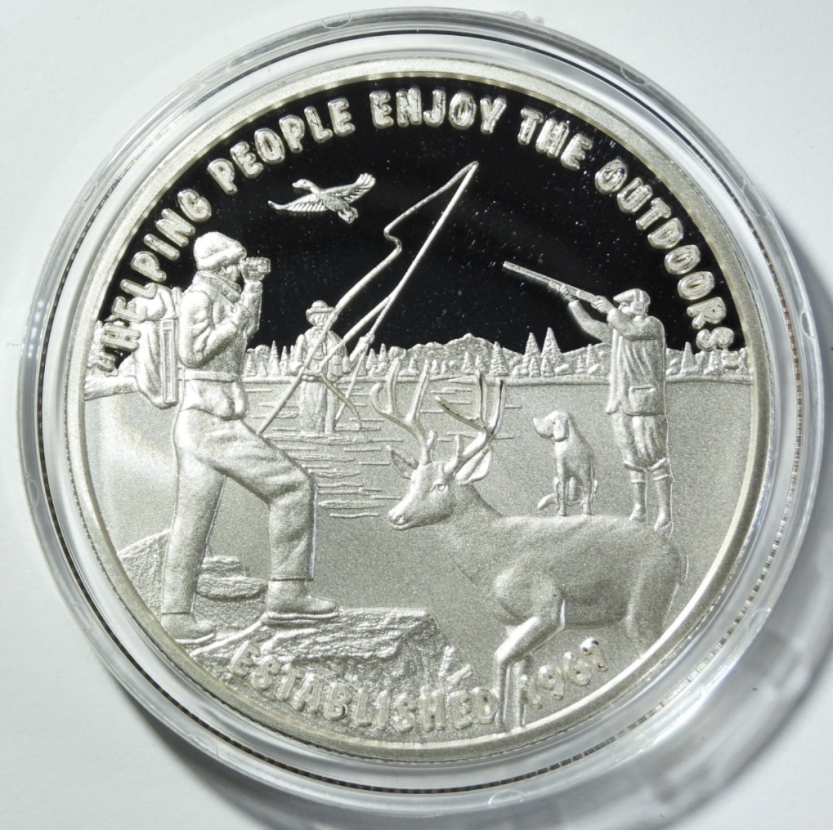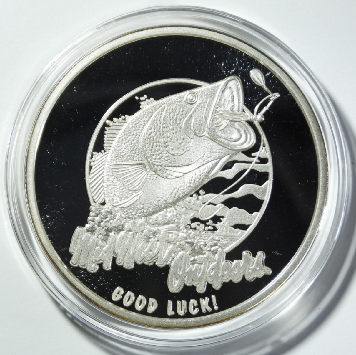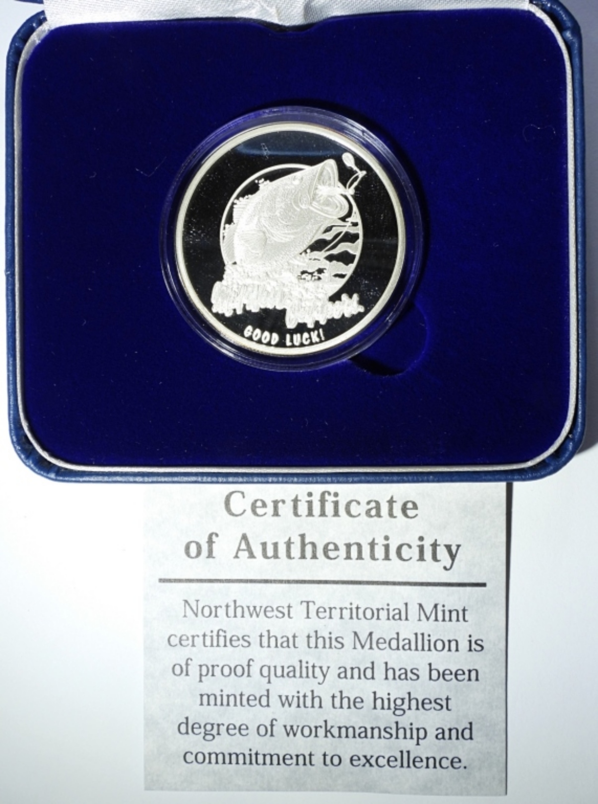 MIDWEST OUTDOORS GOOD LUCK MEDALLION “HELPING PEOPLE ENJOY THE OUTDOORS” IN DISPLAY BOX WITH COA. NORTHWEST TERRITORIAL MINT.