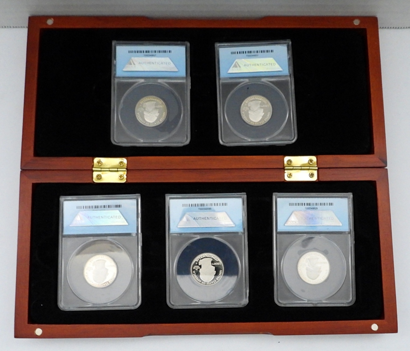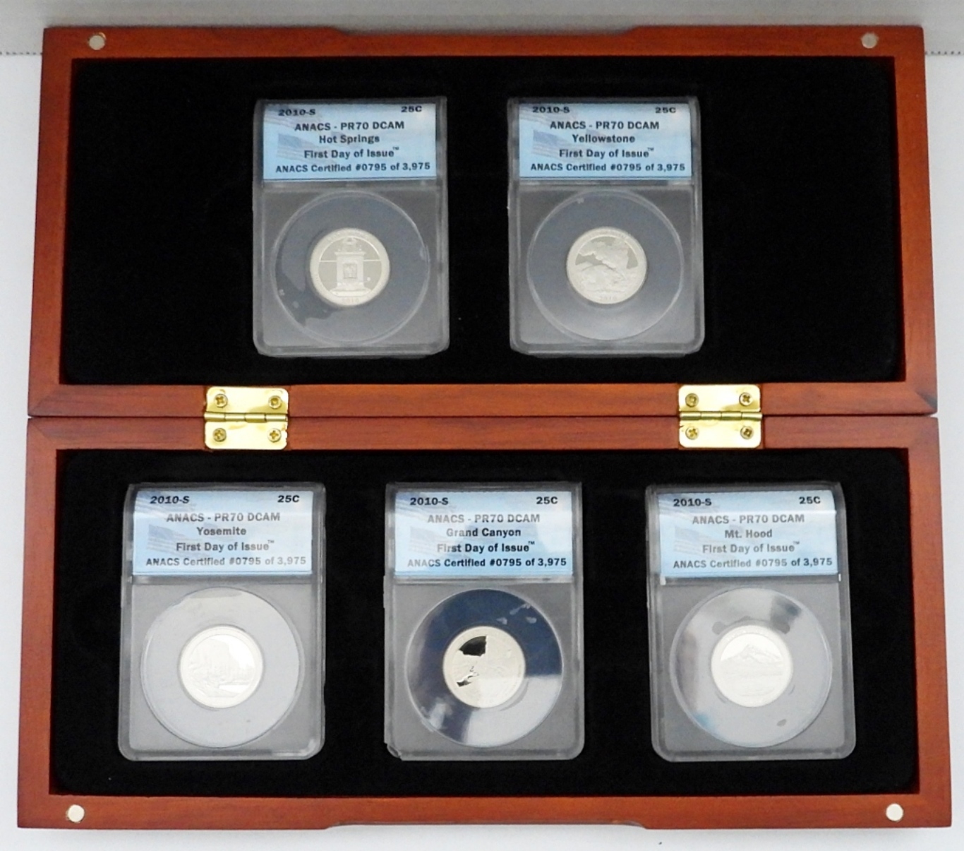 (5) FIRST DAY OF ISSUE CLAD QUARTERS IN WOODEN DISPLAY CASE W/ COA. HOT SPRINGS, YELLOWSTONE, YOSEMITE, GRAND CANYON, & MT. HOOD.