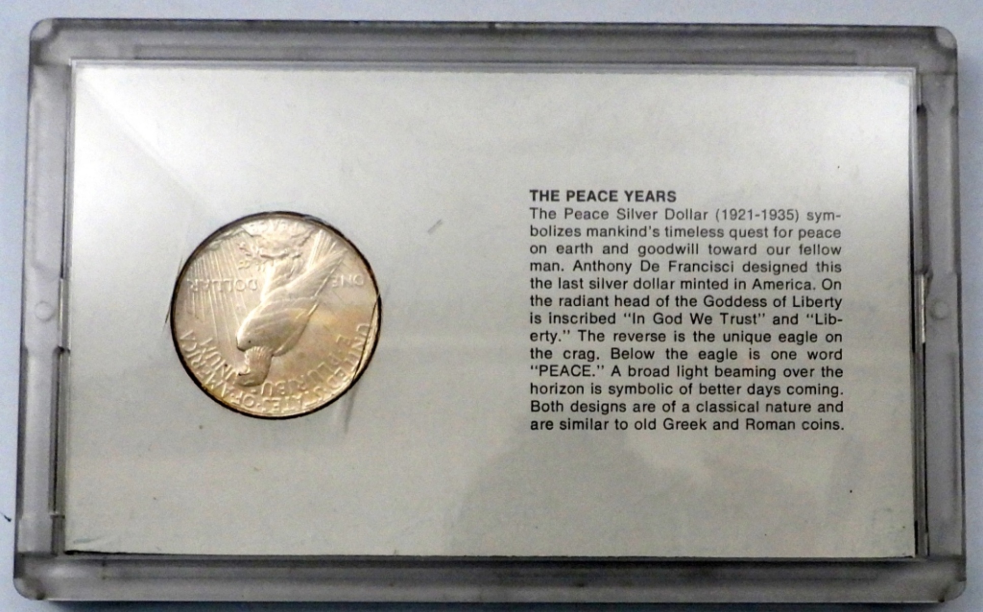 VF PEACE DOLLAR IN INFORMATIONAL SLAB “THE PEACE YEARS”
