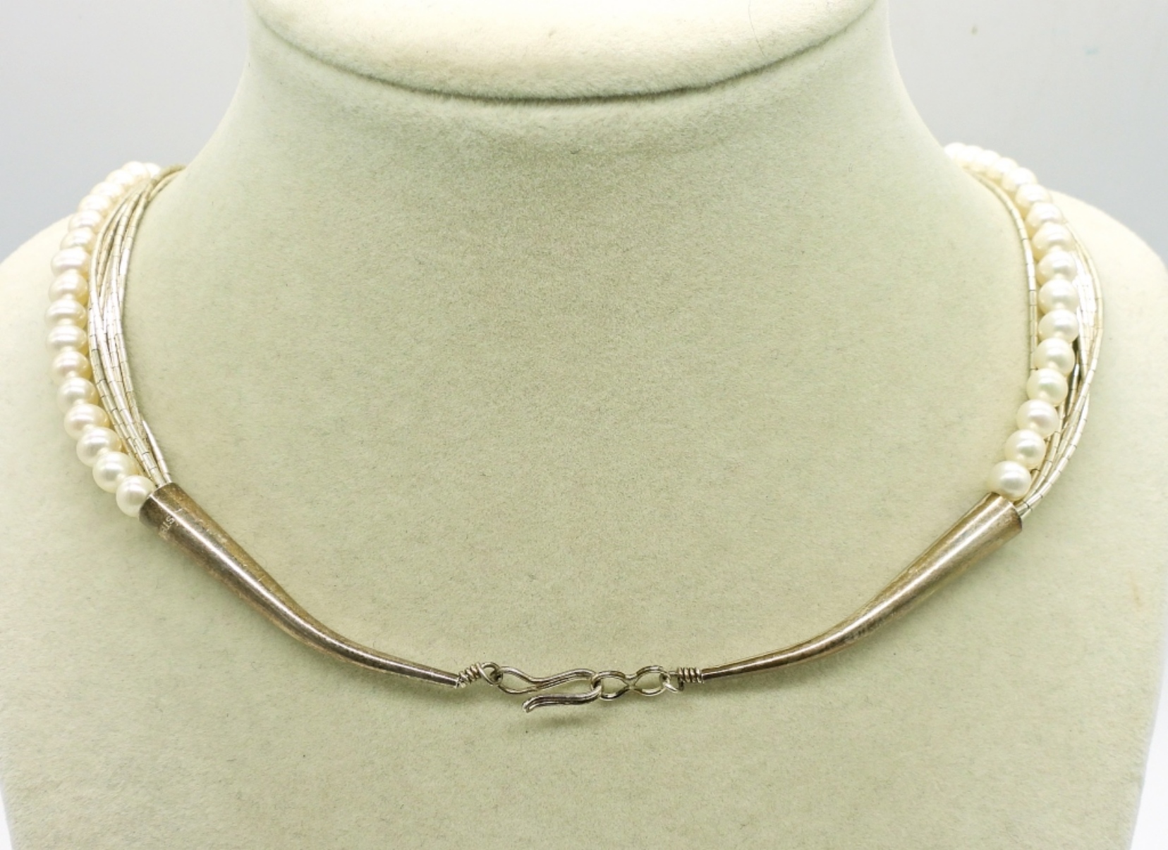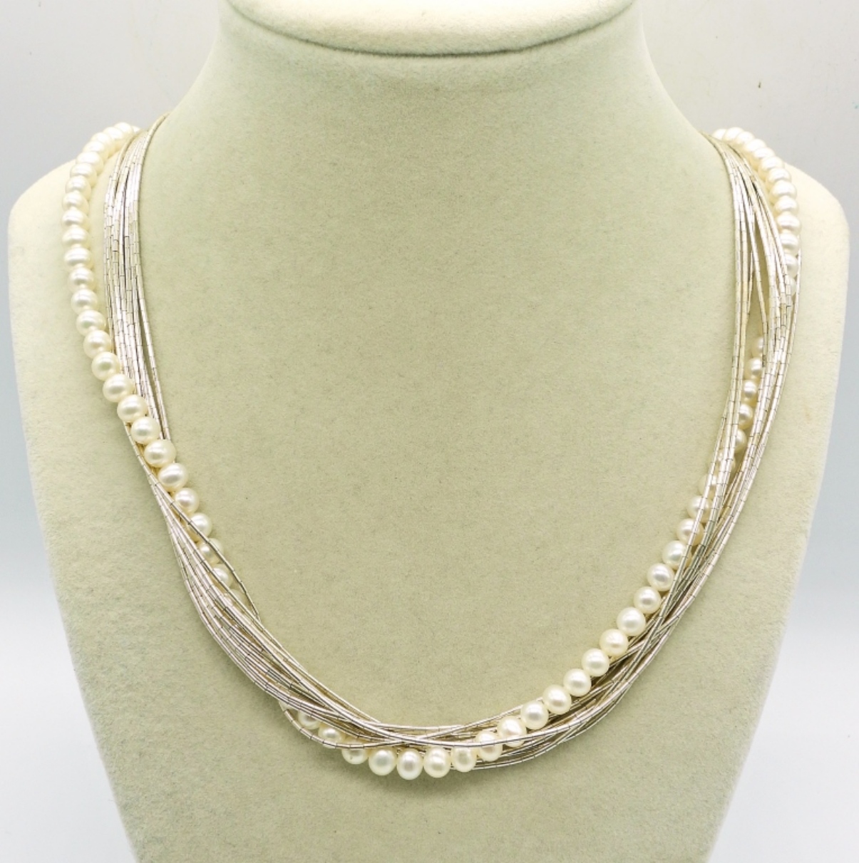 24″ LIQUID STERLING & PEARL NECKLACE. MARKED “STERLING”. 29.8 DWT