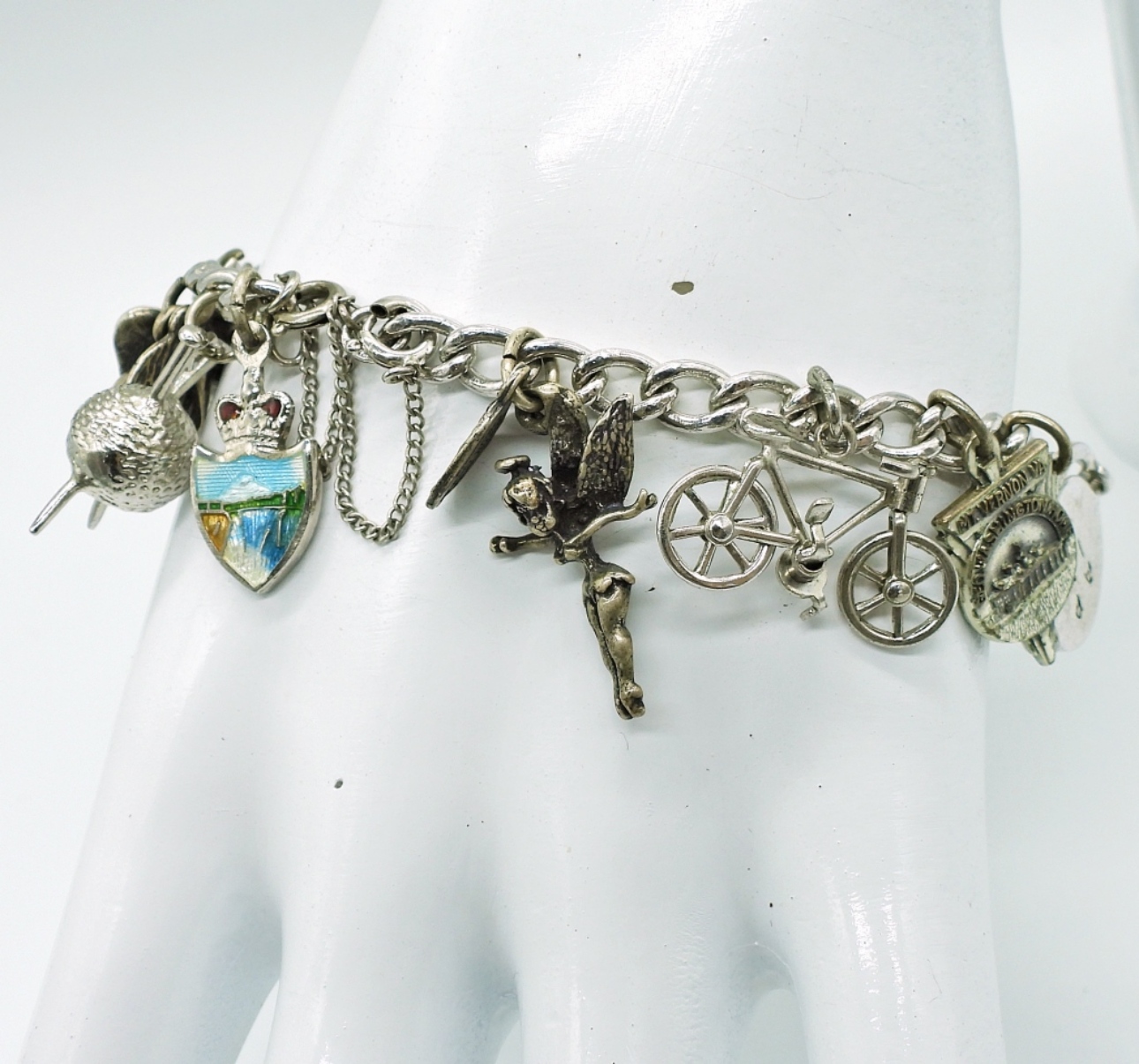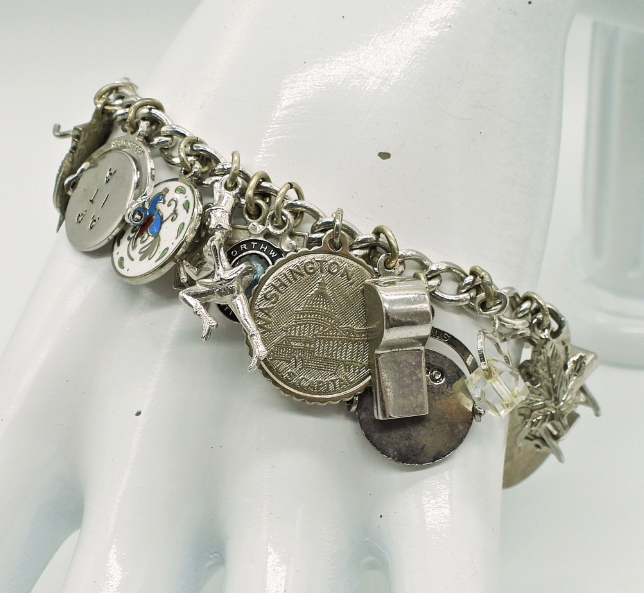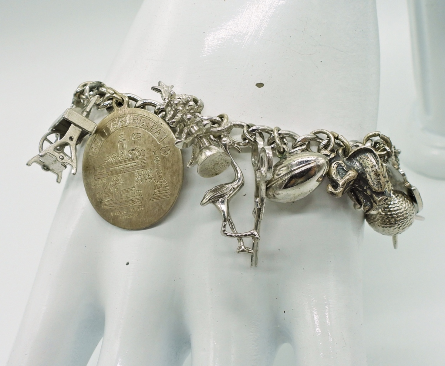 VINTAGE STERLING CHARM BRACELET WITH 22 STERLING CHARMS. 7″ BRACELET. 34.8 DWT