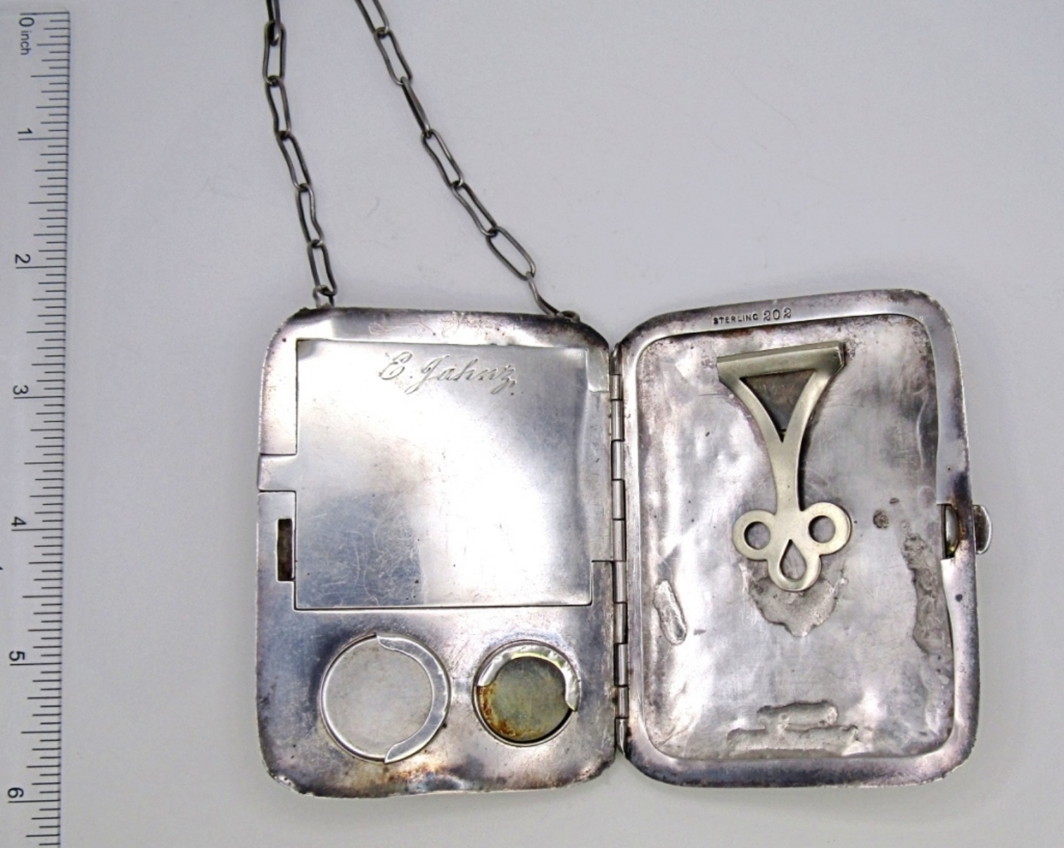 78 DWT. 3.5″ x 2.5″ CLUTCH ON 12″ CHAIN. ENGRAVED “ELSA” STAMPED STERLING INSIDE
