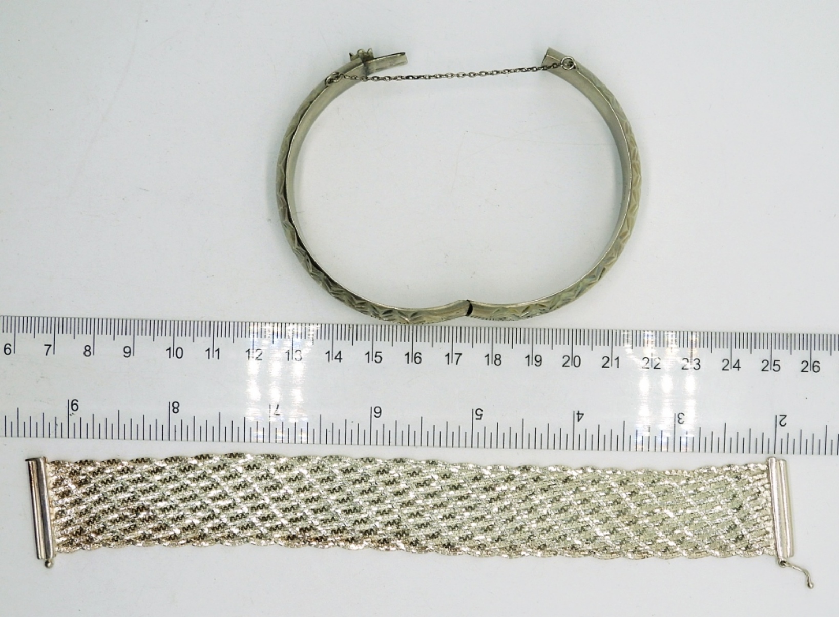 One Mesh Style, Italian Sterling Silver Bracelet. 7.5″ long / 1″ wide. Sterling Silver Etched Bangle with hinge, 7″. (30.9 DWT)