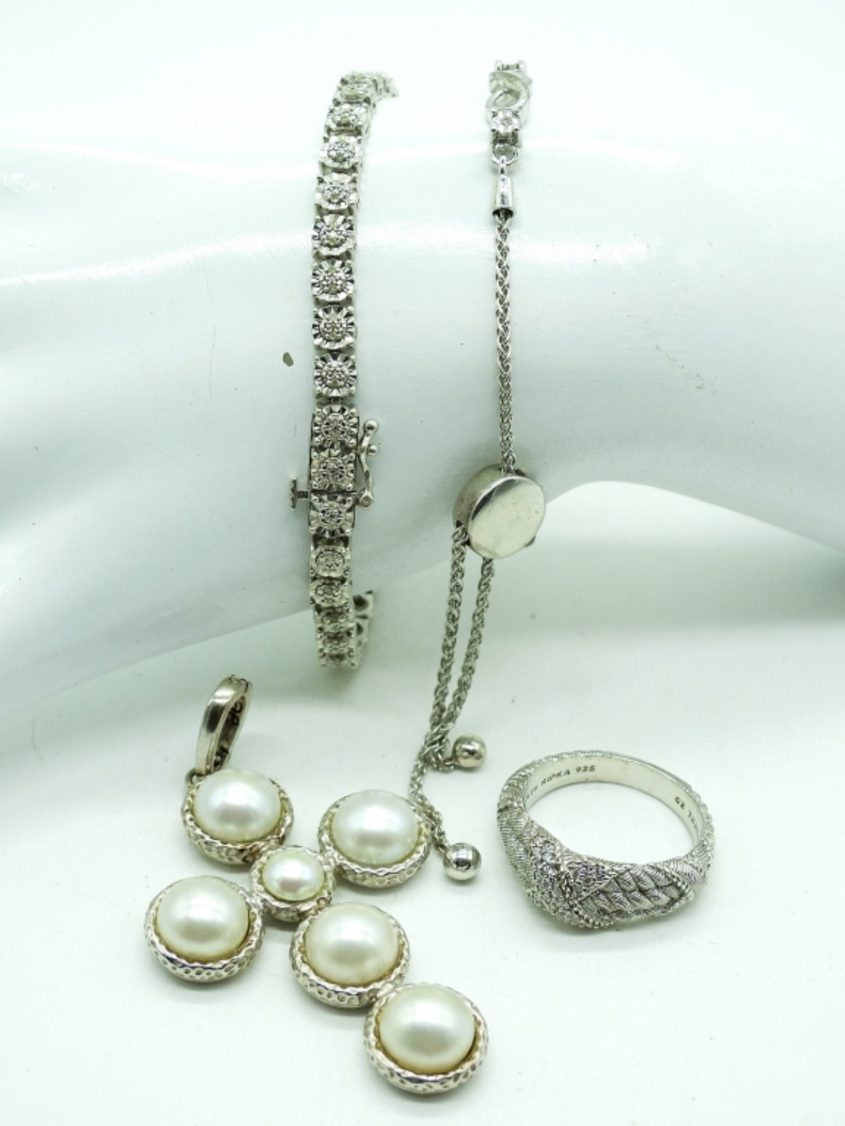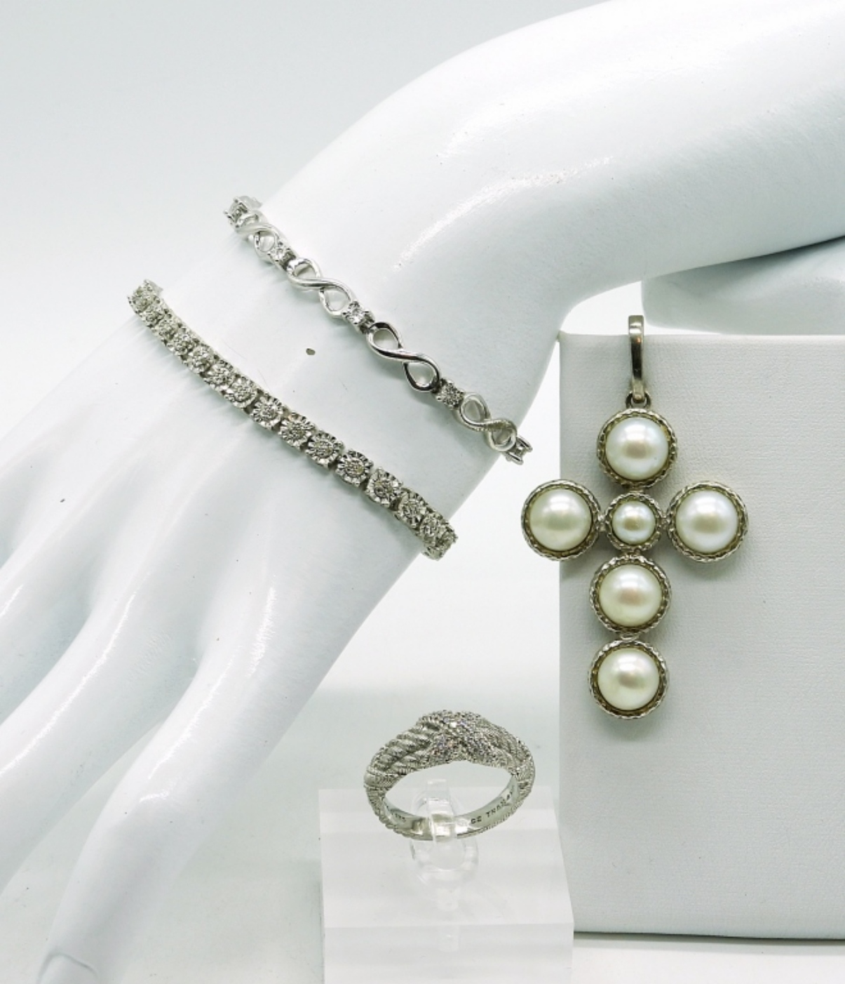 Two Sterling Bracelets. Adjustable bracelet has tiny genuine diamonds. Sterling & White Gemstone Size 9 Ring. Sterling and Faux Pearl Cross Pendant. 25.1DWT