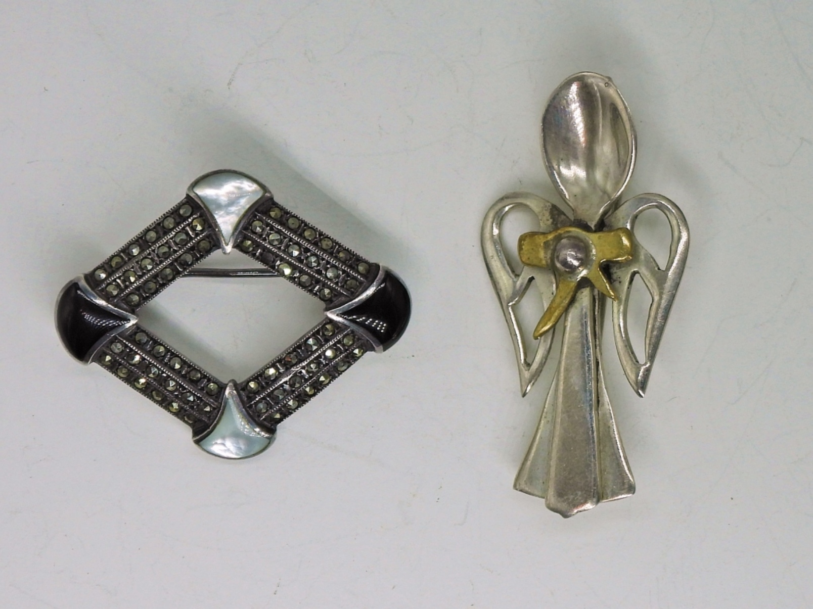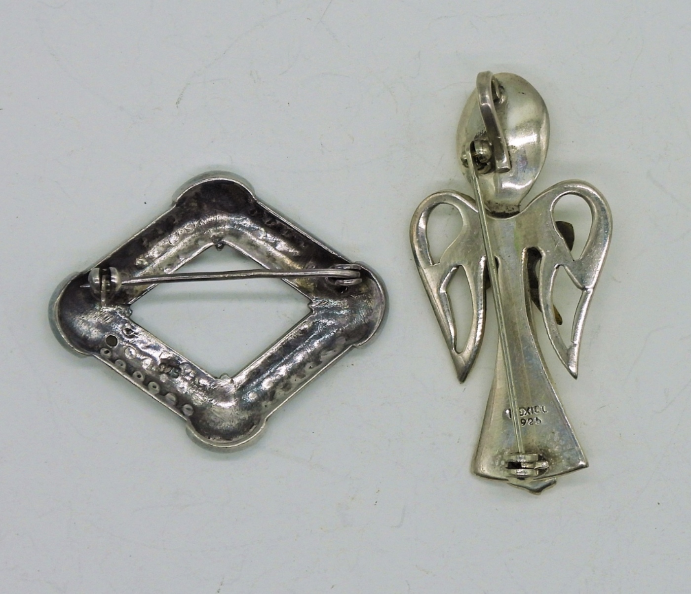 Two Sterling Pins, One Spoon Angel and One with Marcasite with Gemstones. 11 DWT
