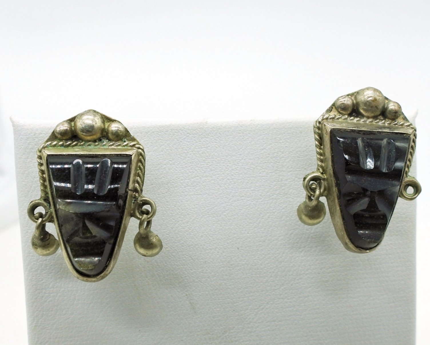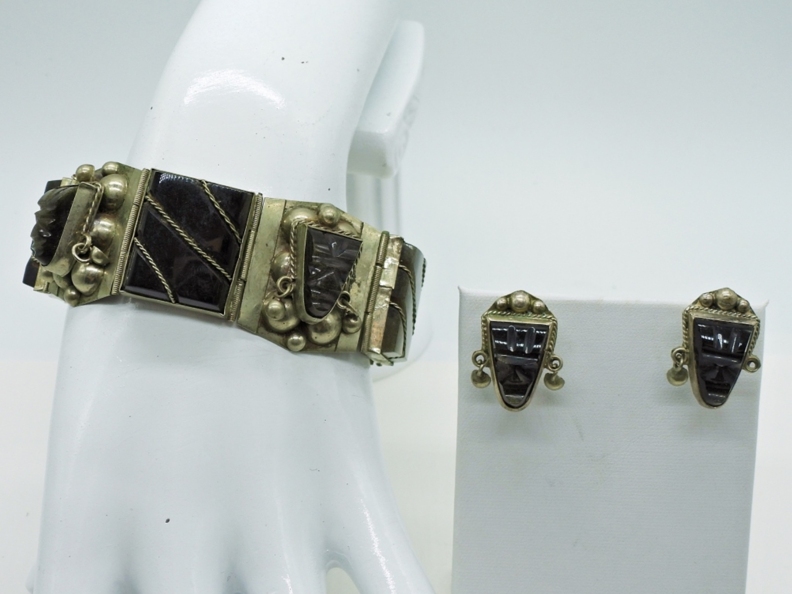 Vintage Sterling Bracelet & Matching Earrings with Onyx Gemstones. Marked “Sterling 925 N.S. Taxco”. 7.5″. 44.9 DWT