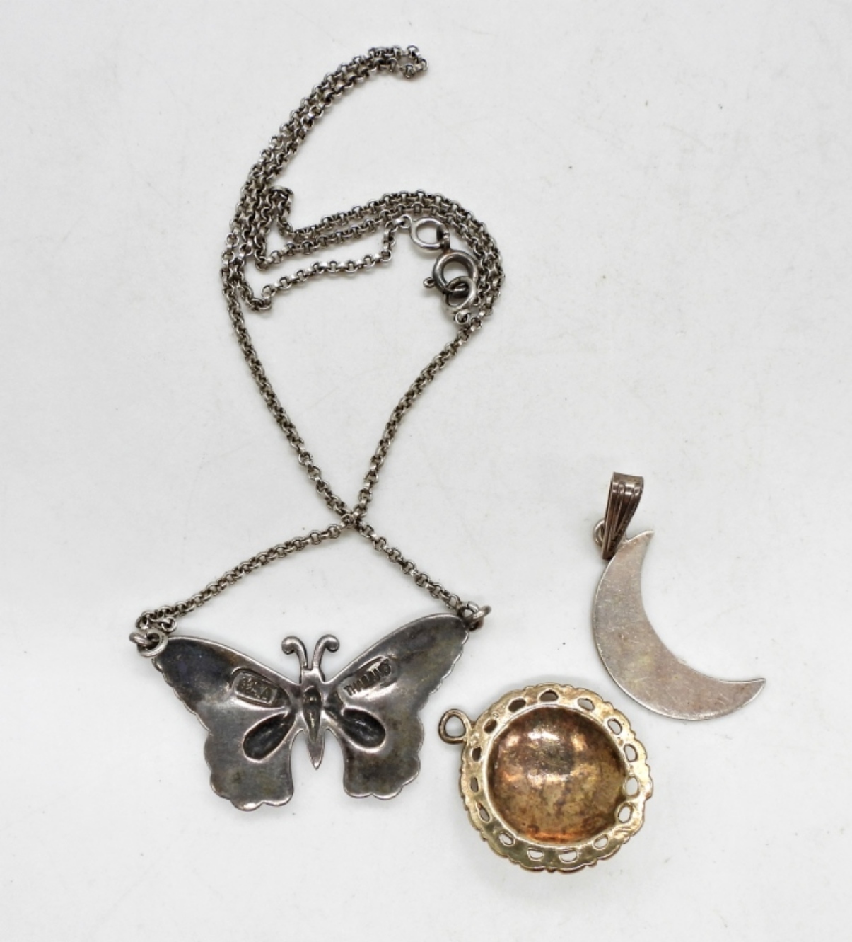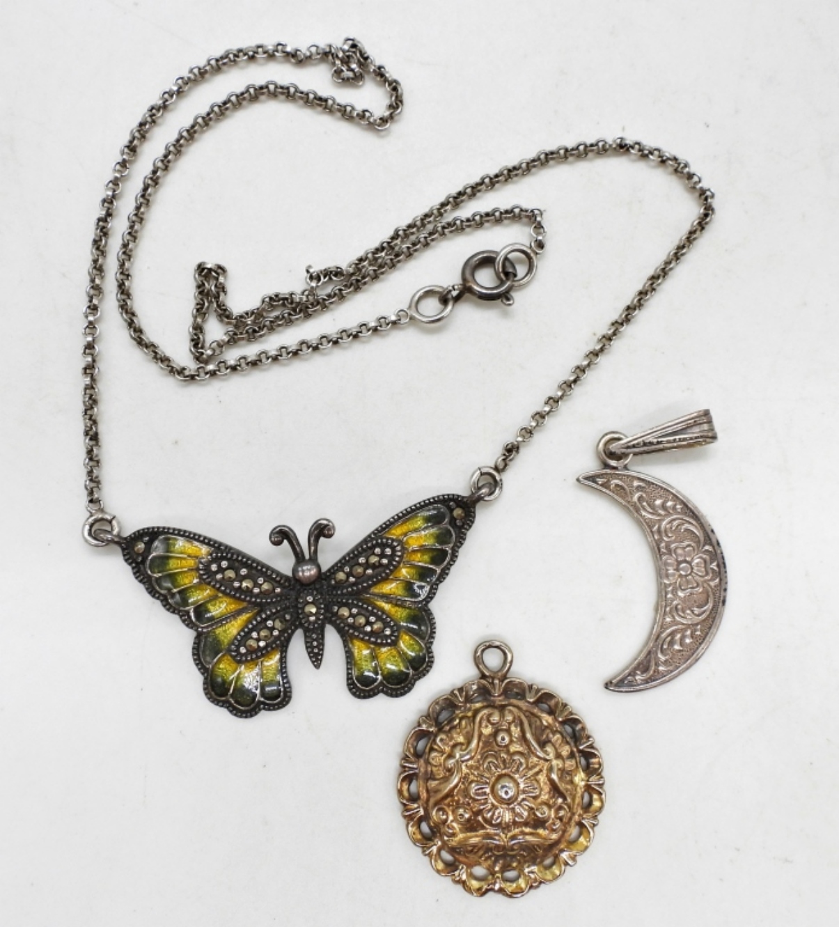 PRETTY STERLING BUTTERFLY ENAMEL NECKLACE, 14″. MARKED 925 THAILAND. CUTE STERLING CRESCENT MOON PENDANT AND A GOLD TONE STERLING ROUND PENDANT. 9.1 DWT
