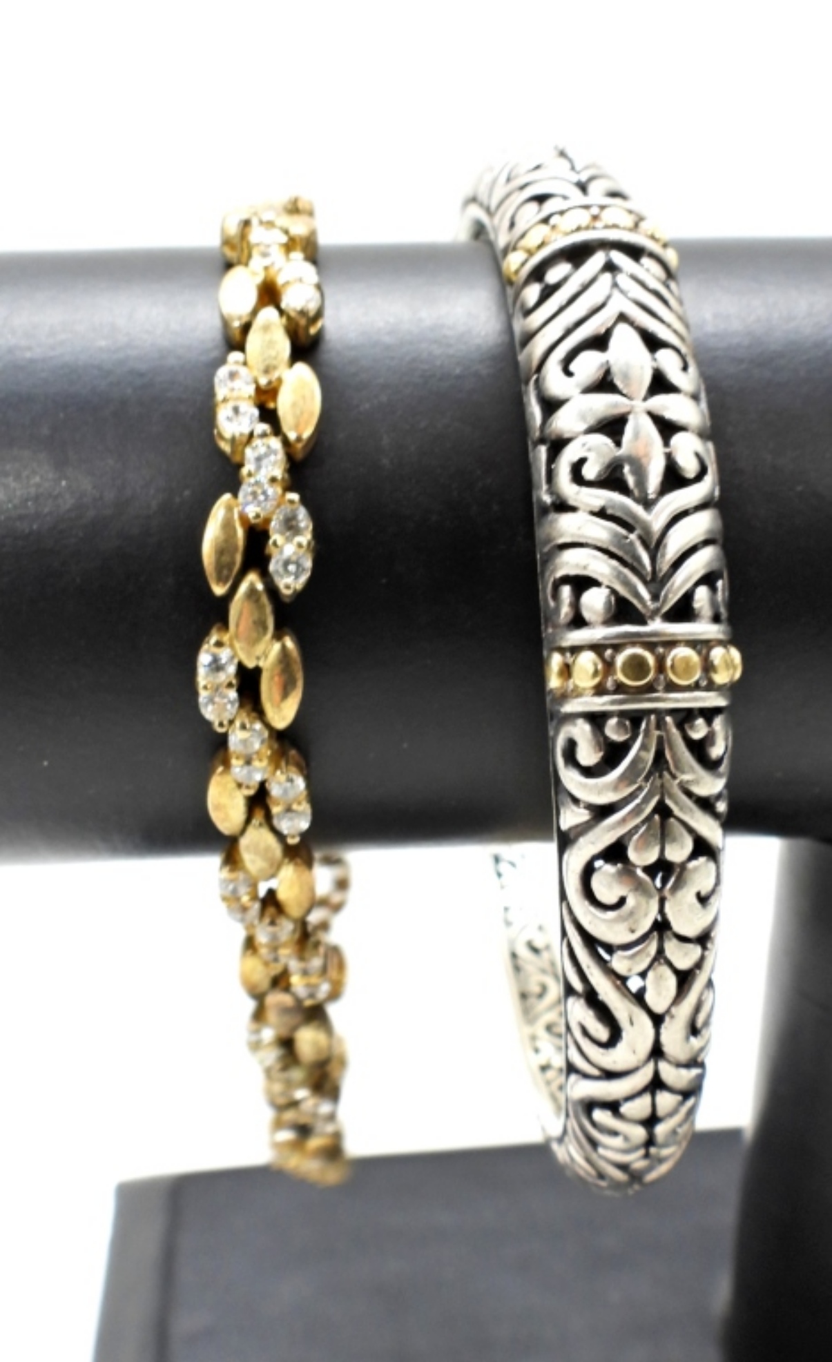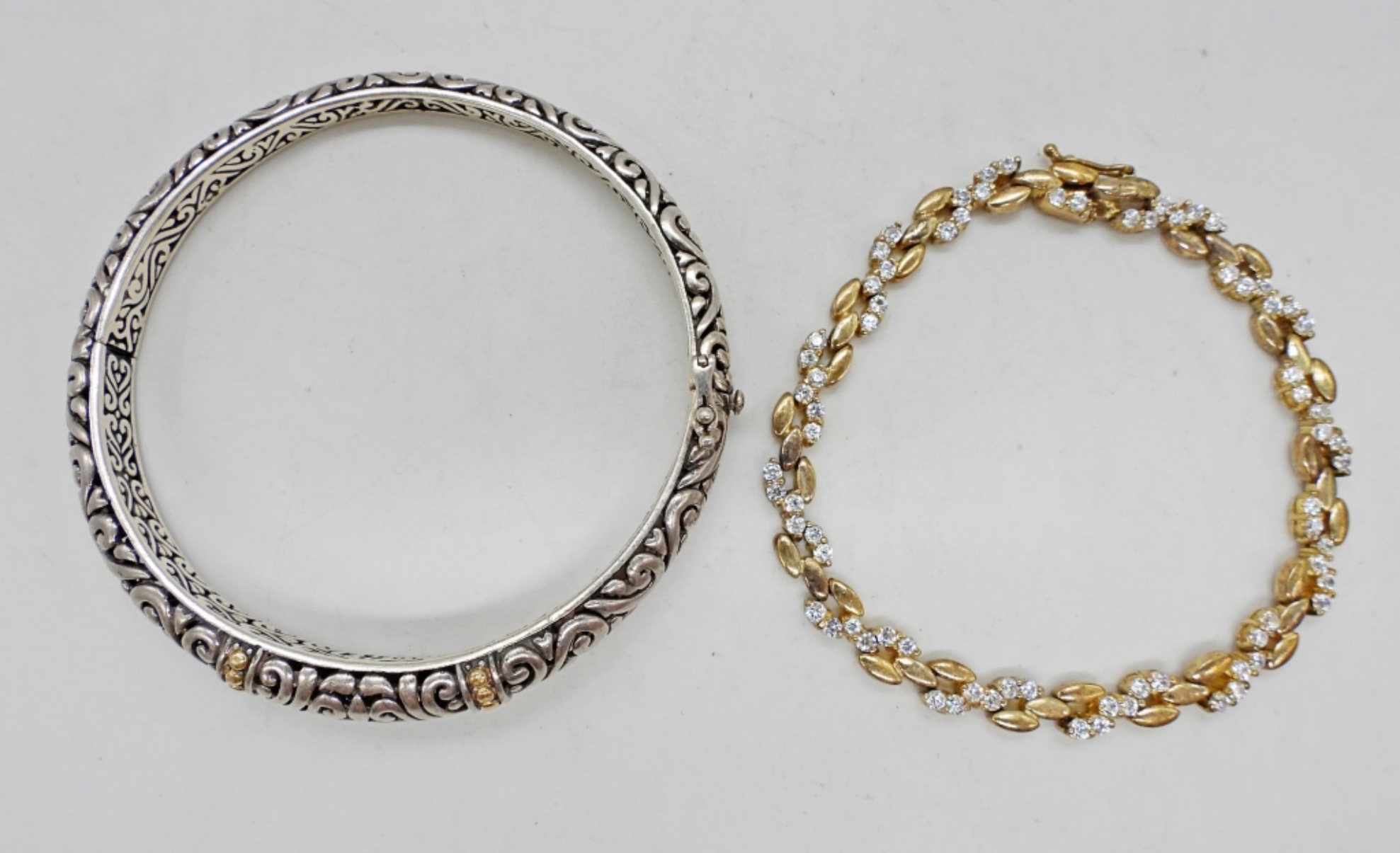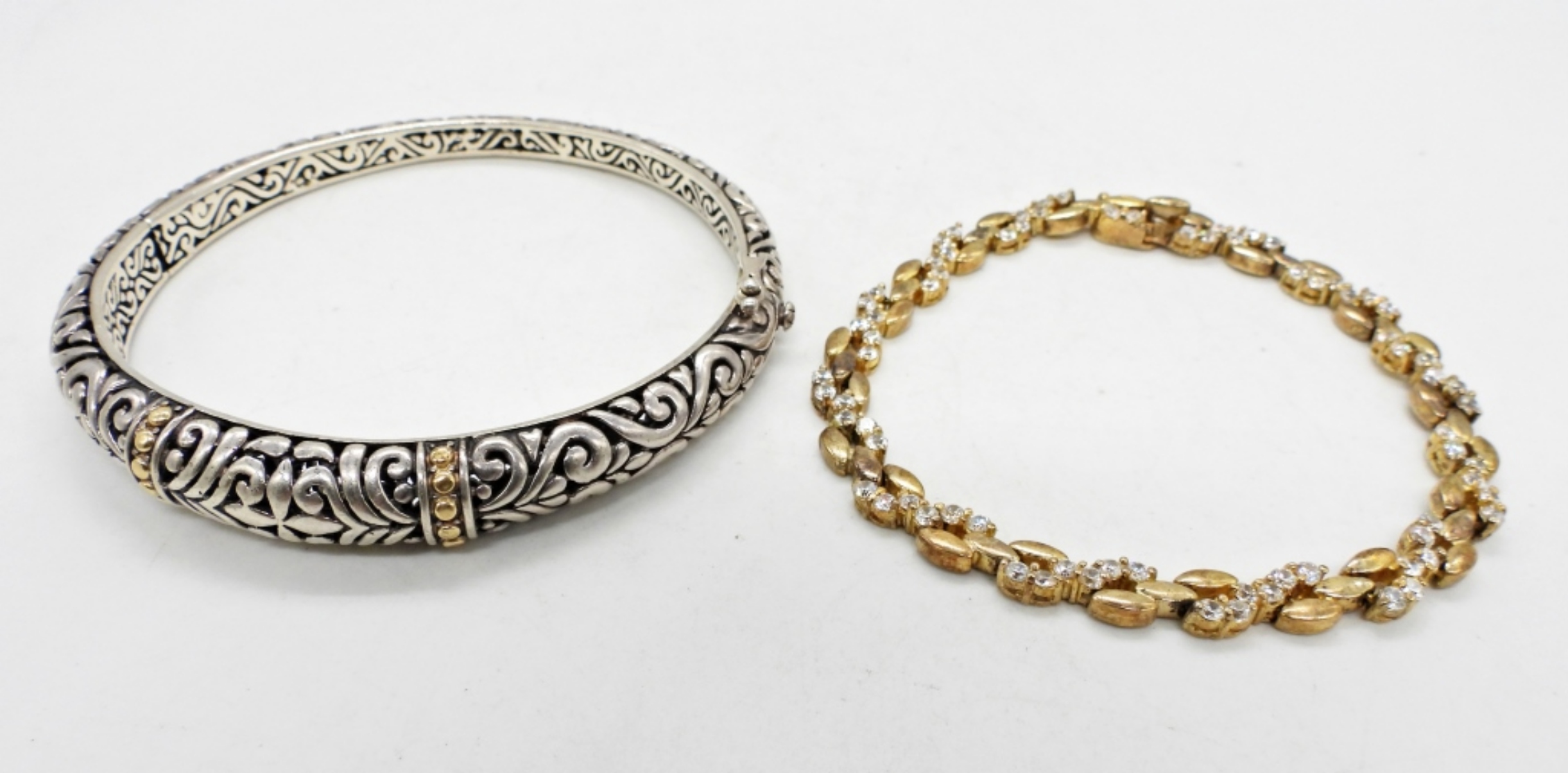 ONE STERLING BANGLE BRACELET WITH GOLD TONE ACCENTS, ONE GOLD TONE 7″ WHITE GEMSTONE BRACELET. 24.2 DWT