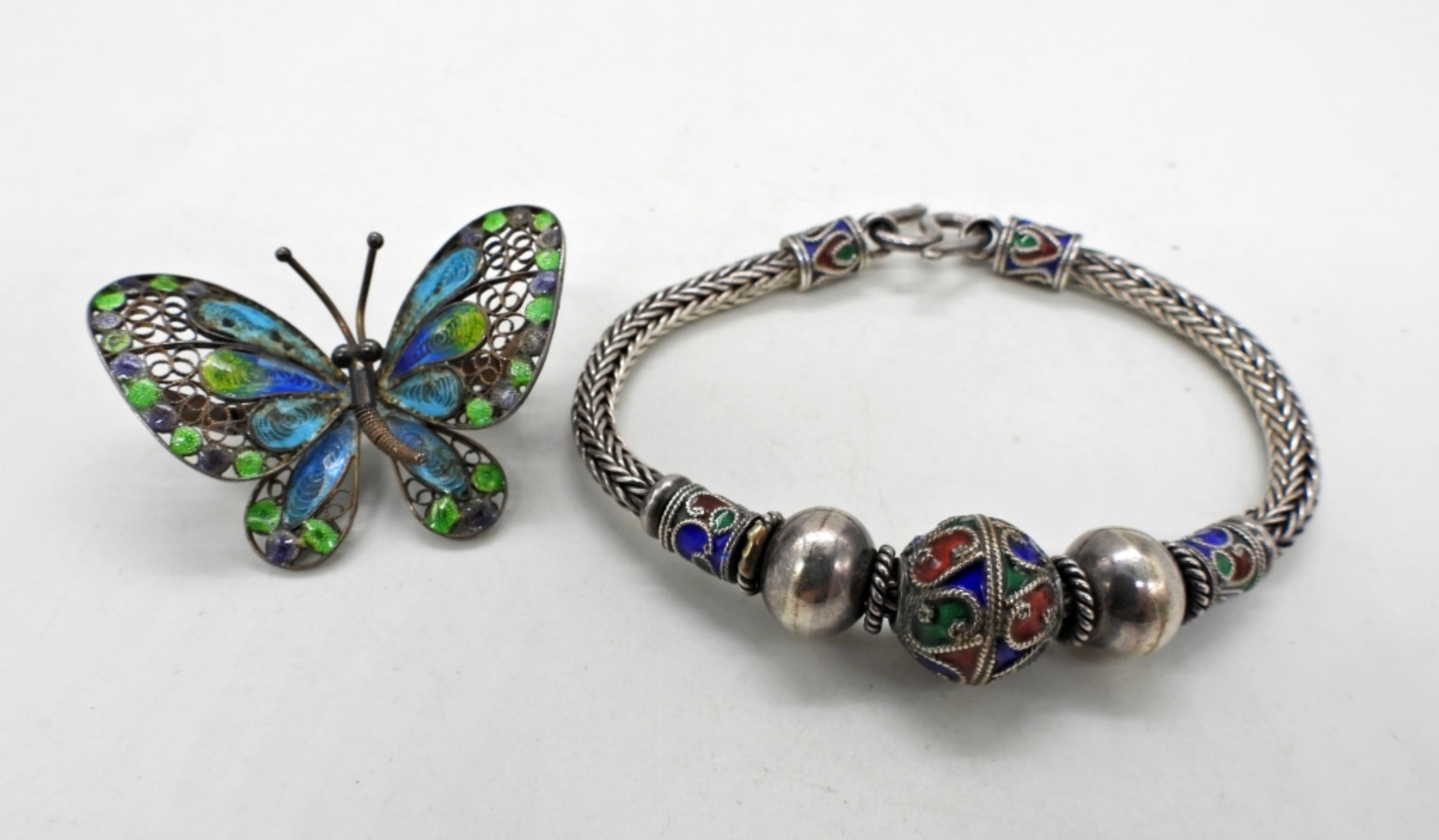 ADORABLE VINTAGE WIRE WRAPPED BUTTERFLY PIN WITH GREEN AND BLUE ENAMEL. STERLING BRACELET WITH ENAMEL, 7″. 21.6 DWT