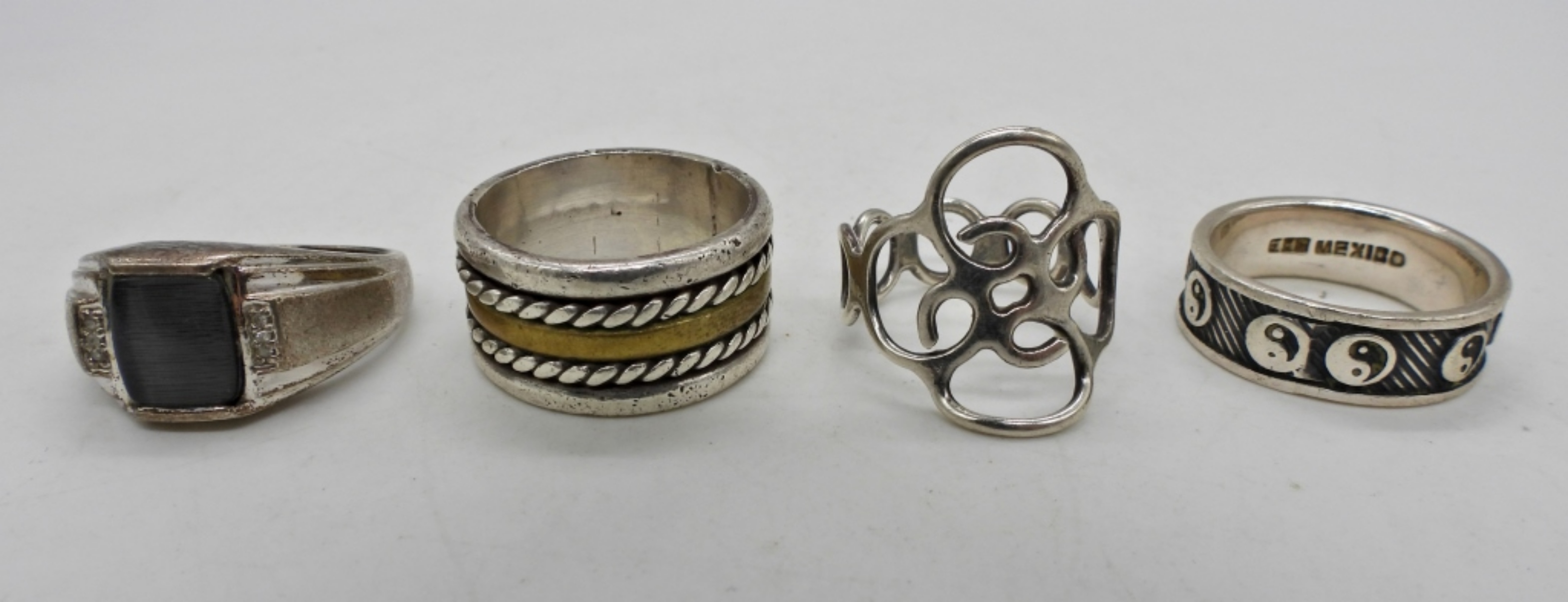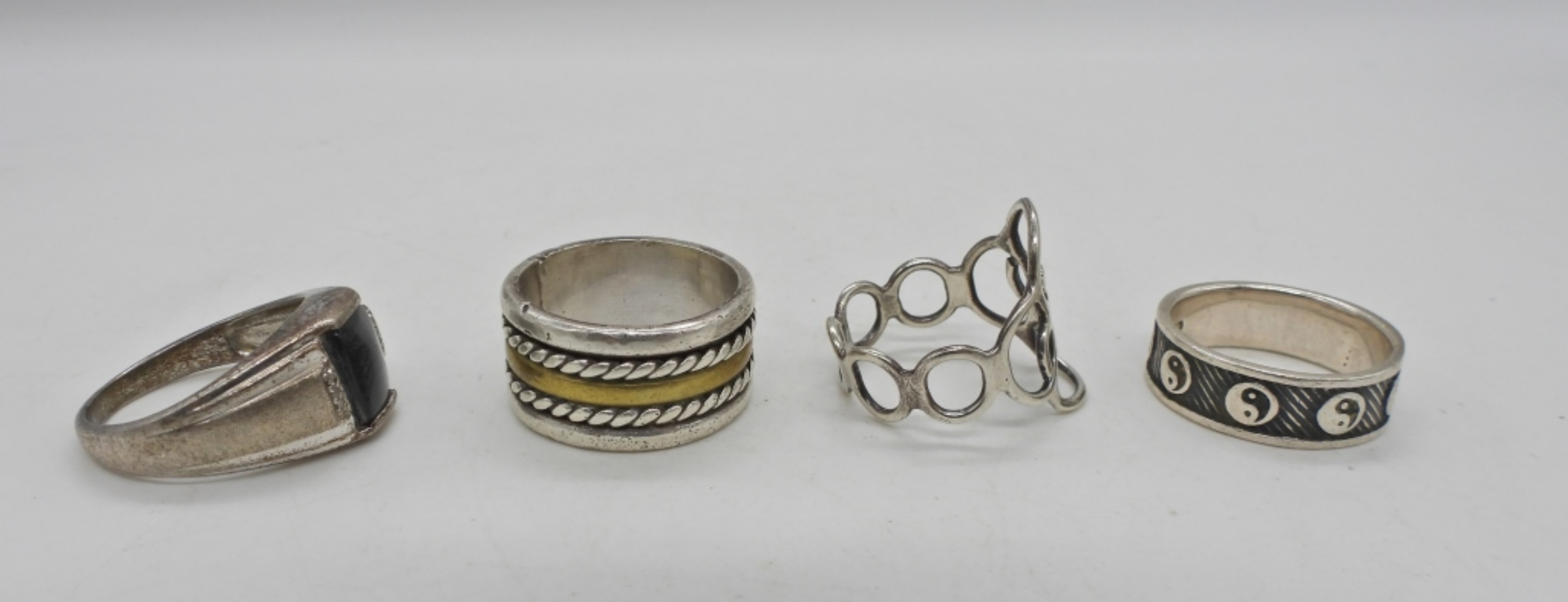 4 STERLING RINGS; CATS EYE, YIN YANG & 2 BANDS. SIZES 9, 9.5, 10, 8.5. 18.1 DWT