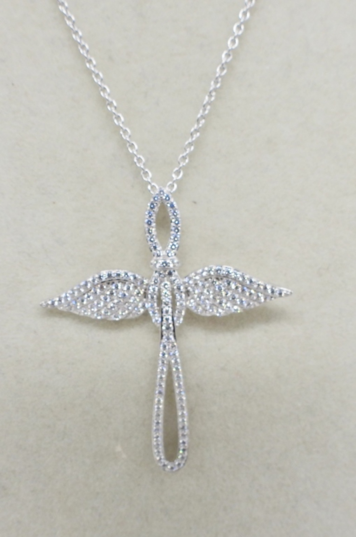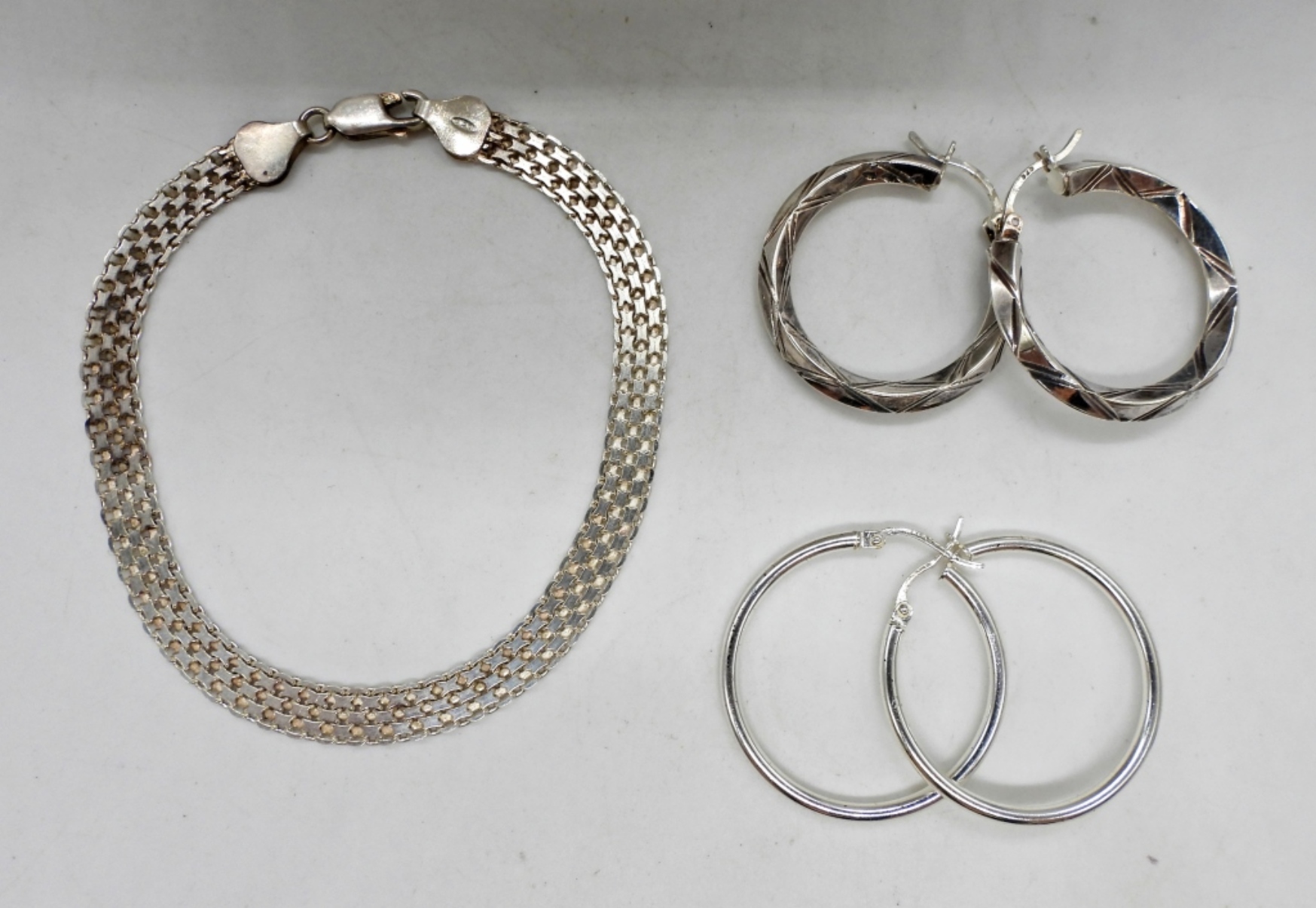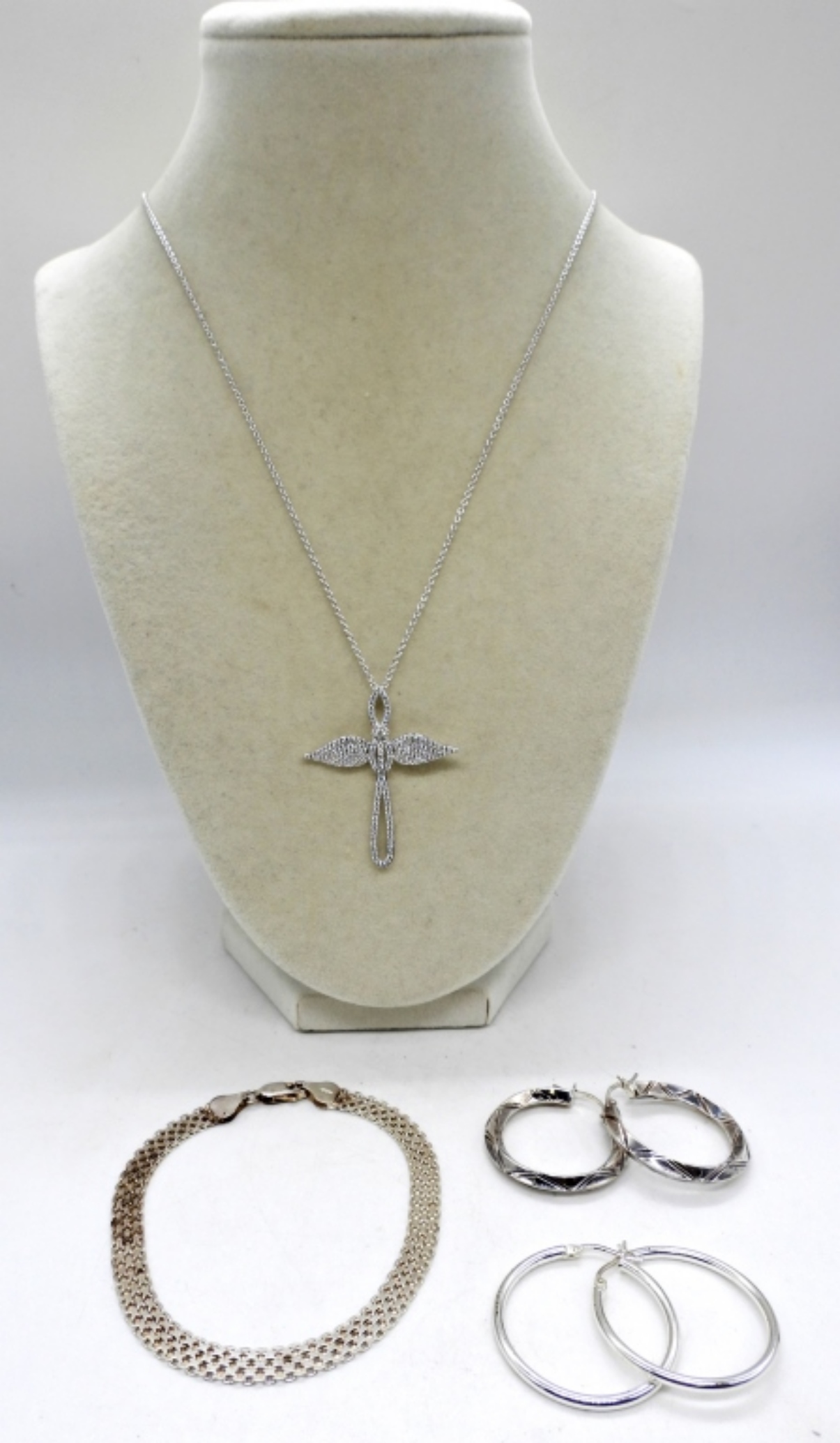 STERLING ANGEL PENDANT WITH CLEAR GEMSTONES (NOT DIAMONDS) ON A 20″ CHAIN. STERLING 8″ BRACELET AND TWO PAIR OF STERLING HOOPS. 11.7 DWT
