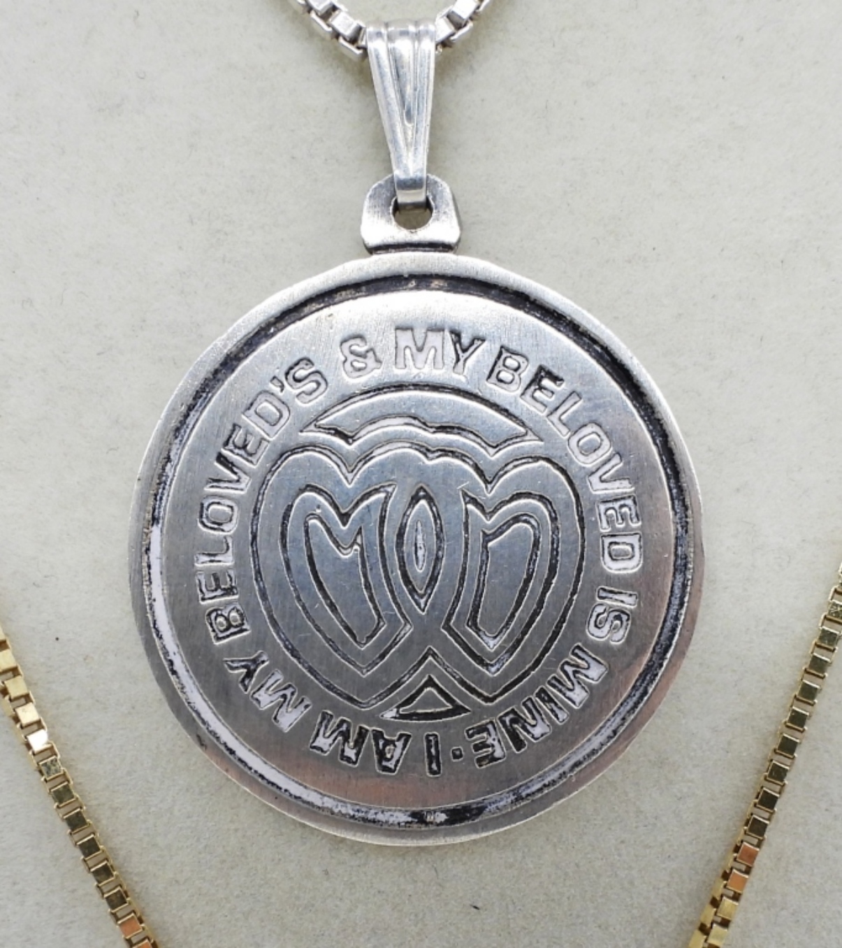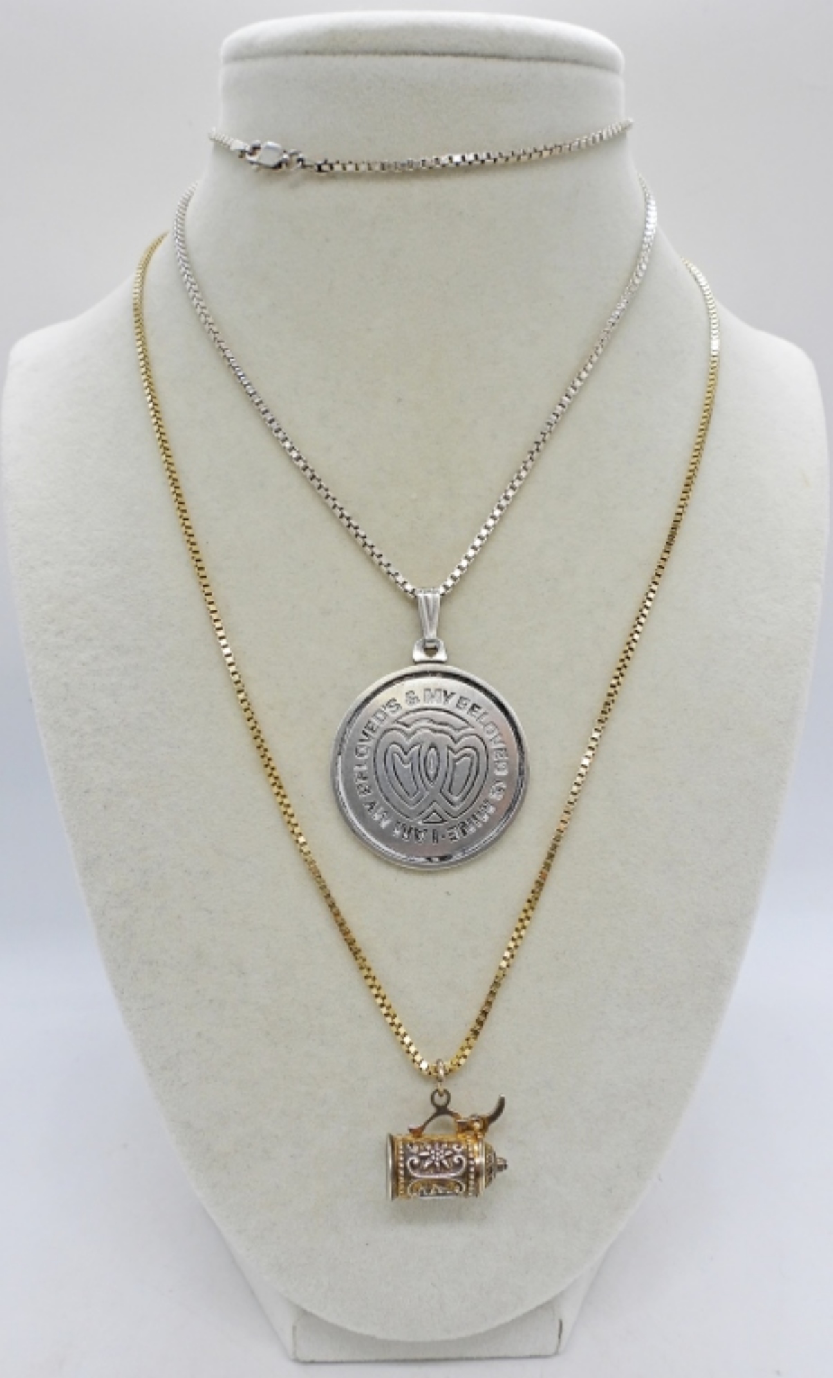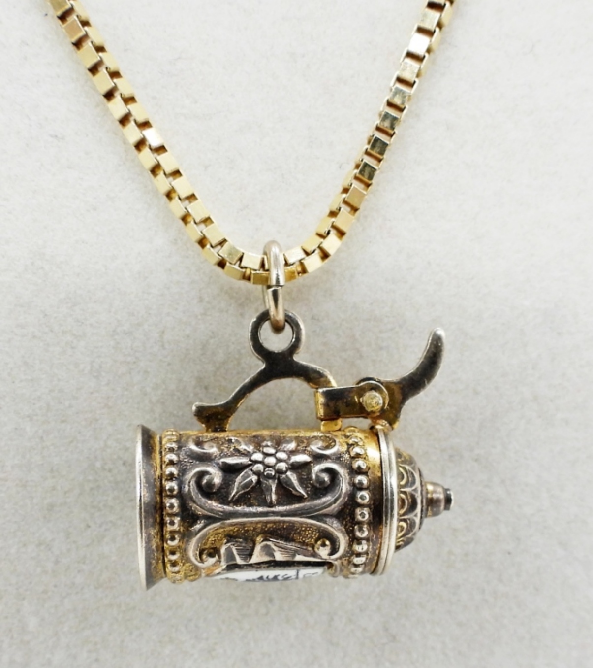 2 STERLING NECKLACES. GOLD TONE STERLING BOX CHAIN WITH BEER STEIN PENDANT (MARKED 800), 19″. STERLING BOX CHAIN, 23″ WITH ROUND STERLING PENDANT. 19.7 DWT