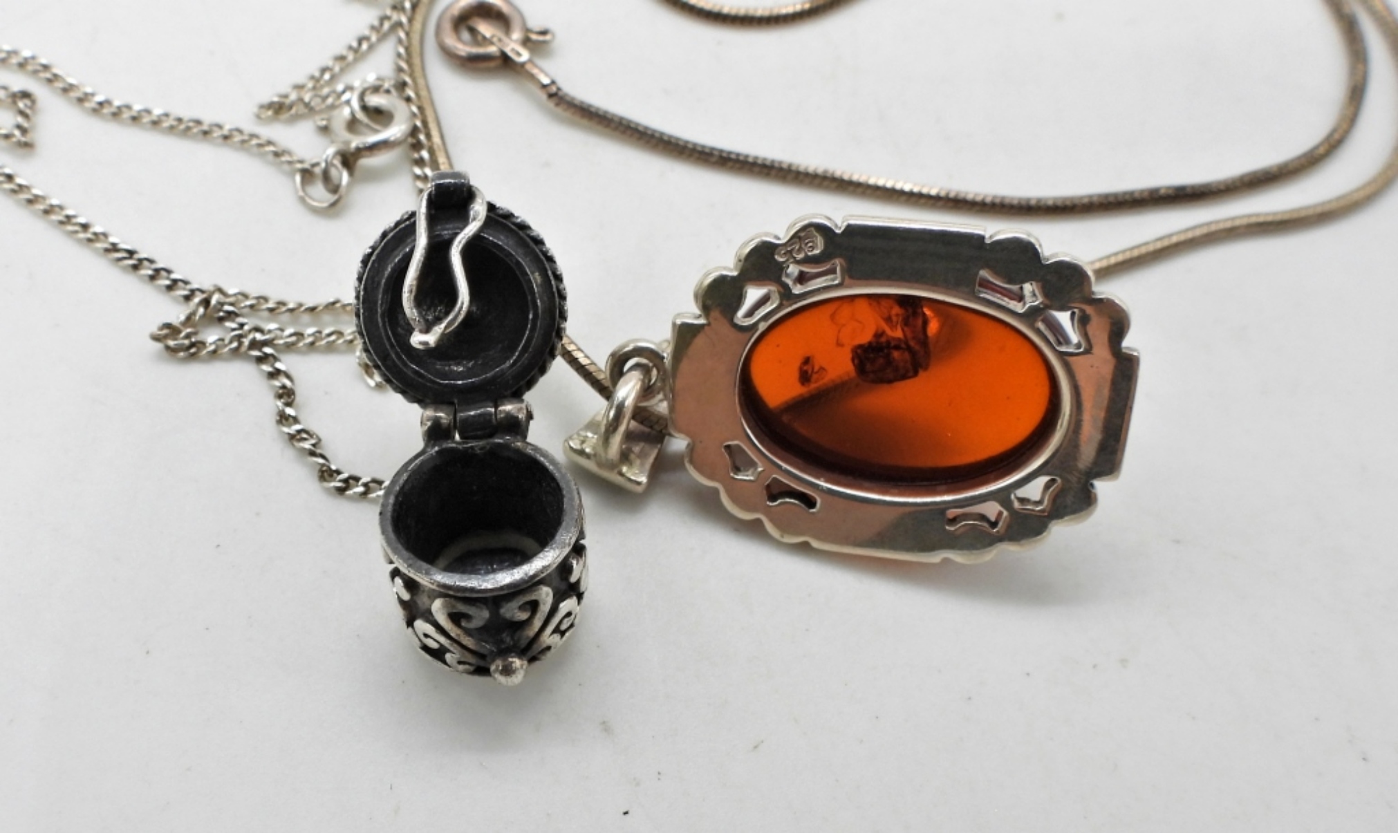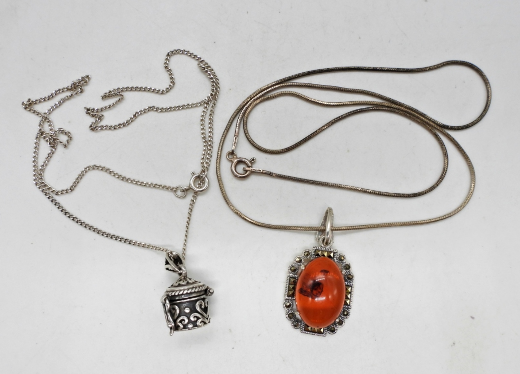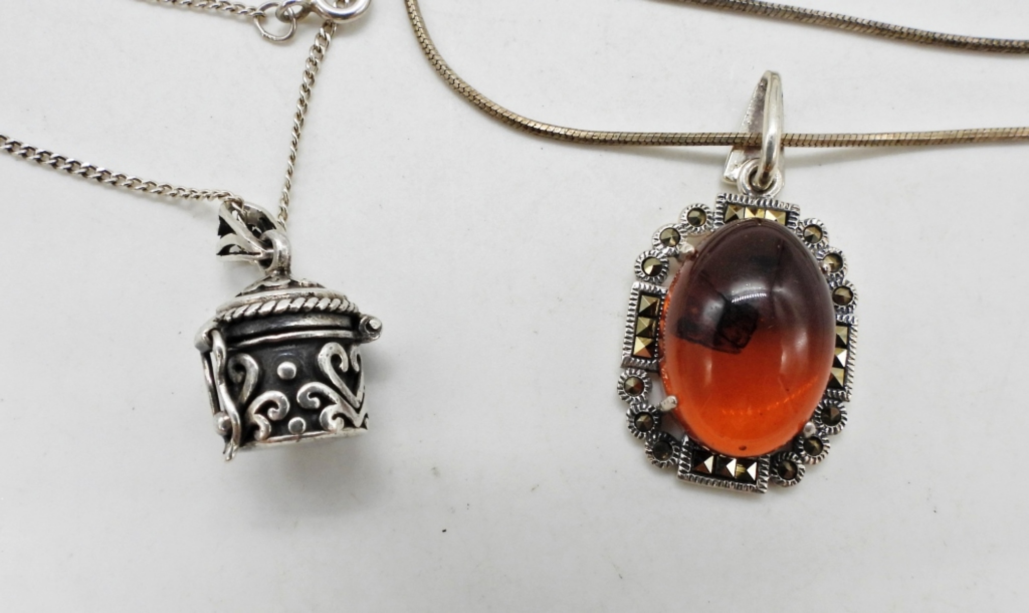 AMBER AND MARCASITE STERLING PENDANT ON A 19″ STERLING CHAIN. STERLING LOCKET BOX PENDANT ON AN 18″ CHAIN. 10 DWT