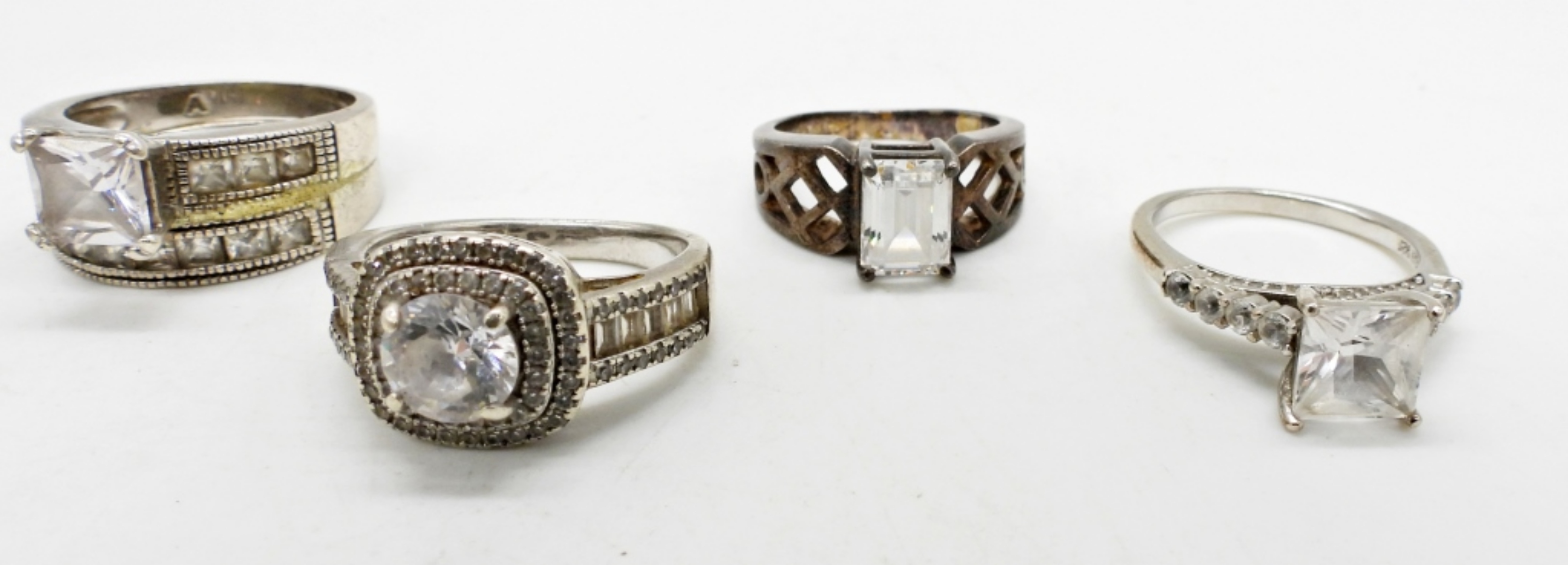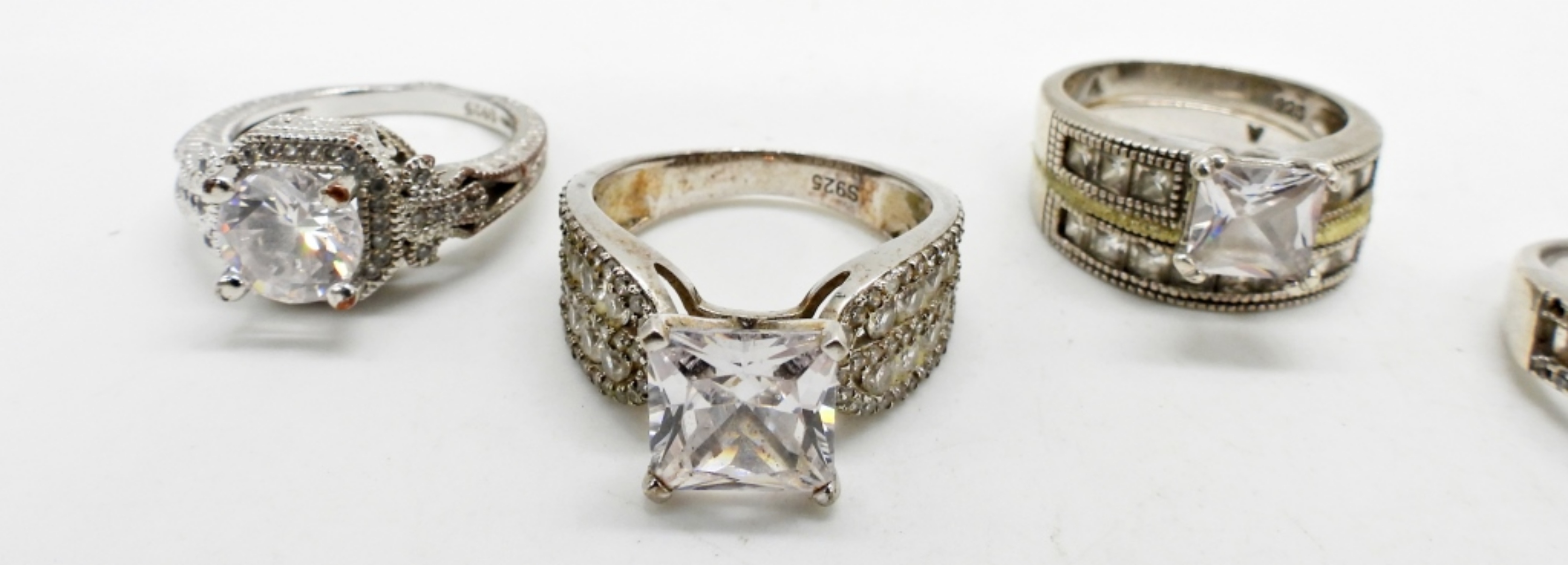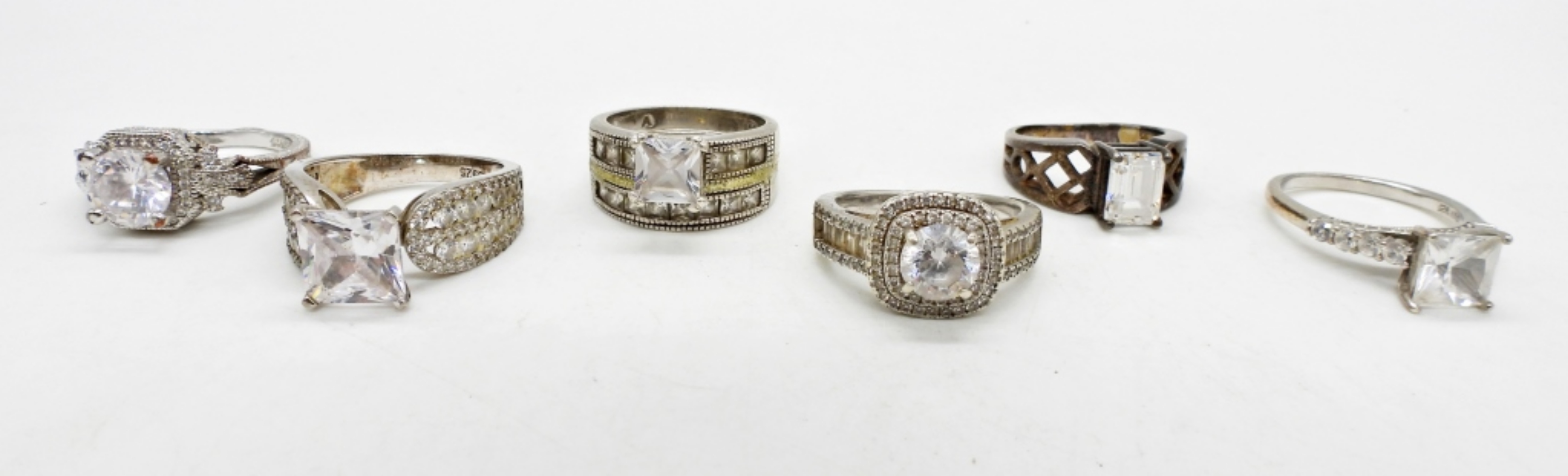 6 BRIDAL STYLE RINGS, WITH CLEAR GEMSTONES. SIZES 6, 6 3/4, 6.5, 7, 7.5, 9. 19.4 DWT