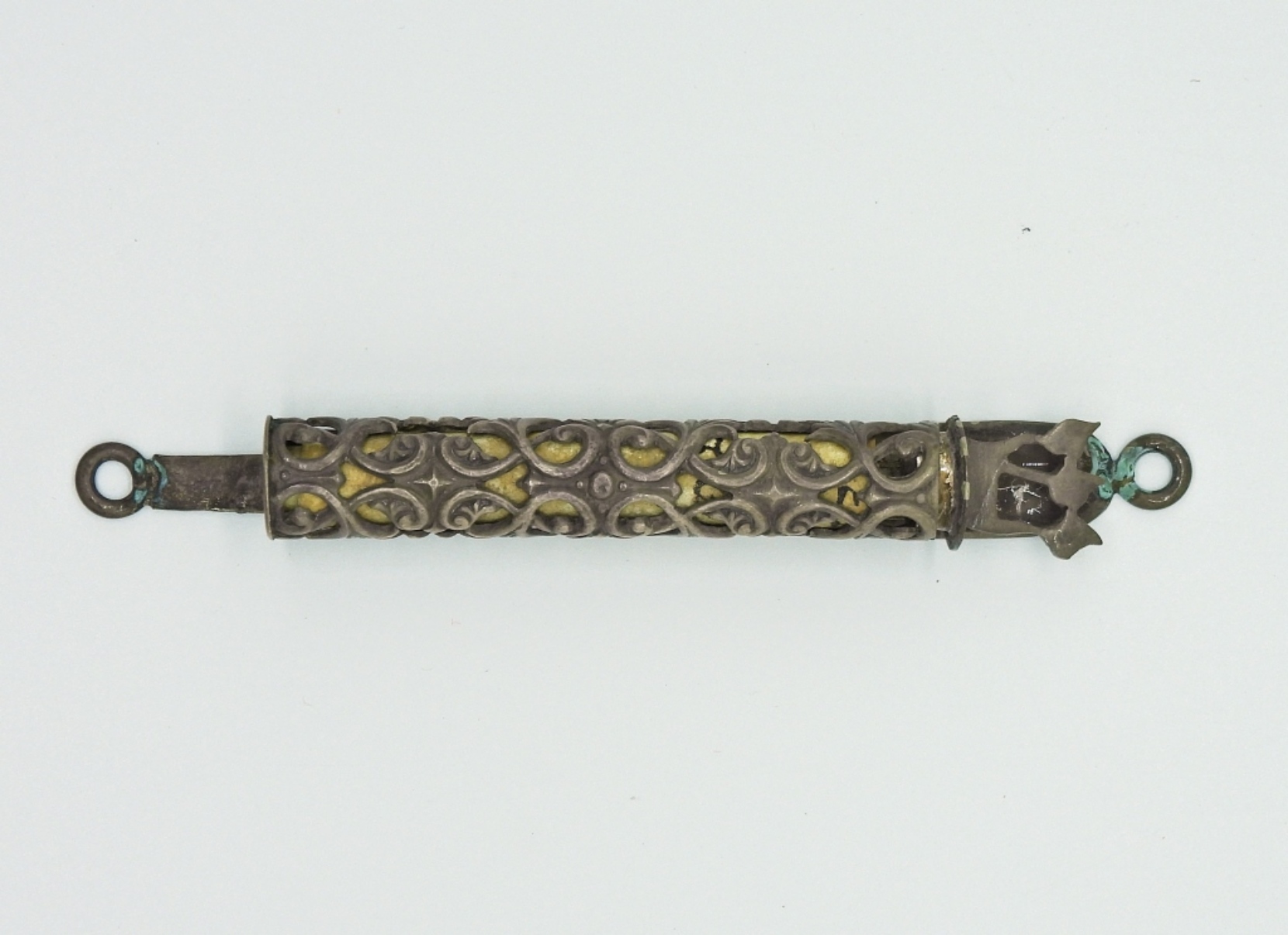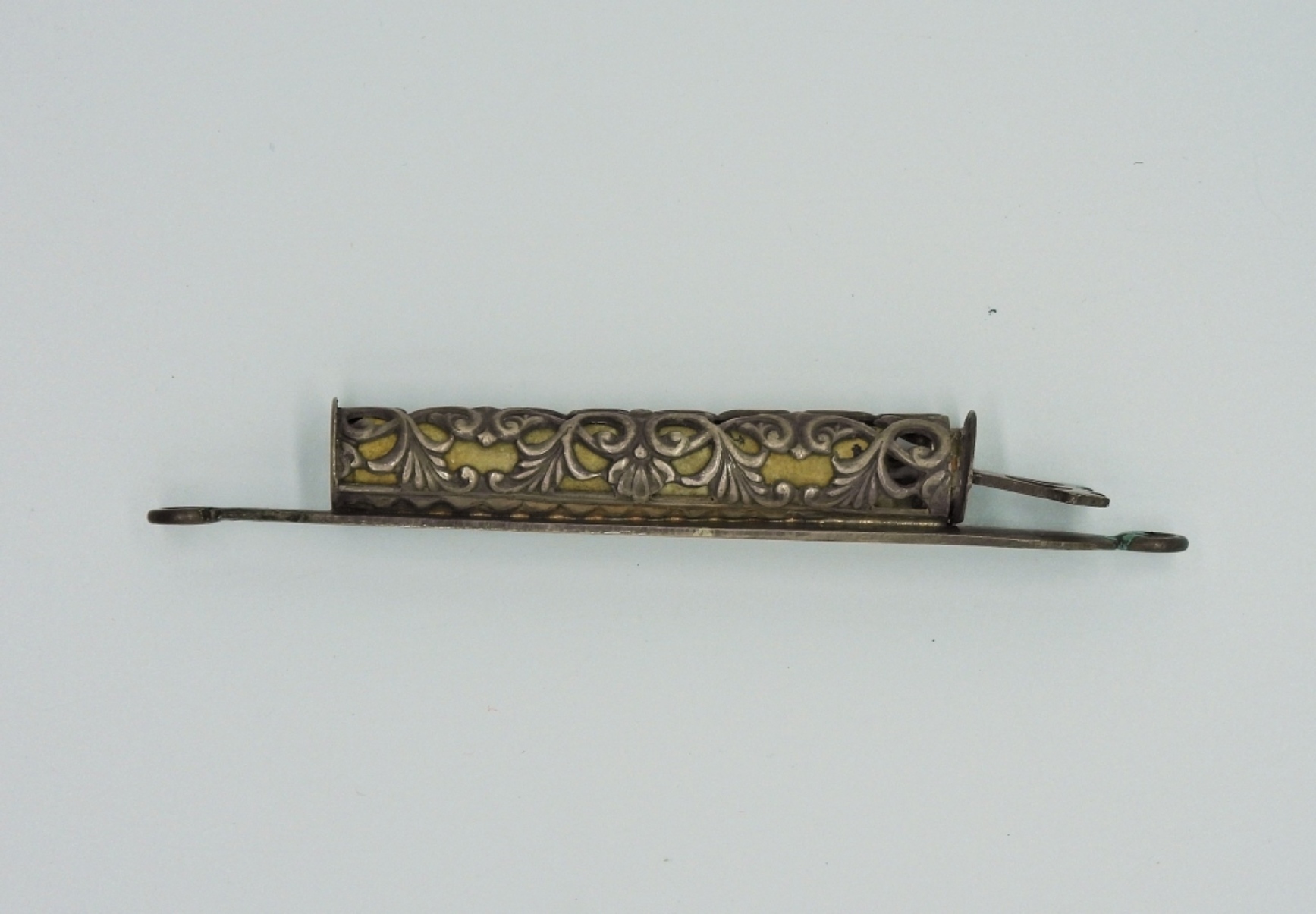 VINTAGE STERLING MEZUZAH YEMENITE – FILIGREE, HANDMADE. MEASURES 3.5″ LONG. PRINTED INSERT INSIDE. 10.7 DWT