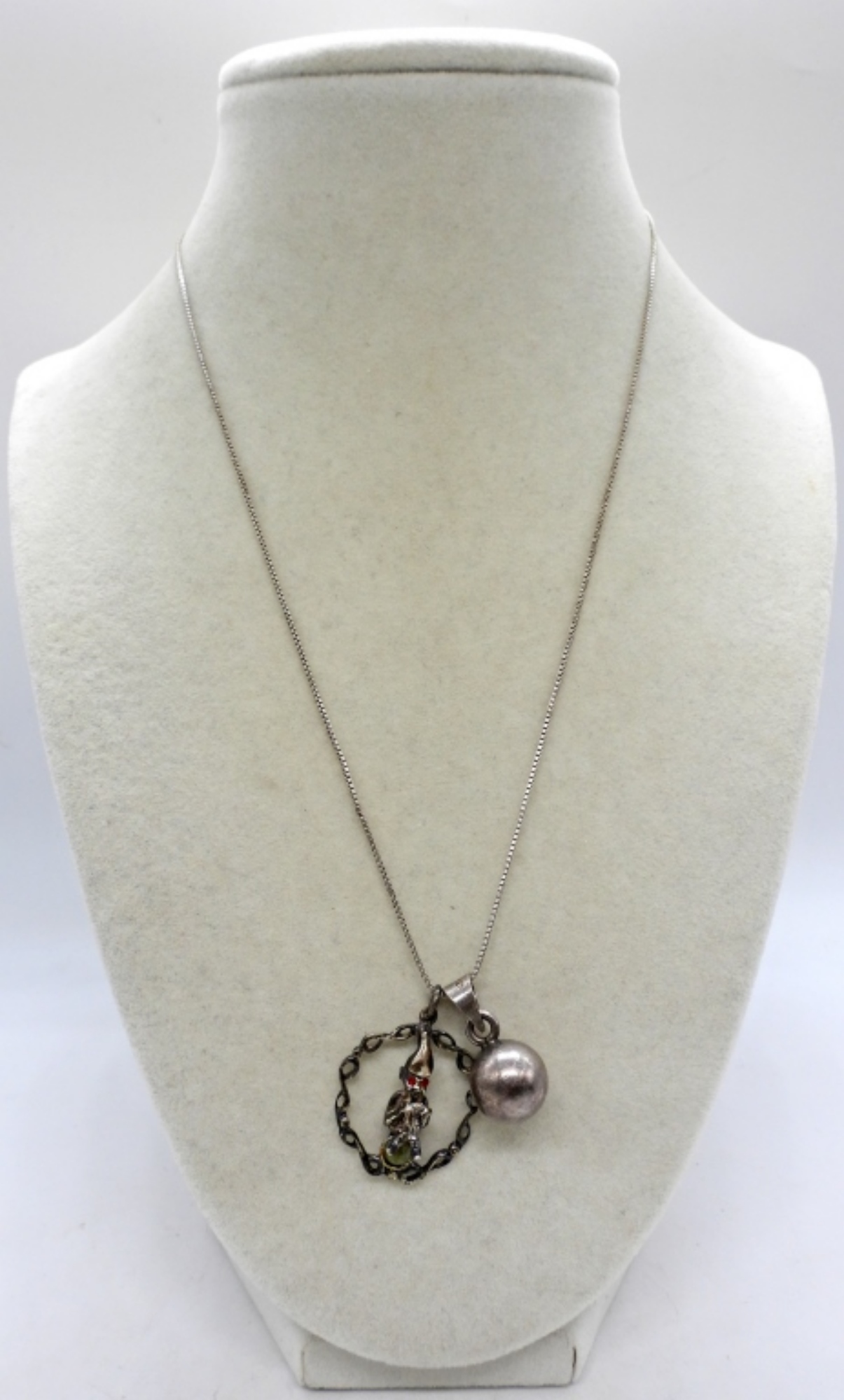 STERLING GNOME PENDANT AND TINY HARMONY BALL WITH AN 18″ STERLING CHAIN. 5.8 DWT