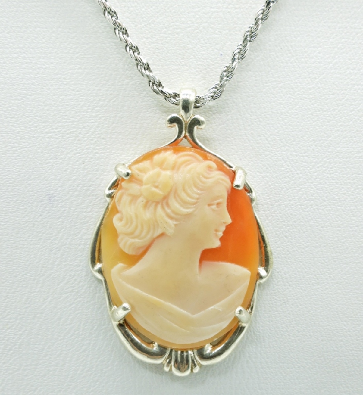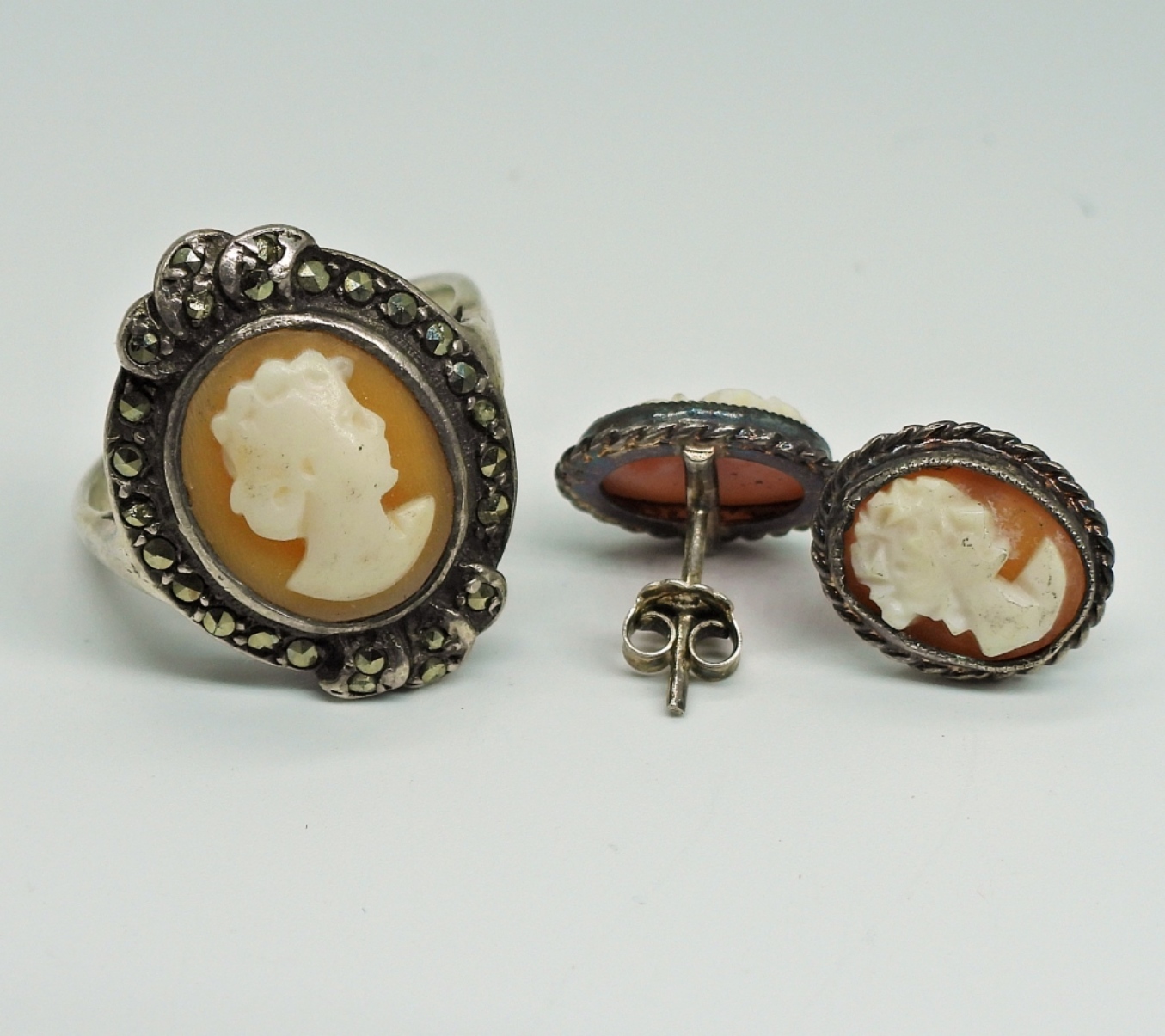 VINTAGE STERLING CAMEO RING (SIZE 6.5), EARRINGS AND NECKLACE ON AN 18″ STERLING CHAIN. 10 DWT