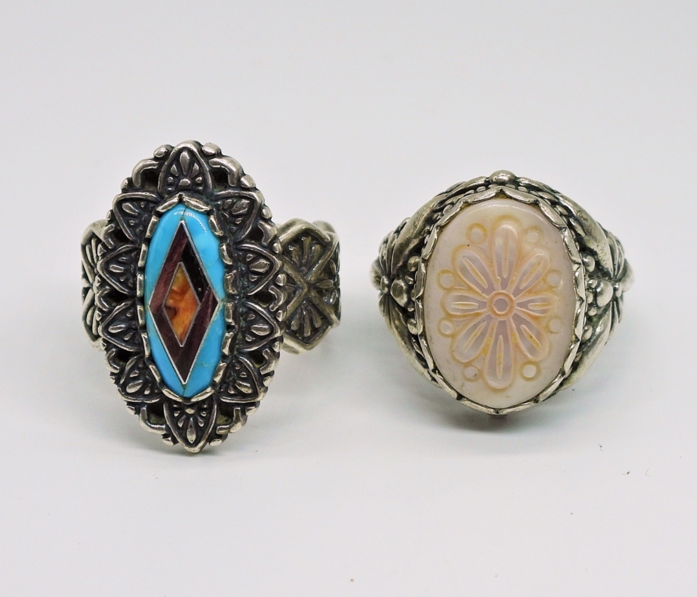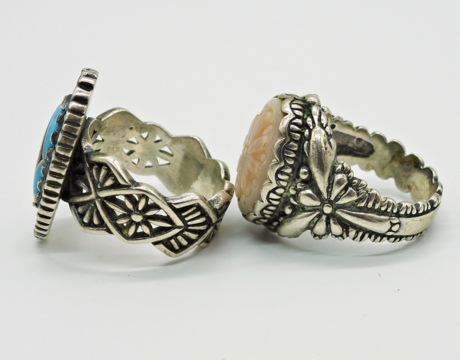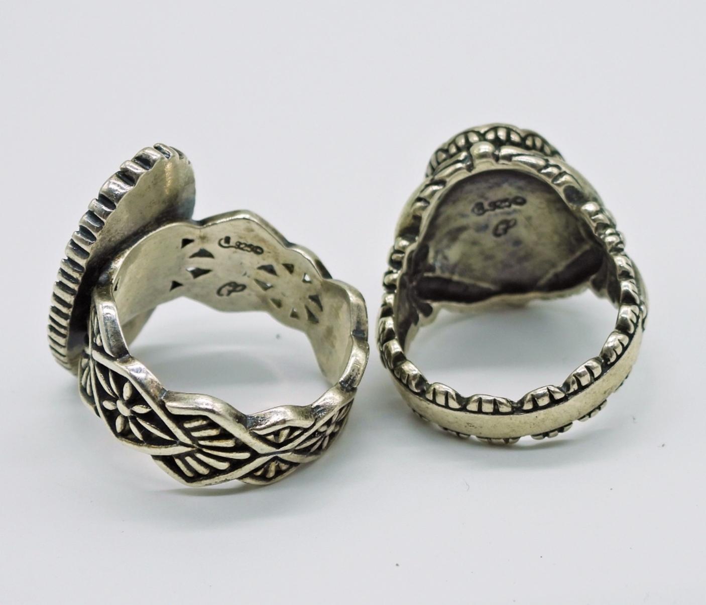 TWO VERY ORNATE STERLING RINGS WITH INCREDIBLE DETAILING! SIZES 9 & 10. 17.4 DWT