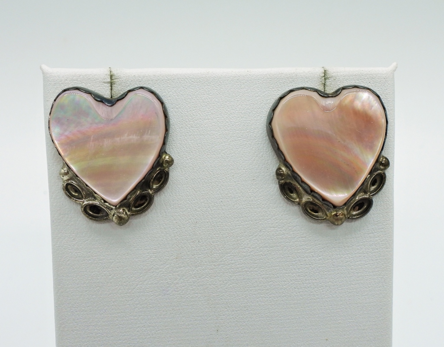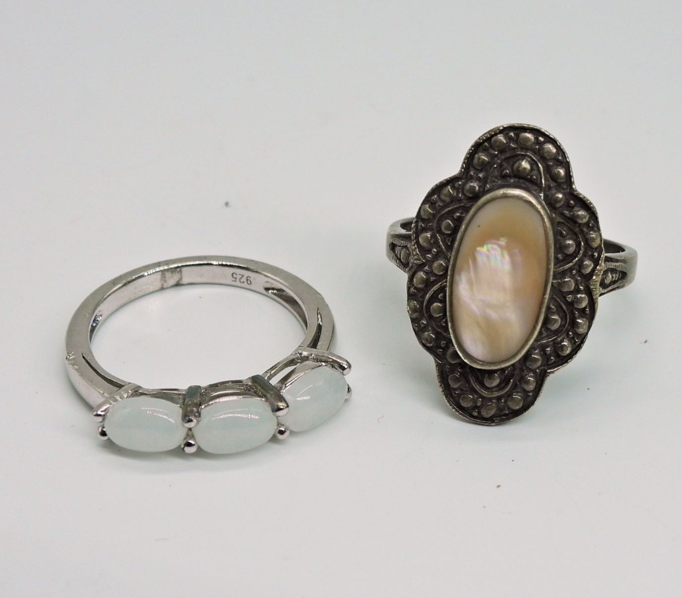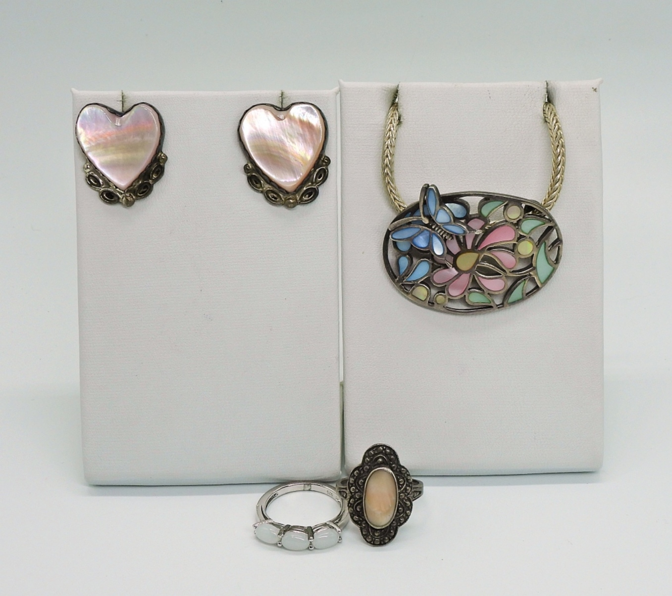 GORGEOUS COLOFRUL MOTHER OF PEARL NECKLACE, 16″ CHAIN. PINK MOTHER OF PEARL HEART EARRINGS, PINK MOTHER OF PEARL RING WITH MARCASITE, SIZE 7. WHITE CABOCHAN GEMSTONE RING, SIZE 6. 28.6 DWT