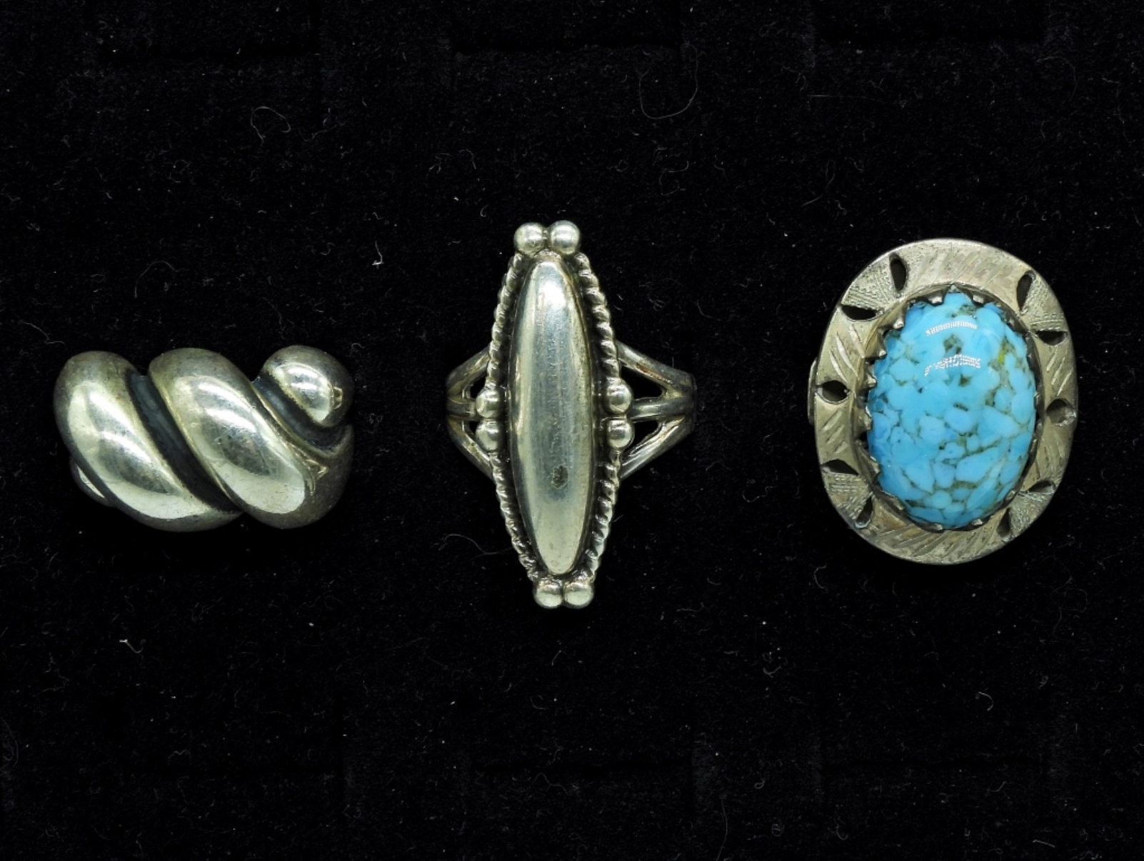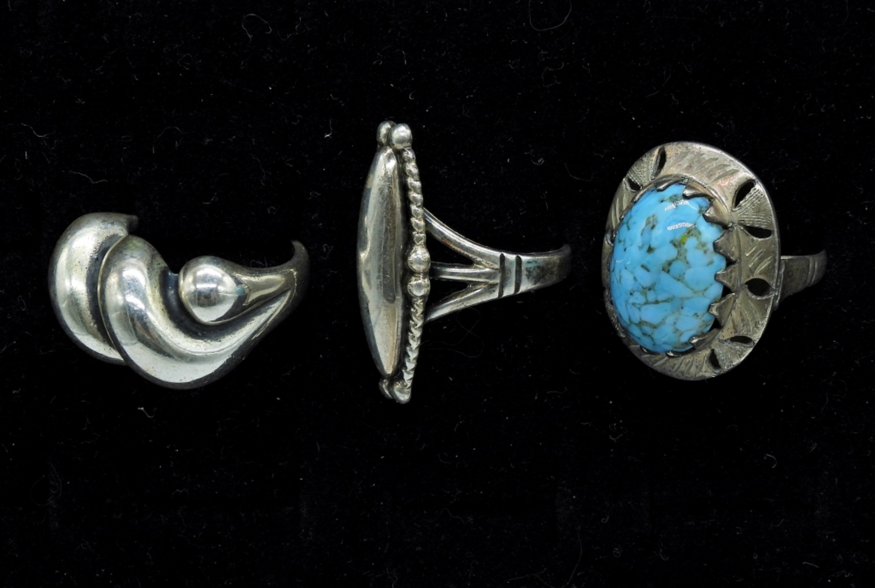 THREE VINTAGE STERLING RINGS, ONE WITH A BEAUTIFUL BLUE NATURAL GEMSTONE. TWO ARE SIZE 7, ONE IS SIZE 9. 19.7 DWT