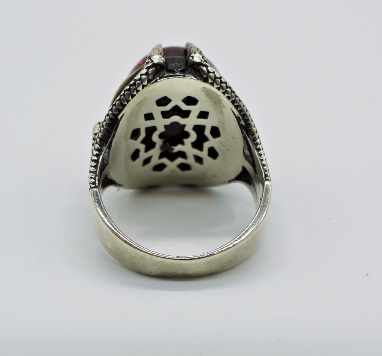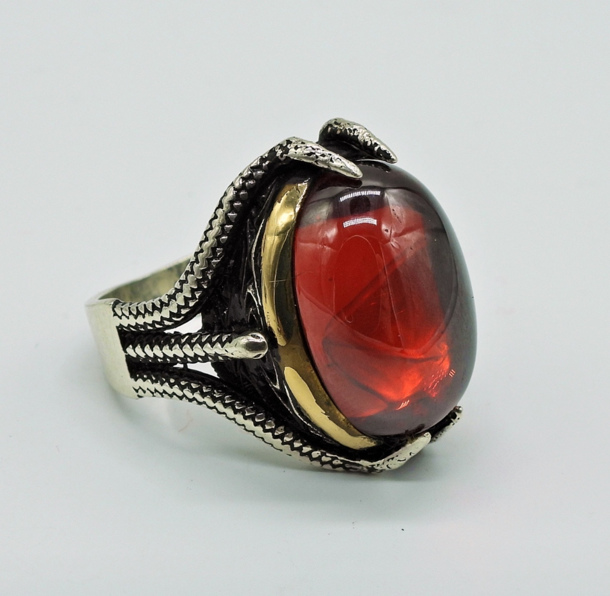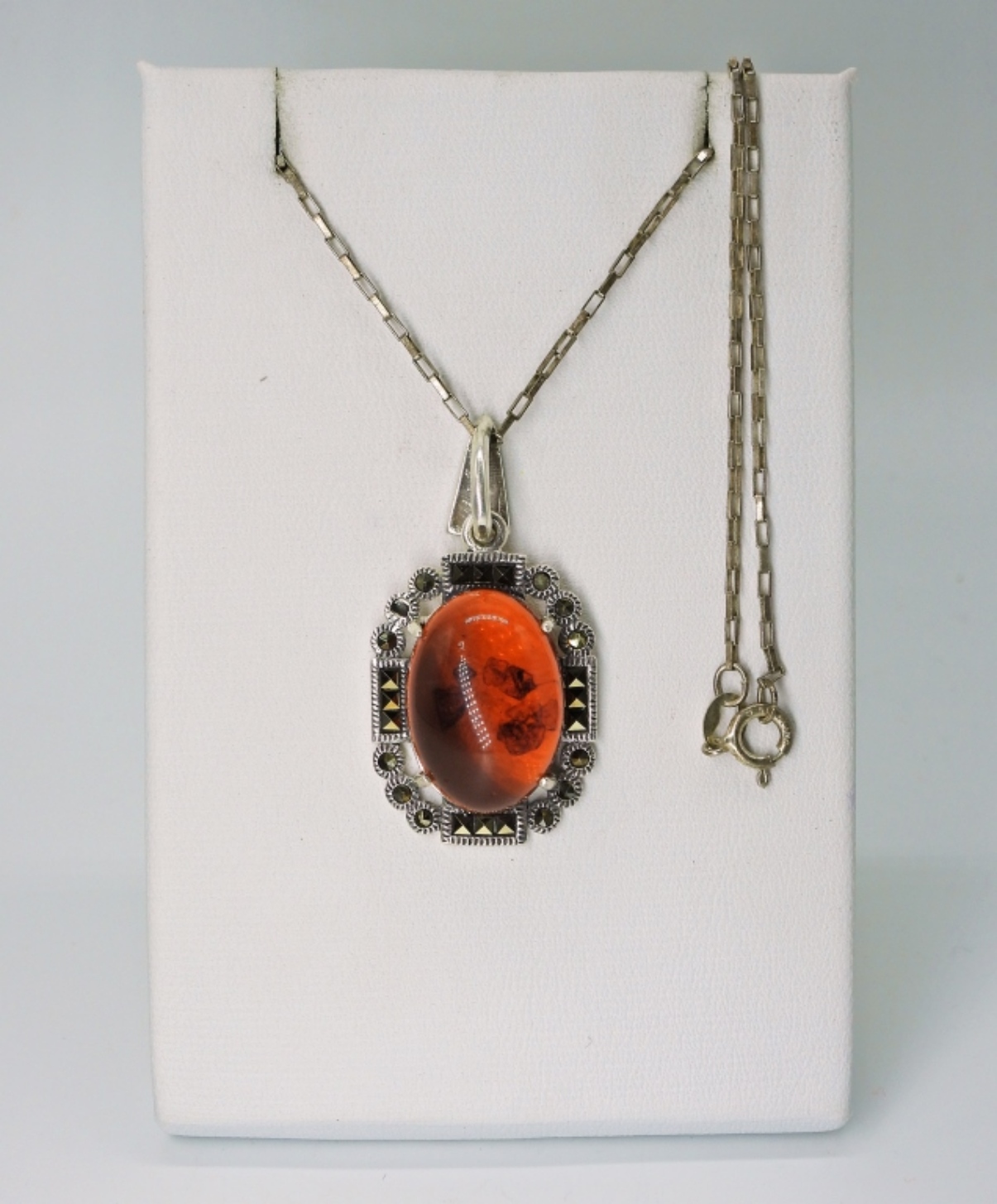 STERLING AMBER & MARCASITE NECKLACE, 18″. MARCASITE & STERLING EARRINGS. SIZE 10 STERLING RING WITH VERY LARGE RED GEMSTONE. 24 DWT