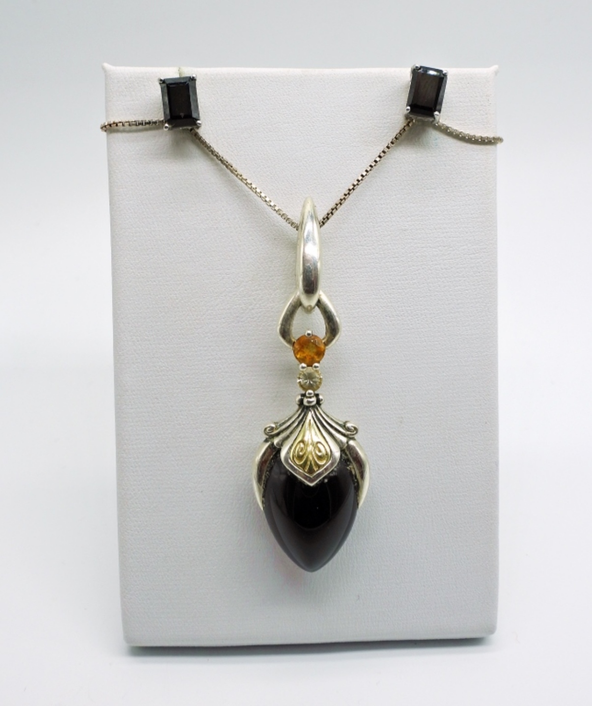 ANN KING STERLING / 18K ACCENT FAIRY TALE ONYX PENDANT ON A 16″ CHAIN. BLACK STUD EARRINGS AND A SILVER BRACELET (MARKED 999), 8″. 24.5 DWT