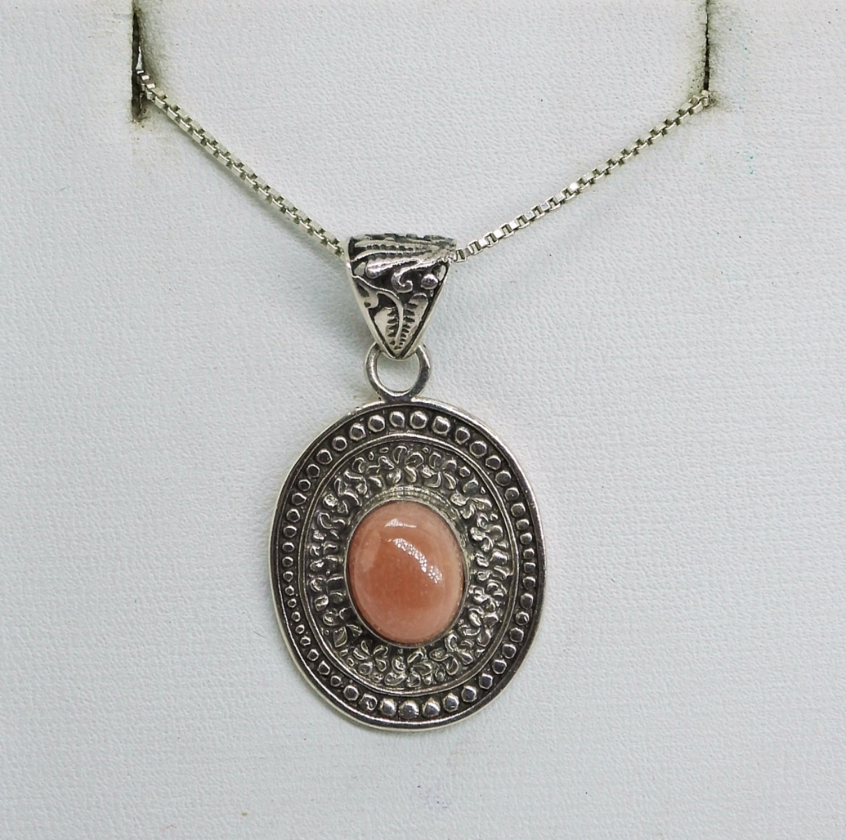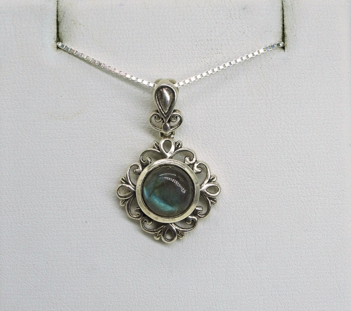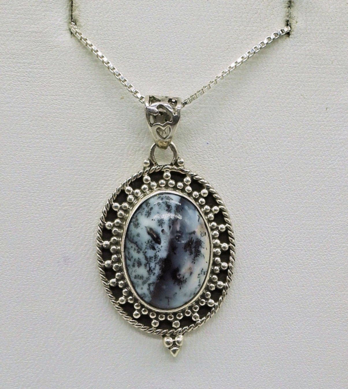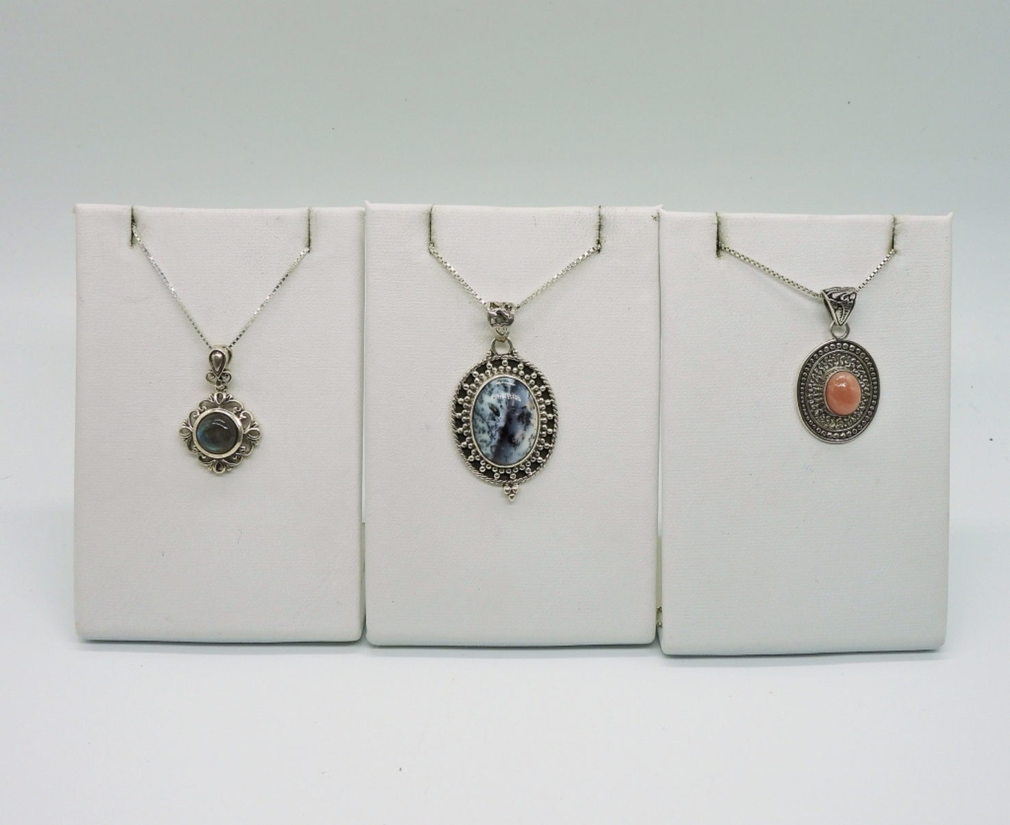 BLUE LABRODITE 925 PENDANT ON A STERLING 24″ ADJUSTABLE CHAIN. DENDRITE AGATE 925 PENDANT ON A STERLING 20″ CHAIN. ORANGE MOONSTONE STERLING PENDANT ON A 20″ STERLING CHAIN. 13.2 DWT
